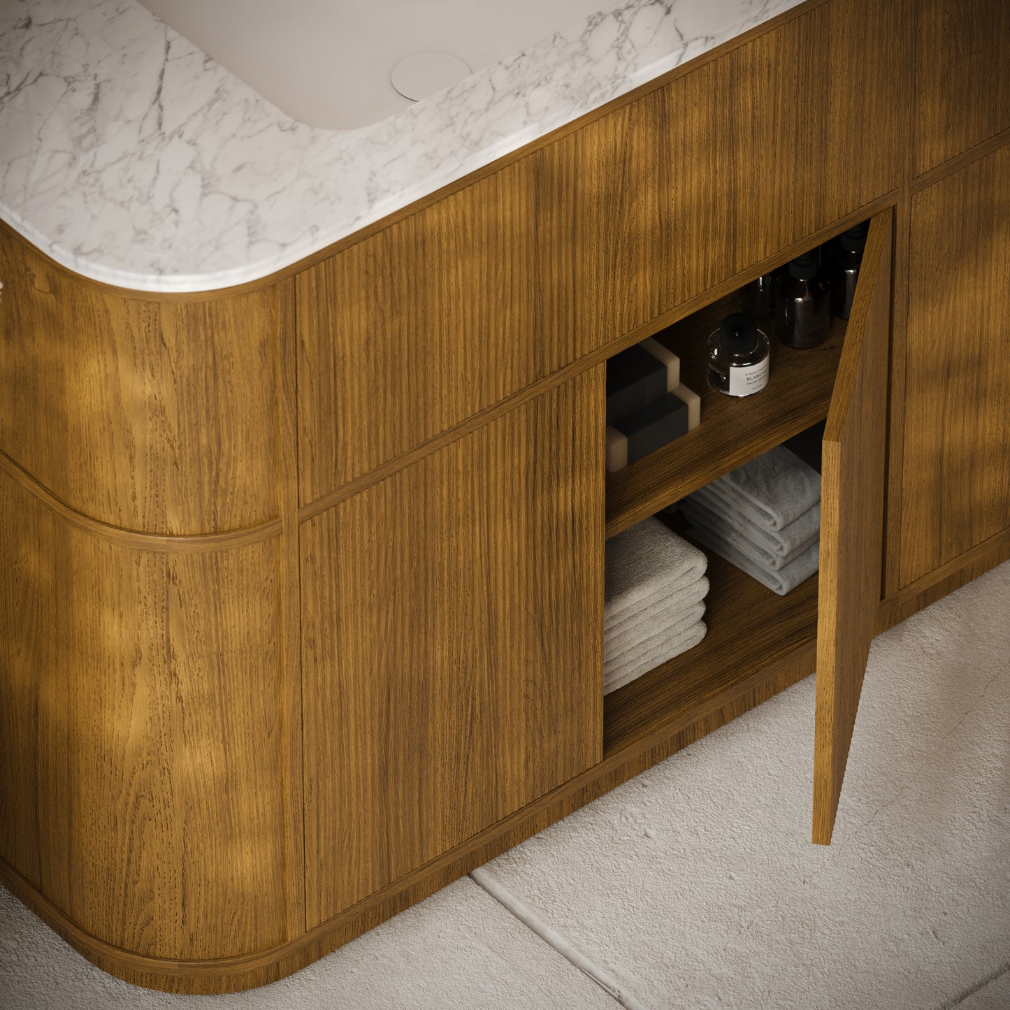 The vanity unit is crafted from solid FSC certified oak and is crowned with a countertop made from Italian Carrara - one of Italy’s finest marbles. Offering generous storage space, the unit also operates with soft closing doors for seamless functionality.