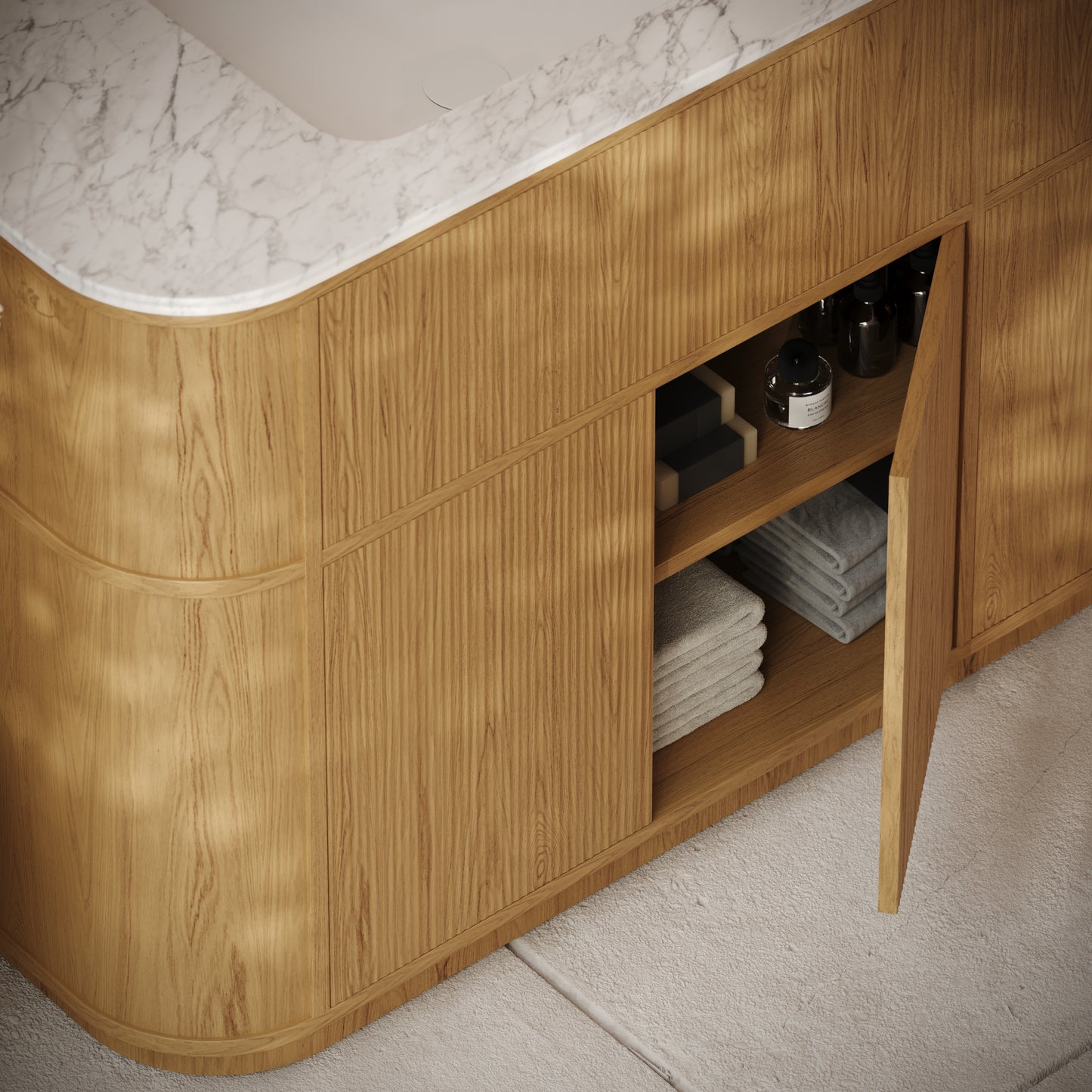 Perfect for couples or family bathrooms, the vanity unit is designed with practical double basins that are crafted from either our signature Cortese® stone composite or our Itallian Cararra marble, and features generous concealed storage to ensure uncluttered living. The vanity unit is available in an oak finish, which works beautifully with warm brassware shades such as brushed gold.