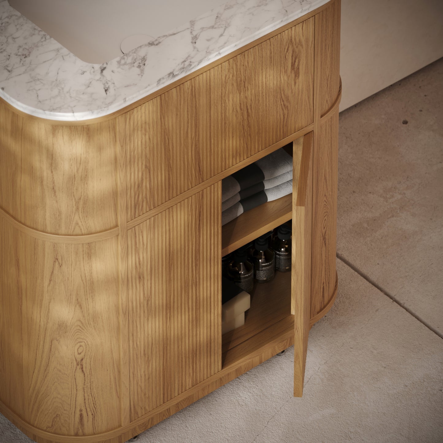 The floorstanding vanity unit, at 800mm wide, is expertly crafted from solid FSC certified wood and is defined by its soft curvaceous silhouette and built in either a matte white Cortese® stone, or an Italian Carrara marble. The oak is detailed with intricate fluted detailing, adding an element of tactility to the product. The vanity not only provides beauty for your bathroom, but also offers concealed storage for neat and uncluttered living. Extremely versatile, elevate your modern or traditional space with the Cheval vanity unit.