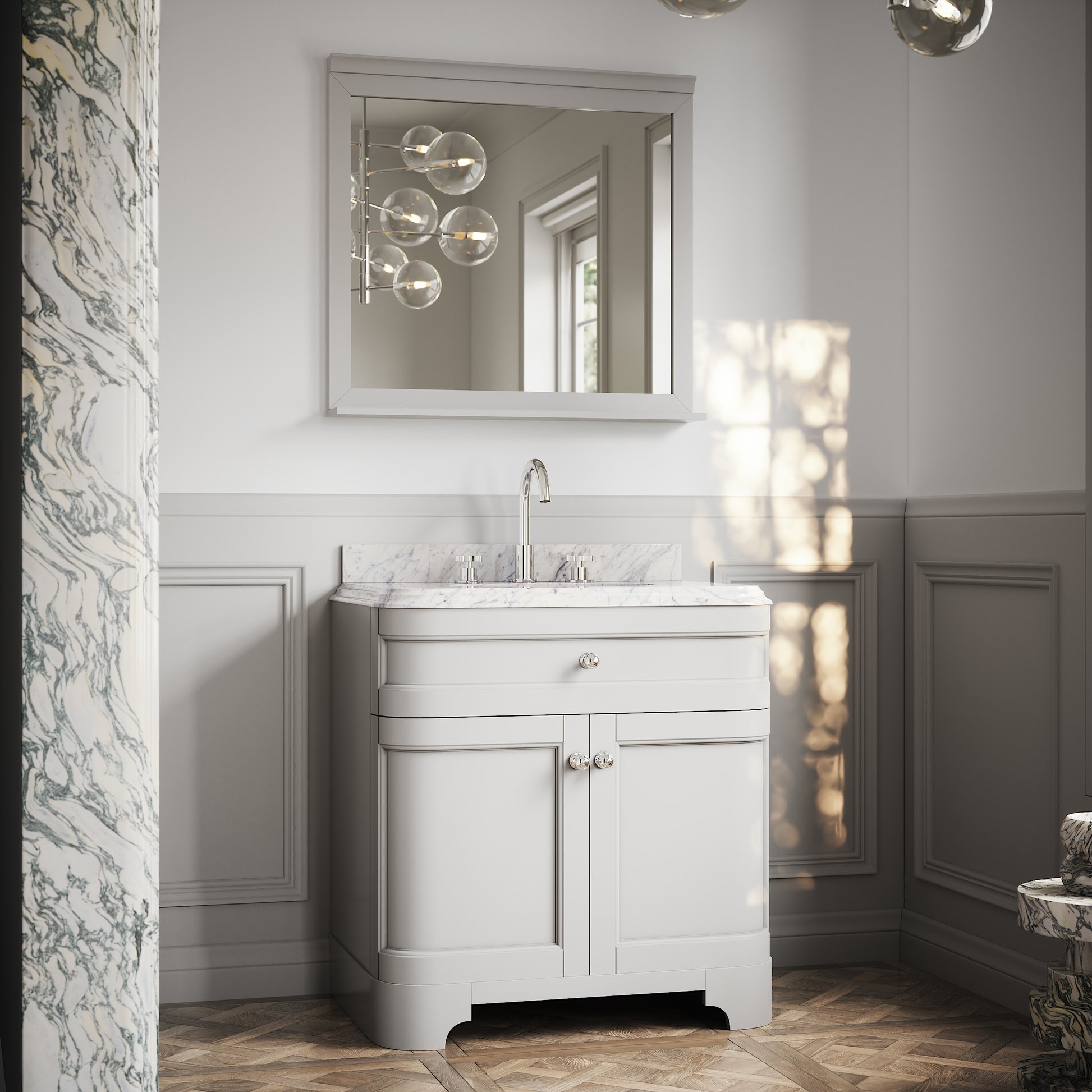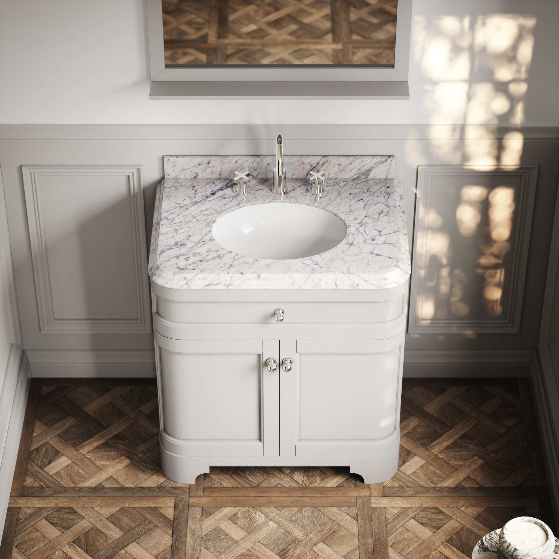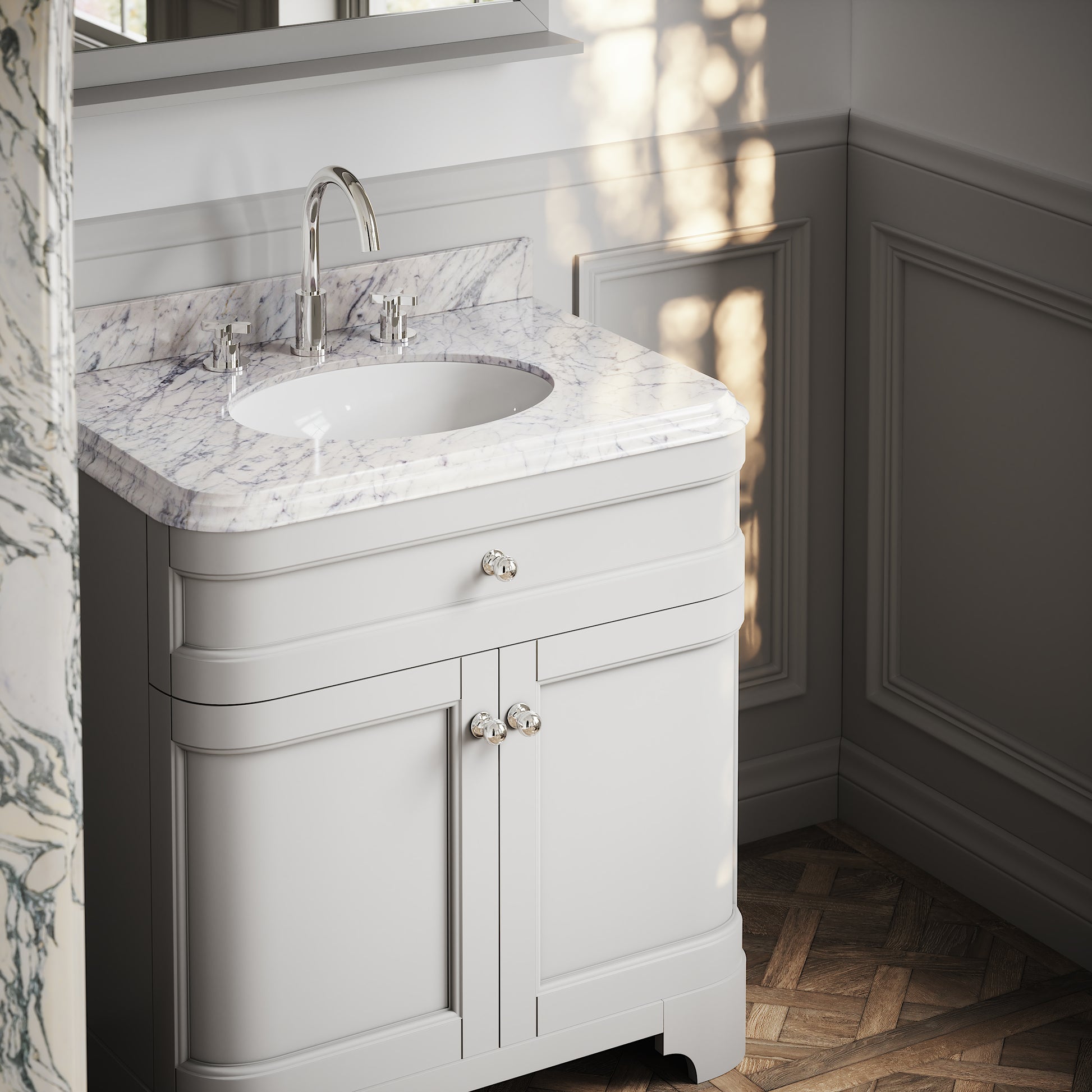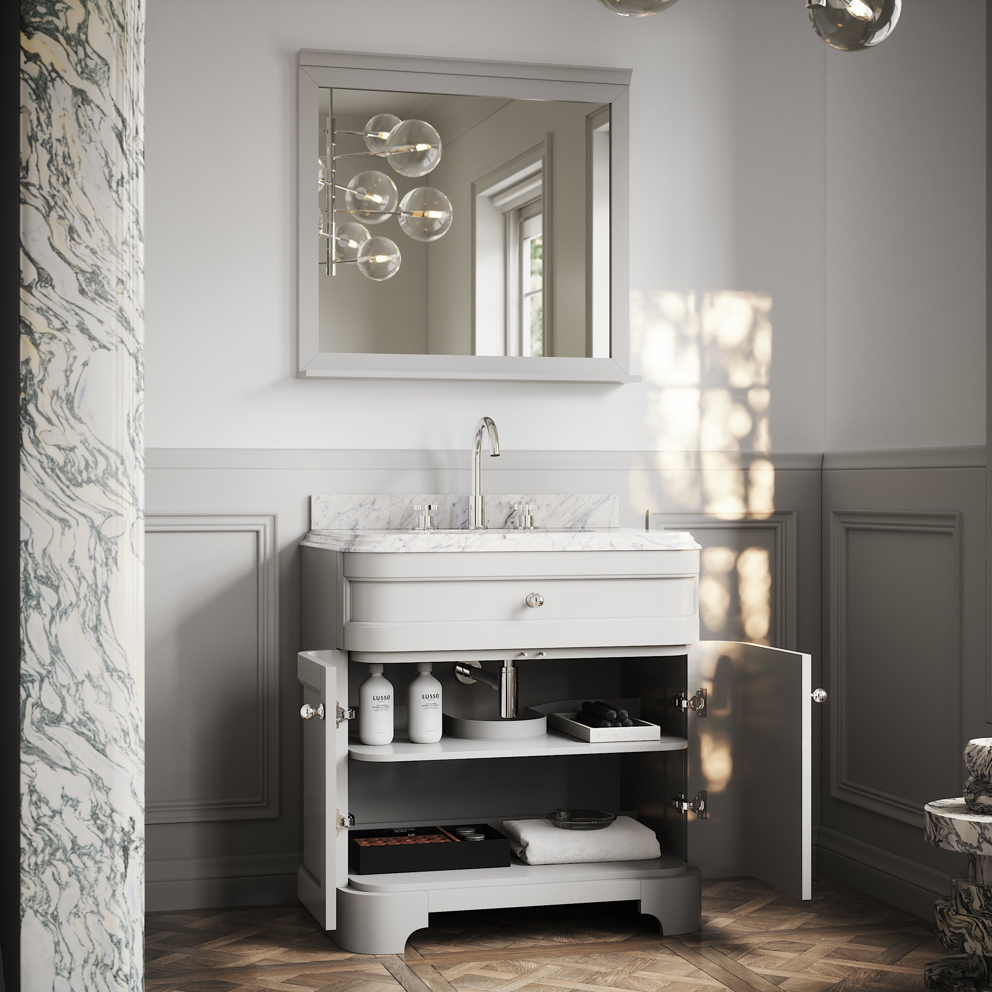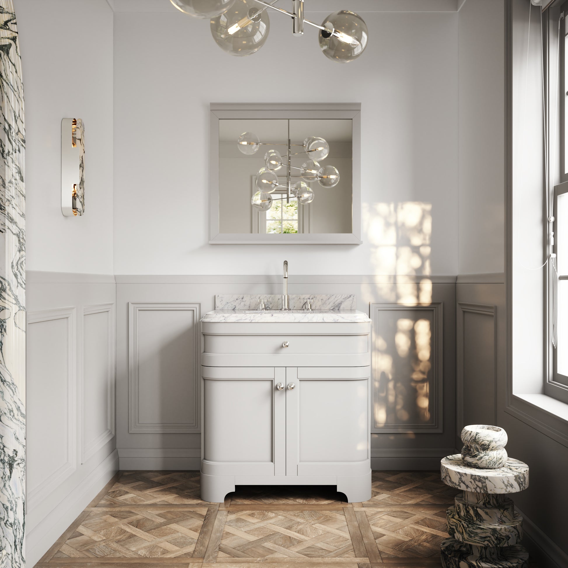 The Connaught Floorstanding Vanity Unit takes key notes from 1920s glamour, including beautiful cove ogee bevelling that’s displayed to the edges of the polished Carrara marble countertop. The countertop is finished with a traditional undermount oval basin.