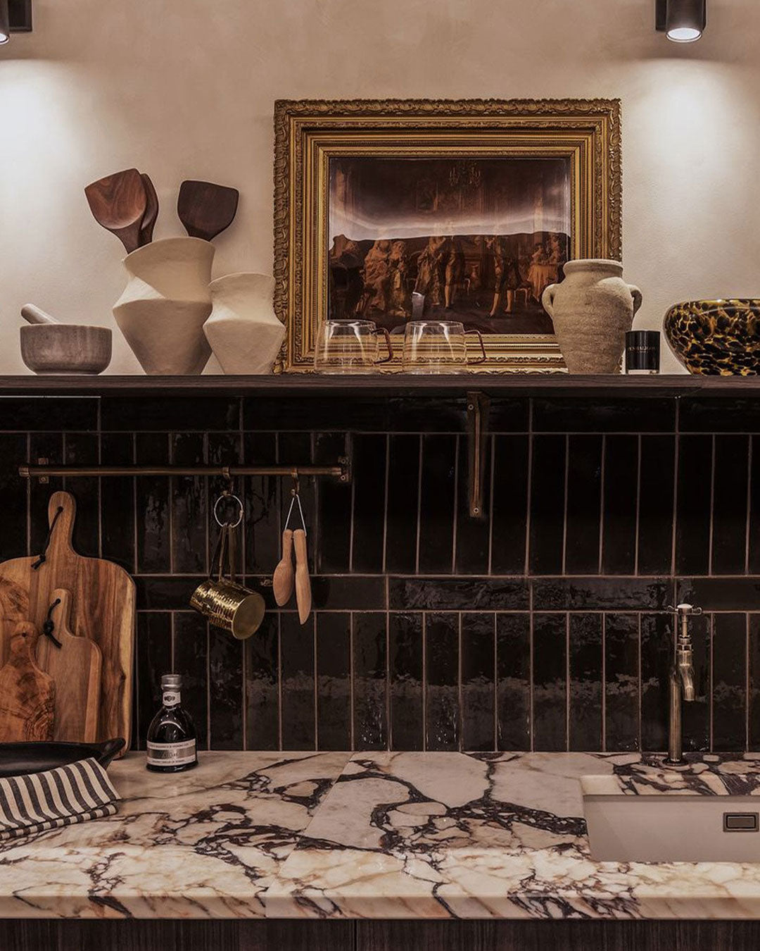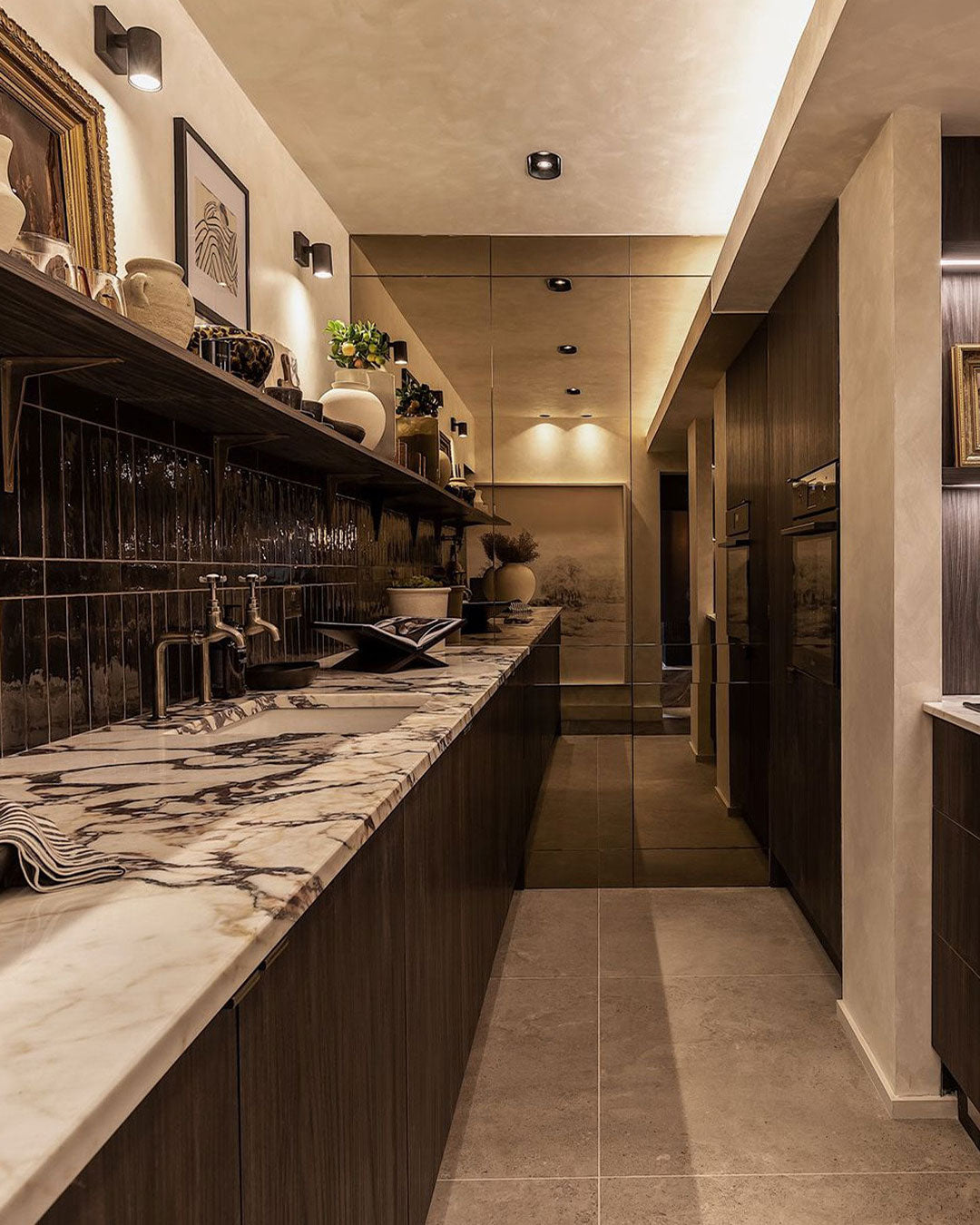 The galley kitchen mixes old and new design notes, resulting in an eclectic and luxurious feel.
