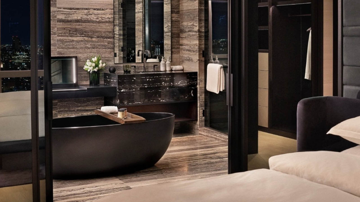 Those looking for an unparalleled city experience stay in the hotel’s penthouse suite, with floor to ceiling windows that maximise the breathtaking views of Hudson River and the New York skyline. As well as its own living room and a private dining area, the room is filled with features to ensure incredible comfort - a handmade mattress, Egyption cotton bedding, filtered air and water, sound-cancelling walls, blackout shades and its own flickering fireplace. In the suite’s spa-grade bathroom furnished with a mirrored dressing area, guests can enjoy a long, hot soak in the room’s most striking feature - the Vetrina freestanding bath from our Lusso stone collection. Chosen by Rockwell Group’s design team, the Vetrina’s deep curves, smooth matte black finish and contemporary shape works beautifully with the hotel’s aesthetic, and provides the ultimate luxury experience for high-performance living.