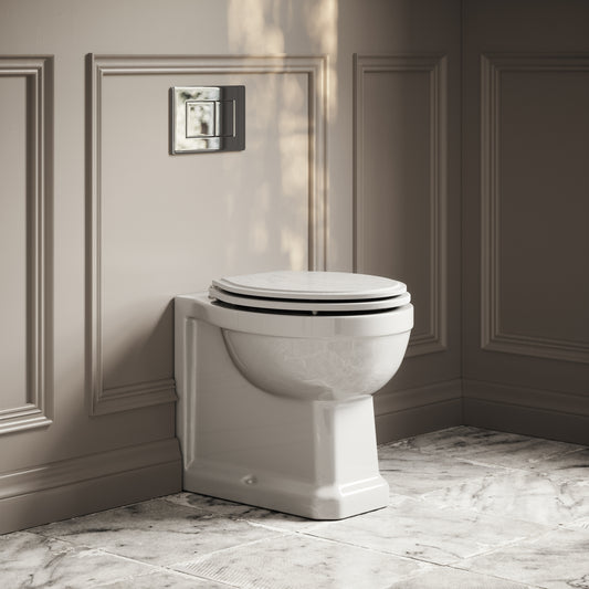 Portland Back To Wall Traditional Toilet With Solid Oak Matte White Seat with Concealed Cistern and Chrome Flush PlateRegular price £587.00 GBP (£489.17 EX VAT)Sale price £587.00 GBP (£489.17 EX VAT)Unit price perRegular price £587.00 GBP (£489.17 EX VAT)Sale price £587.00 GBP (£489.17 EX VAT)Unit price per