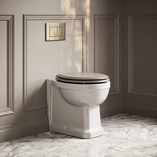 Portland Back To Wall Traditional Toilet With Solid Oak Velvet Beige Seat with Concealed Cistern and Brushed Gold Flush PlateRegular price £597.00 GBP (£497.50 EX VAT)Sale price £597.00 GBP (£497.50 EX VAT)Unit price perRegular price £597.00 GBP (£497.50 EX VAT)Sale price £597.00 GBP (£497.50 EX VAT)Unit price per
