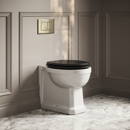 Portland Back To Wall Traditional Toilet With Solid Oak Matte Black Seat with Concealed Cistern and Brushed Gold Flush PlateRegular price £587.00 GBP (£489.17 EX VAT)Sale price £587.00 GBP (£489.17 EX VAT)Unit price perRegular price £587.00 GBP (£489.17 EX VAT)Sale price £587.00 GBP (£489.17 EX VAT)Unit price per