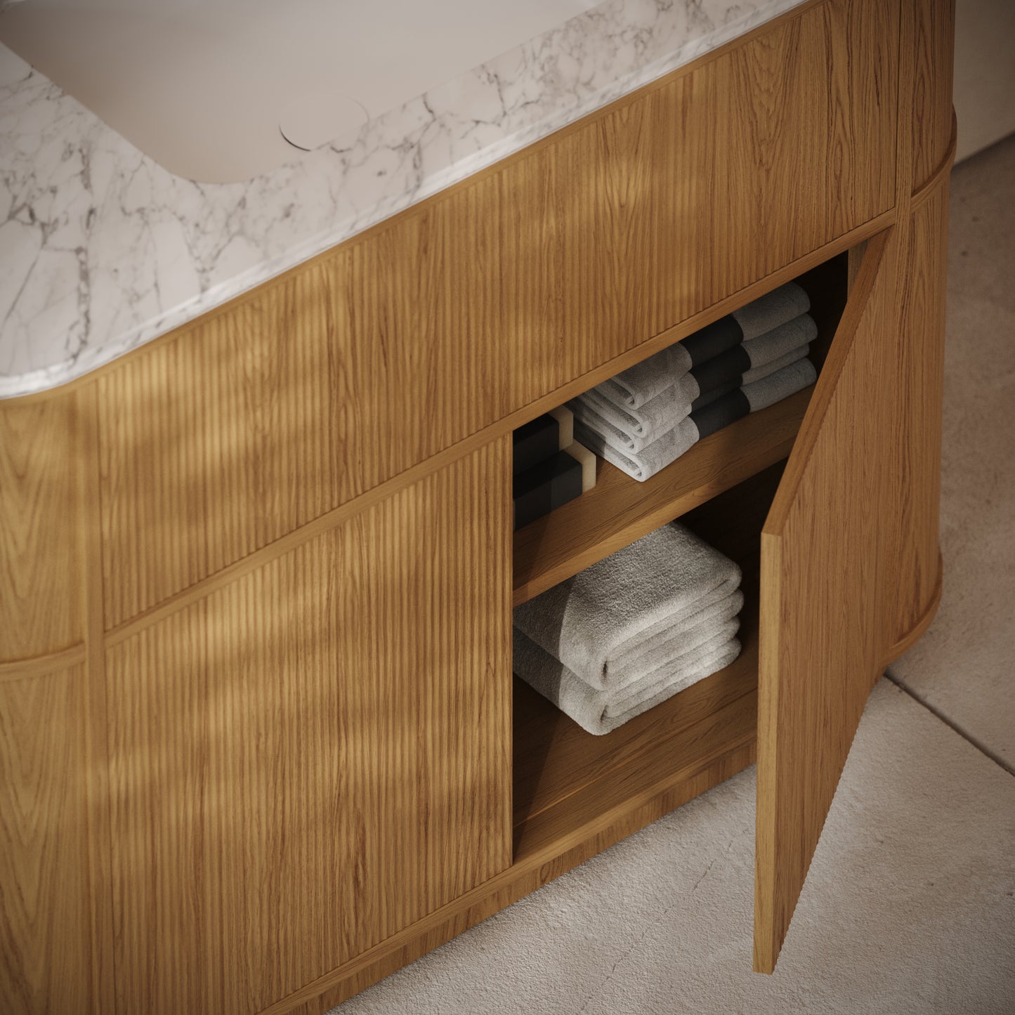 The solid oak surface of the vanity beautifully transitions from smooth wood to fluted wood, which contrasts beautifully with either a solid marble countertop crafted from luxury Italian Carrara marble, or soft matte white Cortese® stone. Complete with a built-in basin and functional soft closing doors, the vanity offers a striking statement for any modern or traditional interior while serving its purpose as a practical bathroom item.
