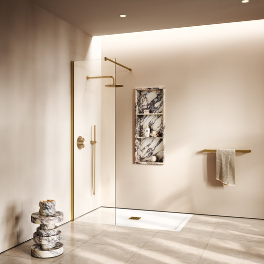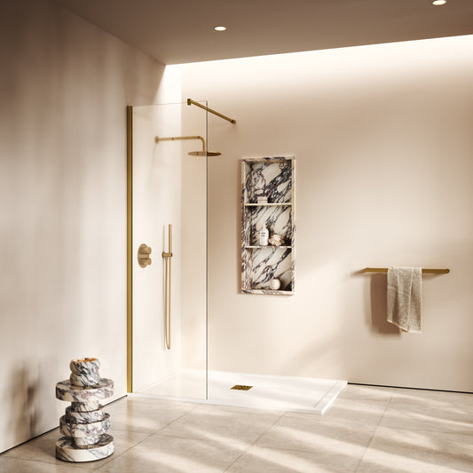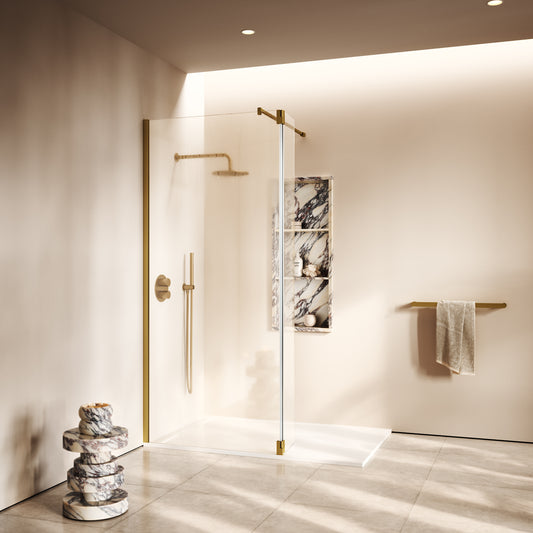 Opulence Brushed Gold Complete Walk In Shower Enclosure - KIT A - All SizesRegular price From £1,097.00 (£914.17 EX VAT)Sale price From £1,097.00 (£914.17 EX VAT)Unit price perRegular price From £1,097.00 (£914.17 EX VAT)Sale price From £1,097.00 (£914.17 EX VAT)Unit price per