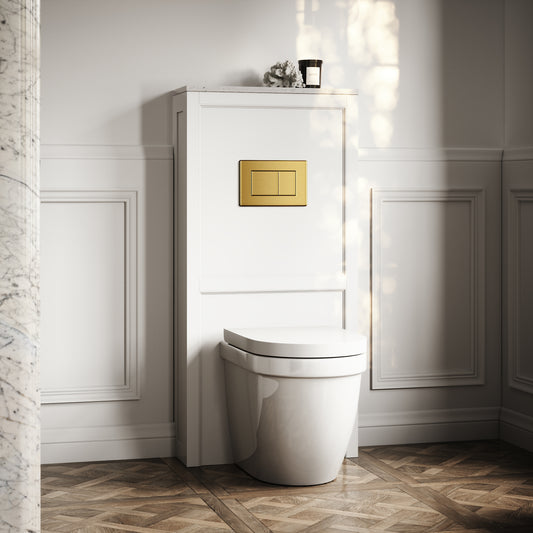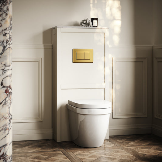 Senza Wall Hung Rimless Toilet with Concealed Cistern Frame and Brushed Gold Flush PlateRegular price £597.00 GBP (£497.50 EX VAT)Sale price £597.00 GBP (£497.50 EX VAT)Unit price perRegular price £597.00 GBP (£497.50 EX VAT)Sale price £597.00 GBP (£497.50 EX VAT)Unit price per