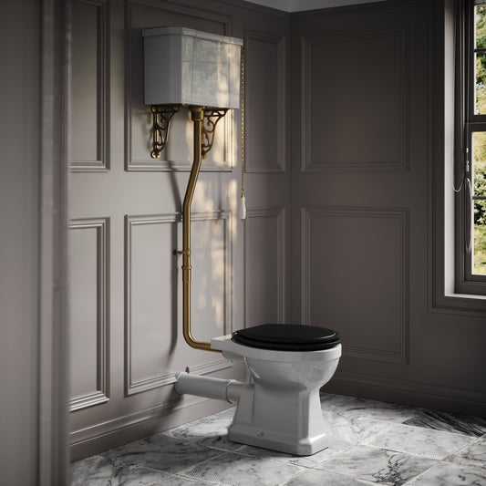 Portland High Level Traditional Toilet with Solid Oak Matte Black seat (Brushed Gold Fittings)Regular price £697.00 GBP (£580.83 EX VAT)Sale price £697.00 GBP (£580.83 EX VAT)Unit price perRegular price £697.00 GBP (£580.83 EX VAT)Sale price £697.00 GBP (£580.83 EX VAT)Unit price per