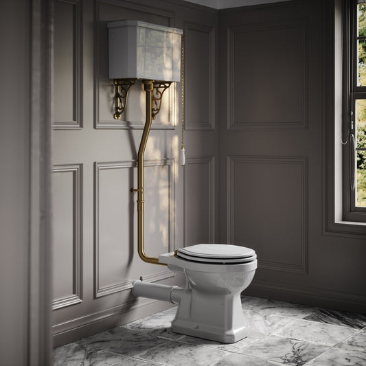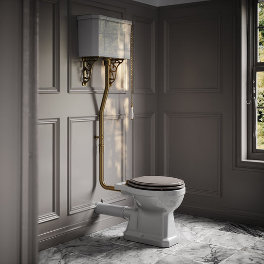 Portland High Level Traditional Toilet with Solid Oak Matte White seat (Brushed Gold Fittings)Regular price £697.00 GBP (£580.83 EX VAT)Sale price £697.00 GBP (£580.83 EX VAT)Unit price perRegular price £697.00 GBP (£580.83 EX VAT)Sale price £697.00 GBP (£580.83 EX VAT)Unit price per