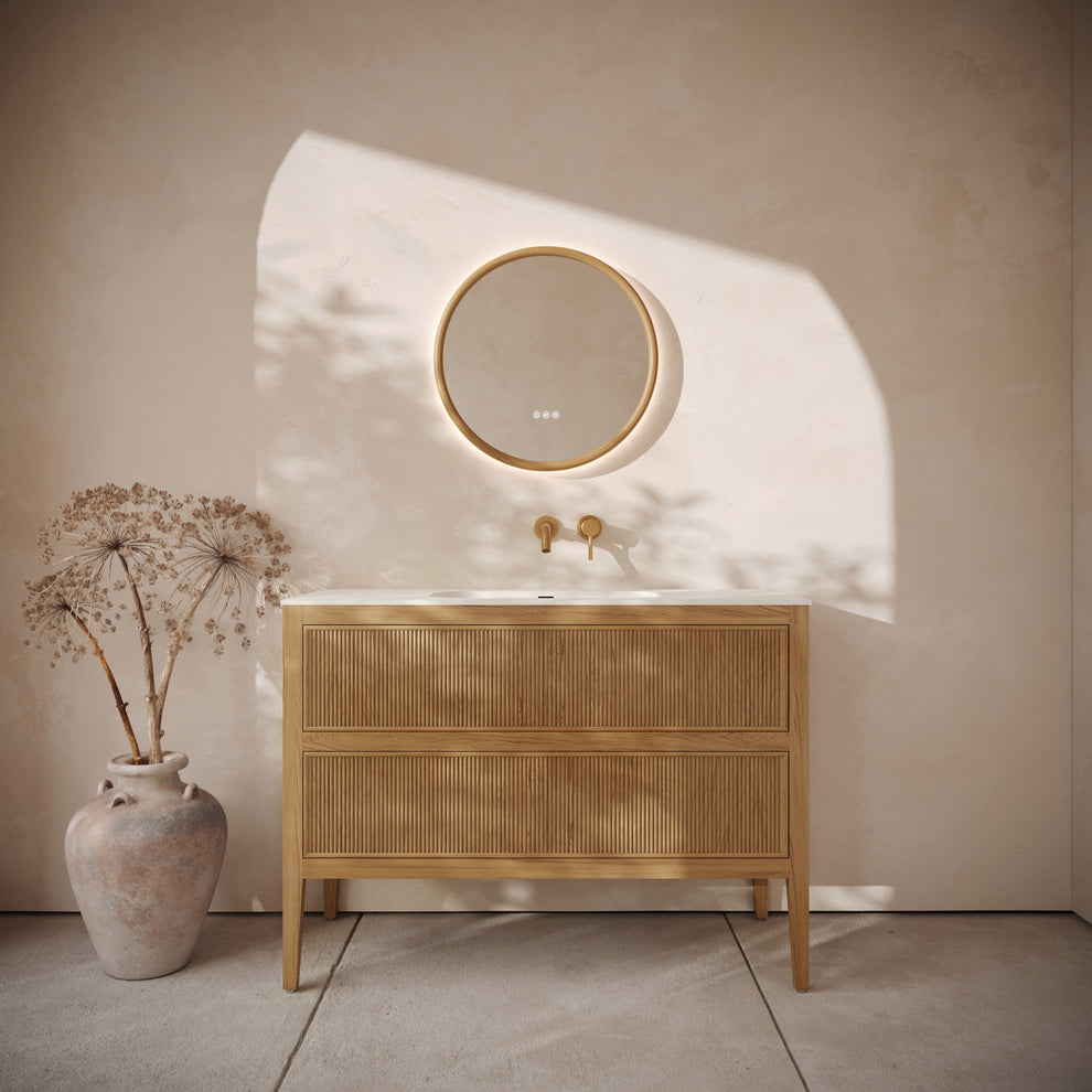 Defined by elegant fluted woodwork and a practical built-in basin, the vanity unit is the perfect storage solution for your space, with concealed drawers that are operative with soft closing doors. The vanity unit is crafted from premium grade materials, including FSC certified wood and a matte white Cortese® stone basin and is 1200mm wide, making it suitable for a wide range of bathrooms.