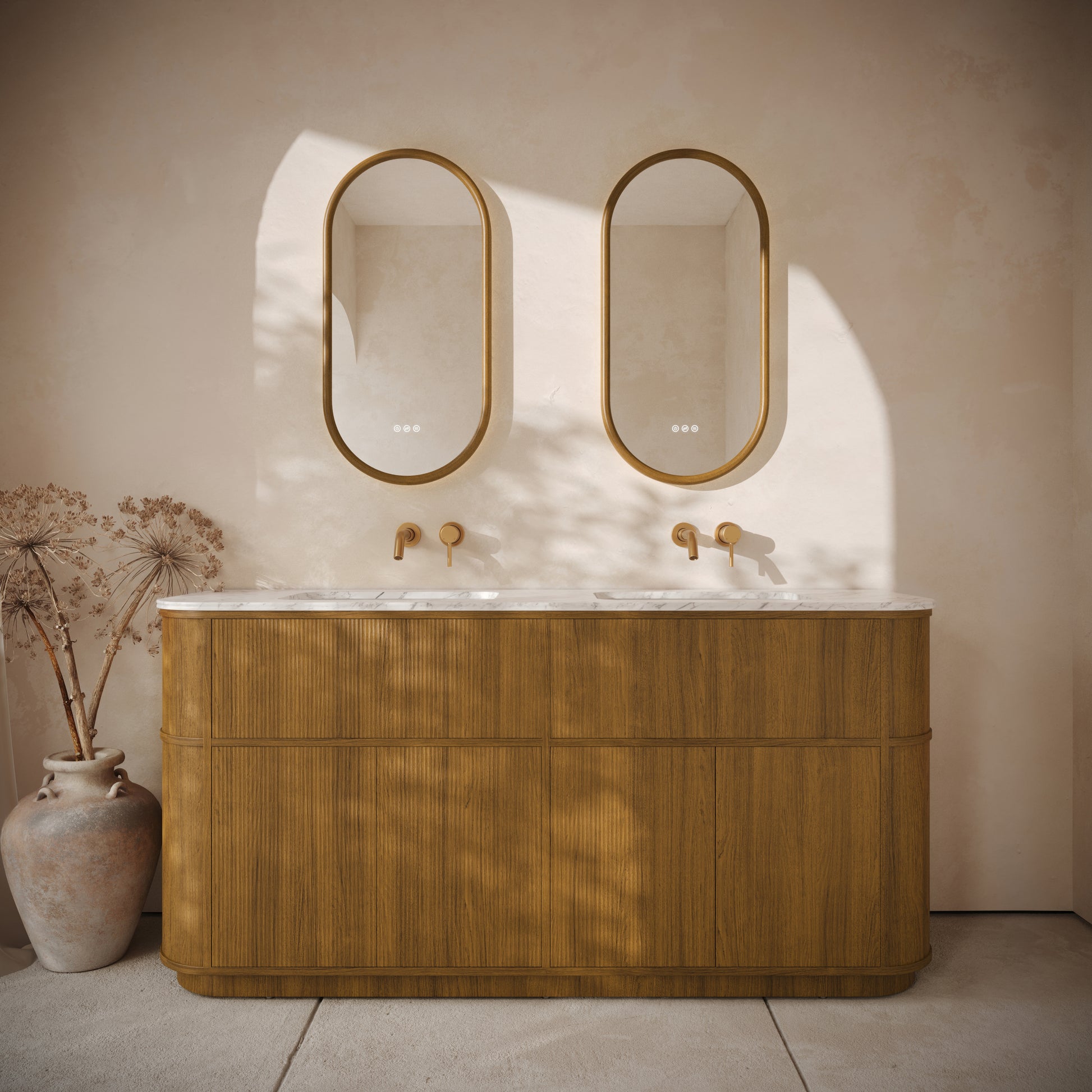 At 1800mm wide, the Cheval Honey Oak Floorstanding Vanity Unit is the perfect piece for couples or family bathrooms, featuring double built-in basins crafted from either Italian Carrara marble or our signature Cortese® stone.