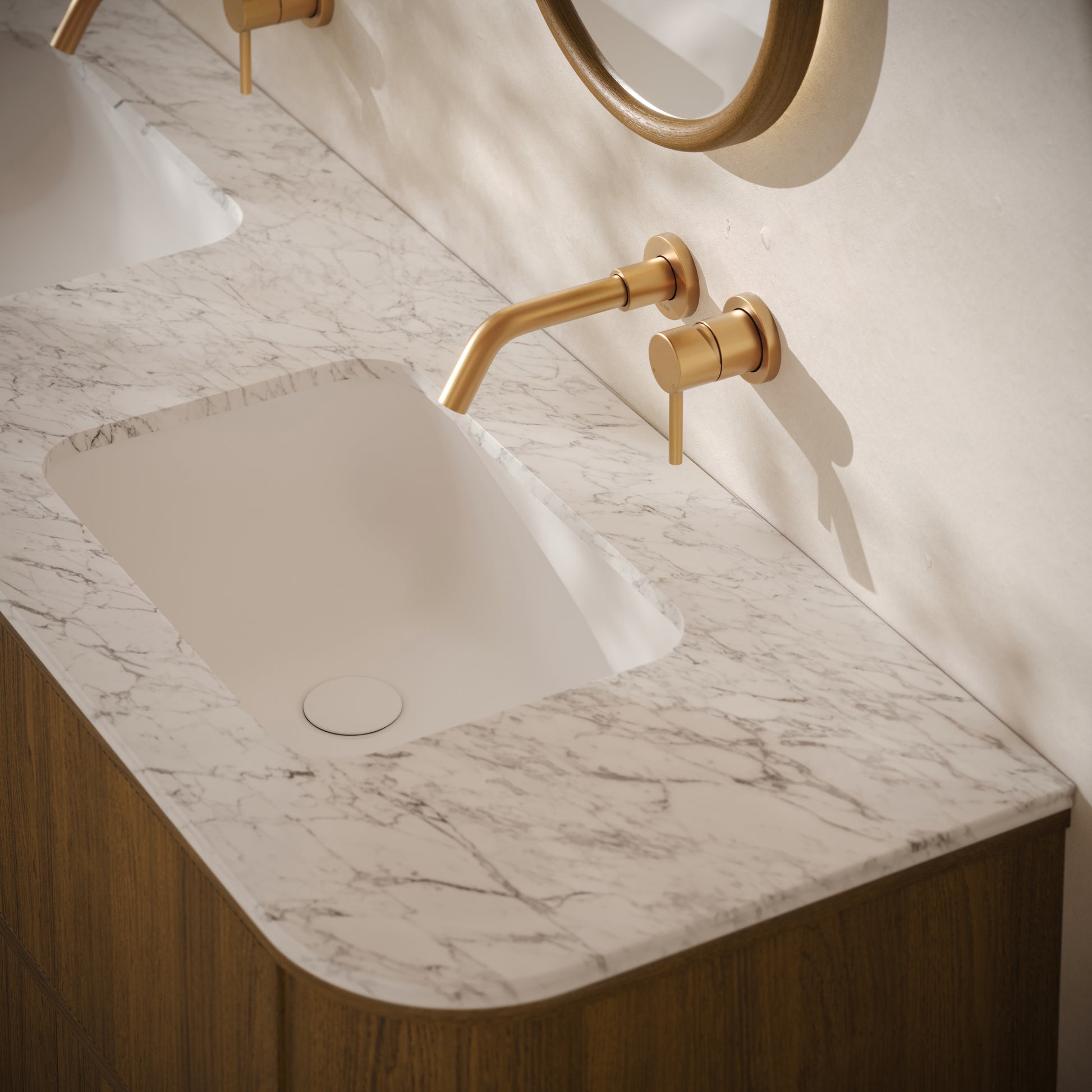 In the warm honey oak shade, the vanity unit can be styled with brushed gold brassware from the Lusso collection, including taps, accessories, and hardware.