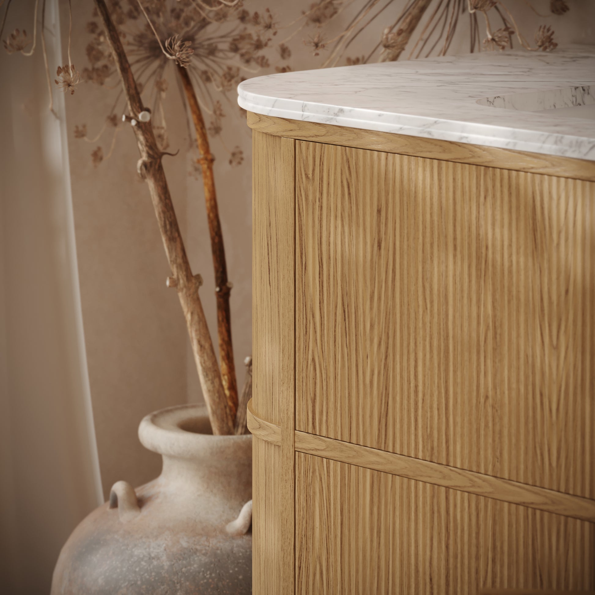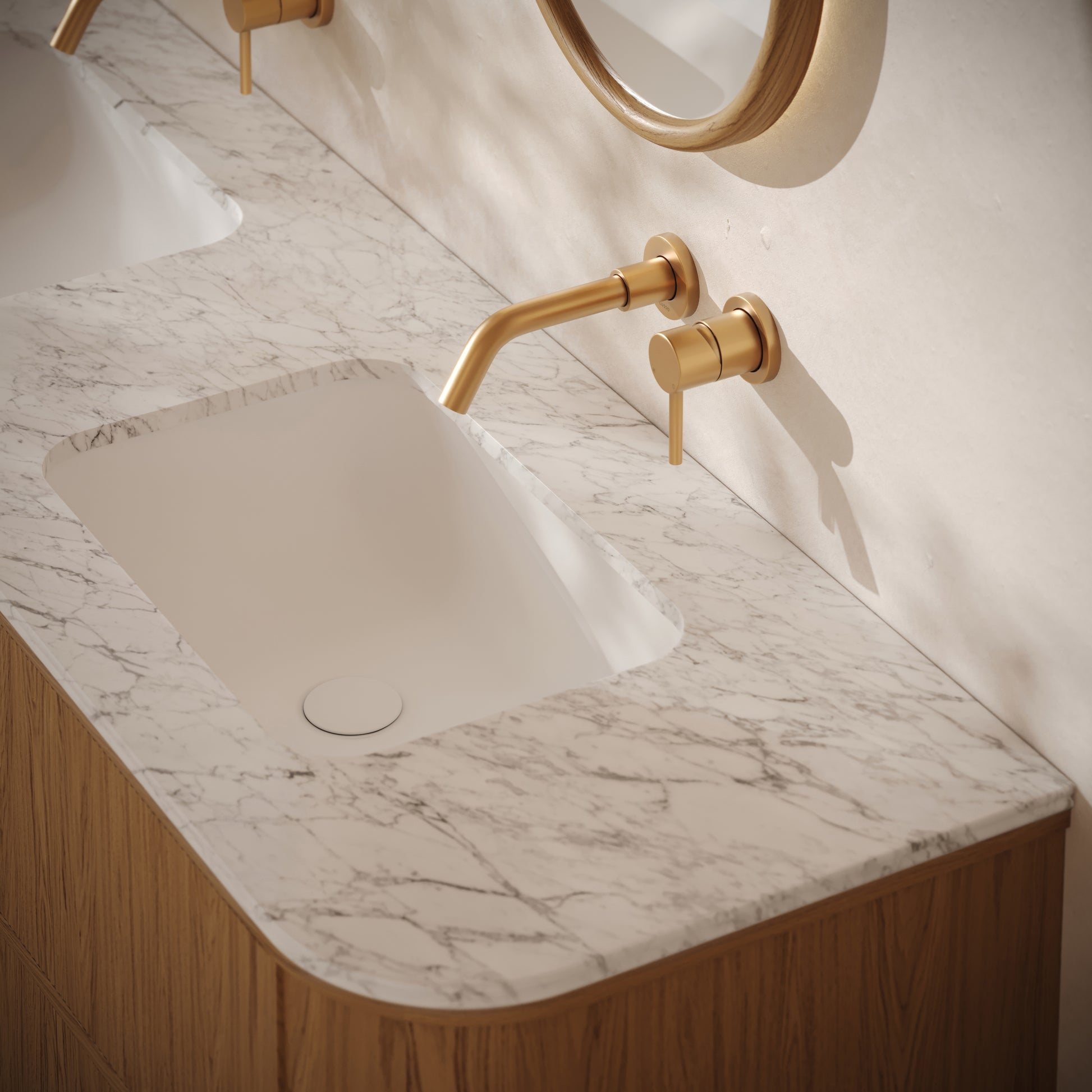 Perfect for couples or family bathrooms, the vanity unit is designed with practical double basins that are crafted from either our signature Cortese® stone composite or our Itallian Cararra marble, and features generous concealed storage to ensure uncluttered living. The vanity unit is available in an oak finish, which works beautifully with warm brassware shades such as brushed gold.