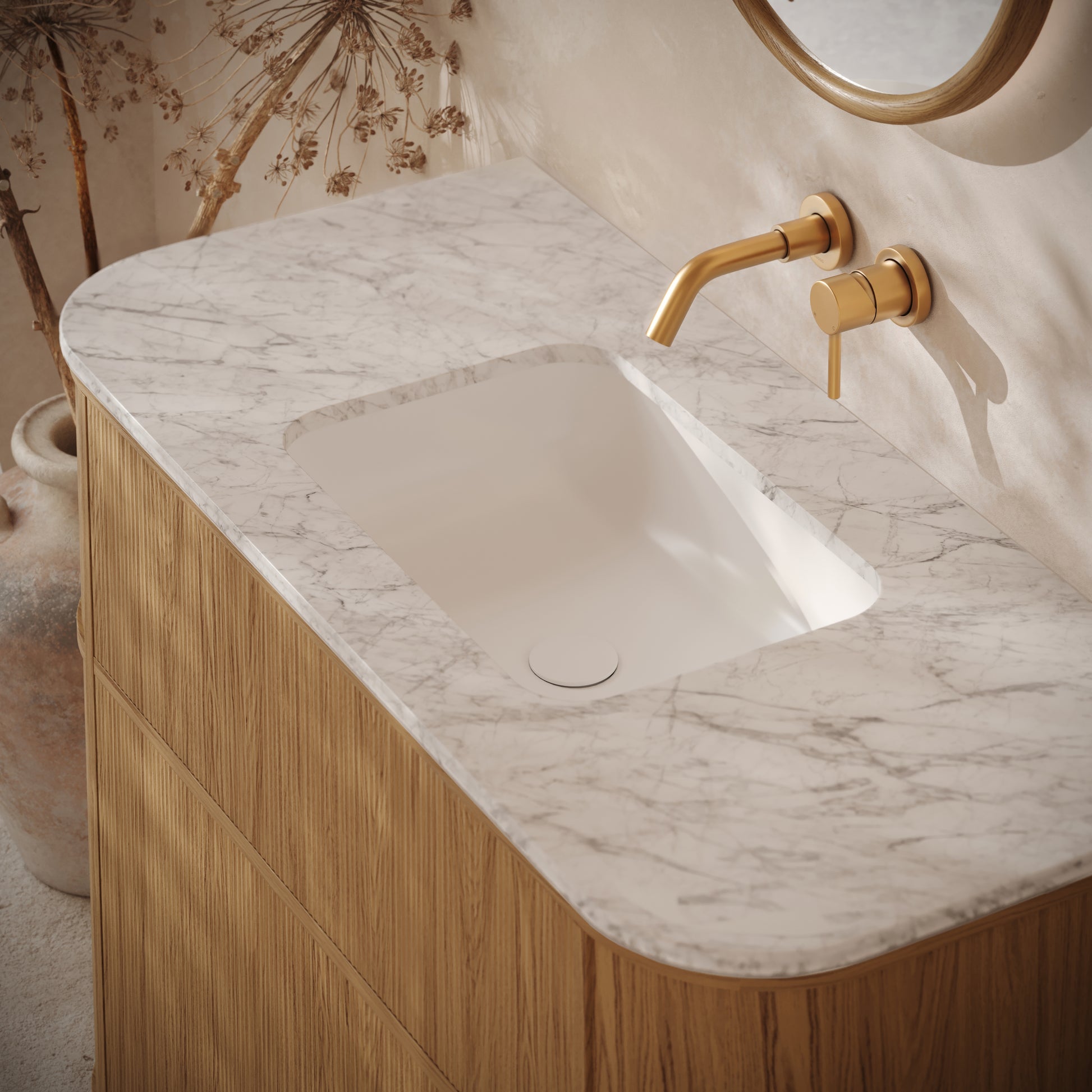 The solid oak surface of the vanity beautifully transitions from smooth wood to fluted wood, which contrasts beautifully with either a solid marble countertop crafted from luxury Italian Carrara marble, or soft matte white Cortese® stone. Complete with a built-in basin and functional soft closing doors, the vanity offers a striking statement for any modern or traditional interior while serving its purpose as a practical bathroom item.