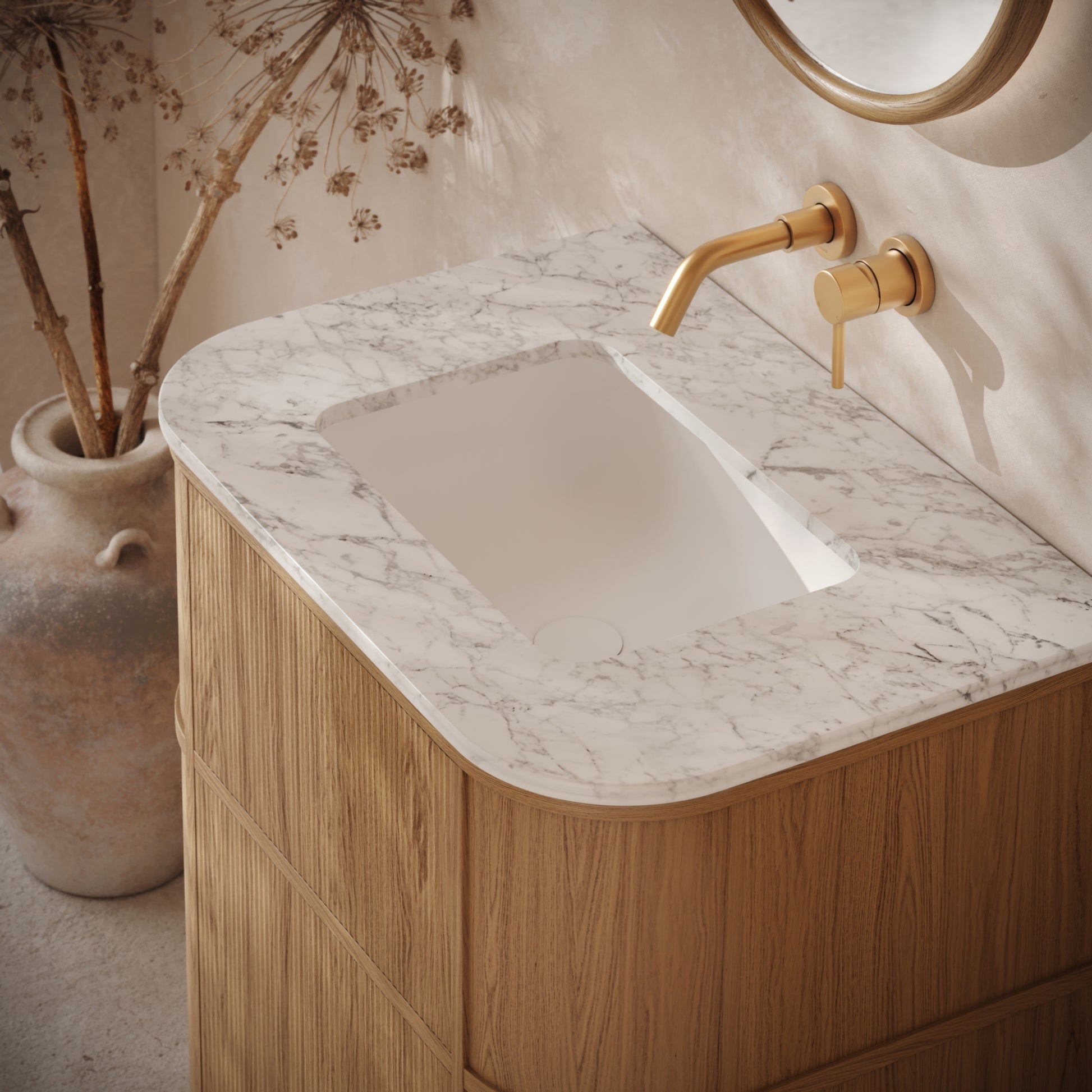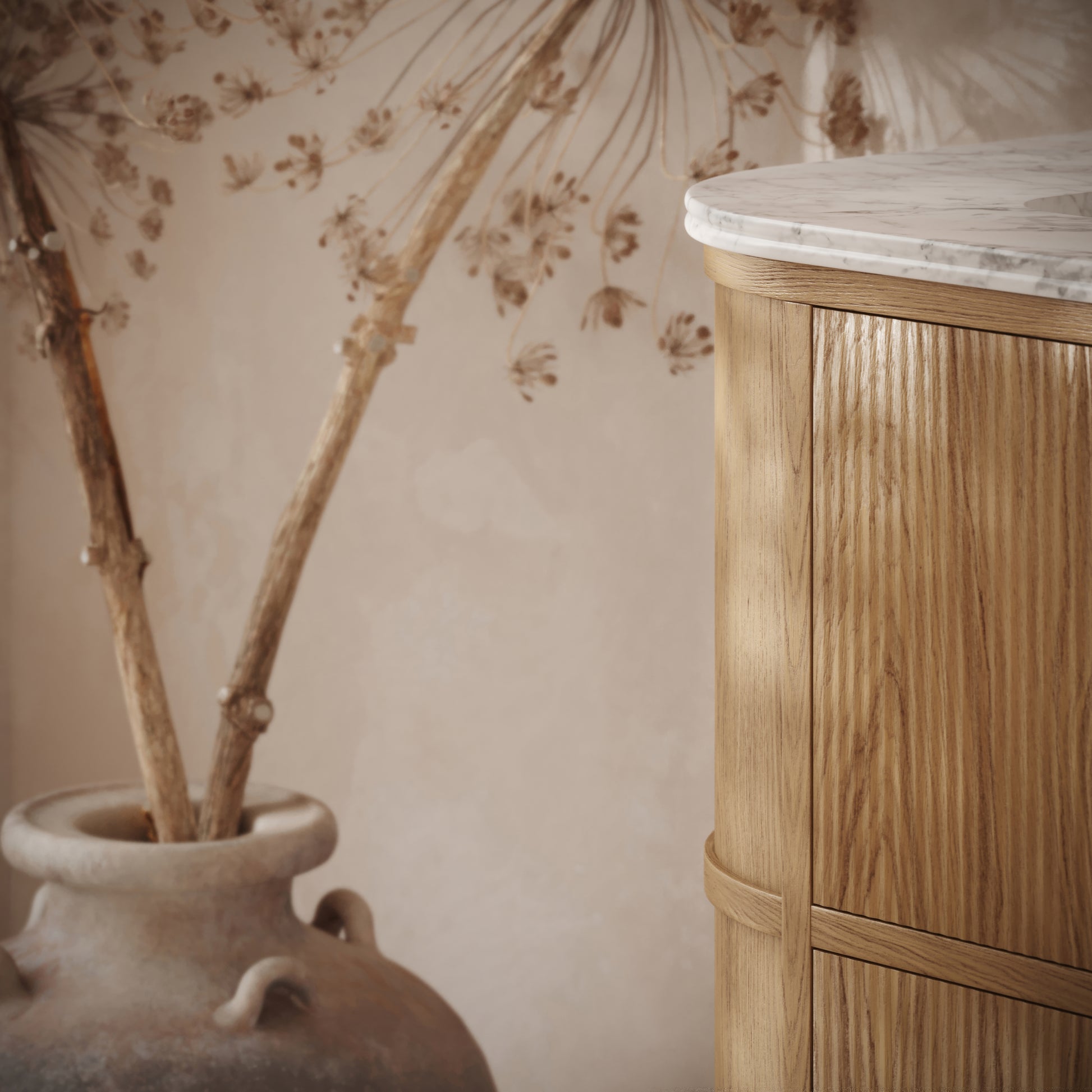The floorstanding vanity unit, at 800mm wide, is expertly crafted from solid FSC certified wood and is defined by its soft curvaceous silhouette and built in either a matte white Cortese® stone, or an Italian Carrara marble. The oak is detailed with intricate fluted detailing, adding an element of tactility to the product. The vanity not only provides beauty for your bathroom, but also offers concealed storage for neat and uncluttered living. Extremely versatile, elevate your modern or traditional space with the Cheval vanity unit.