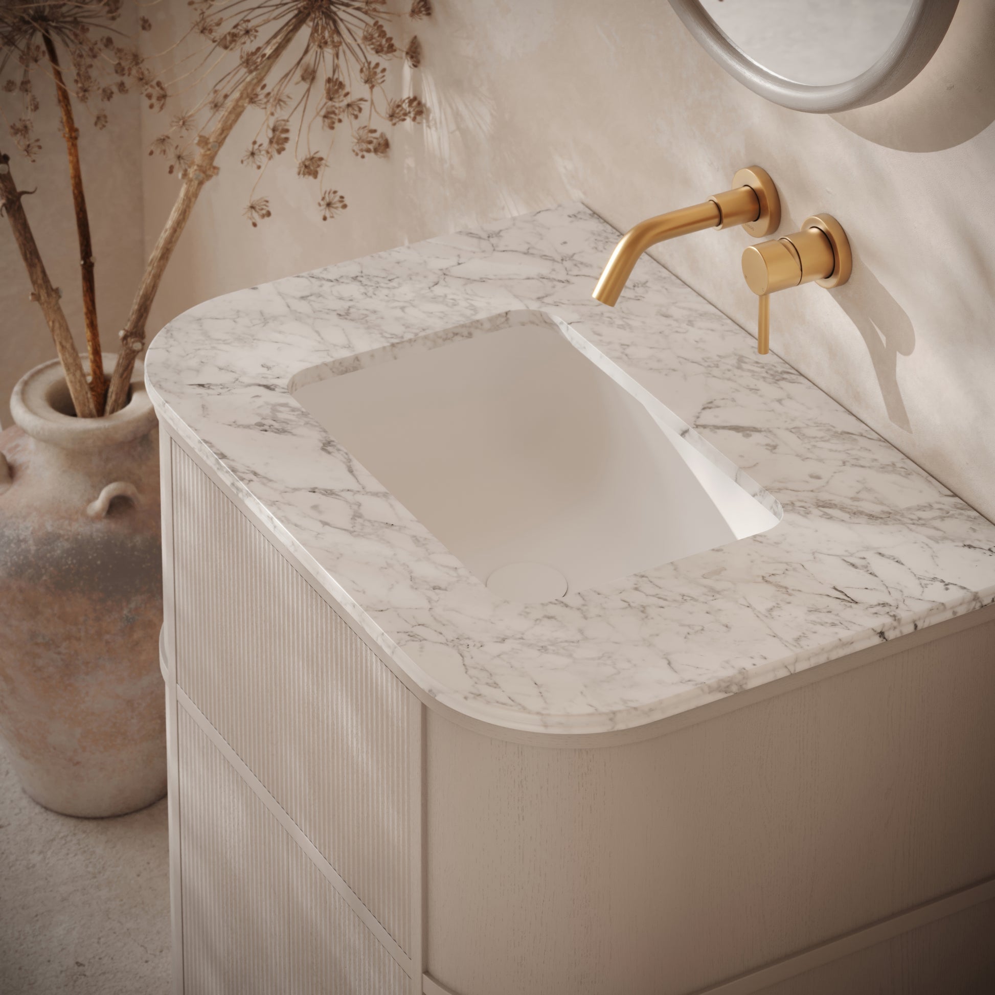 At 800mm wide, the vanity unit works beautifully in a range of bathrooms and ensuites, and features concealed storage for uncluttered living. The vanity unit takes design notes from mid-century interiors, with elegant fluted woodwork and sweeping curves, which is further elevated by our signature Cortese®, or our luxurious Carrara marble. The vanity unit operates with soft closing doors for seamless functionality.