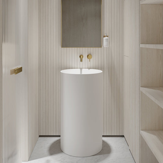 The Colonna concrete basin brings timeless elegance to your bathroom with a beautiful round silhouette and premium fair faced concrete construction. Finished in a neutral shore colour, this pedestal basin adds warmth and sophistication to any space.