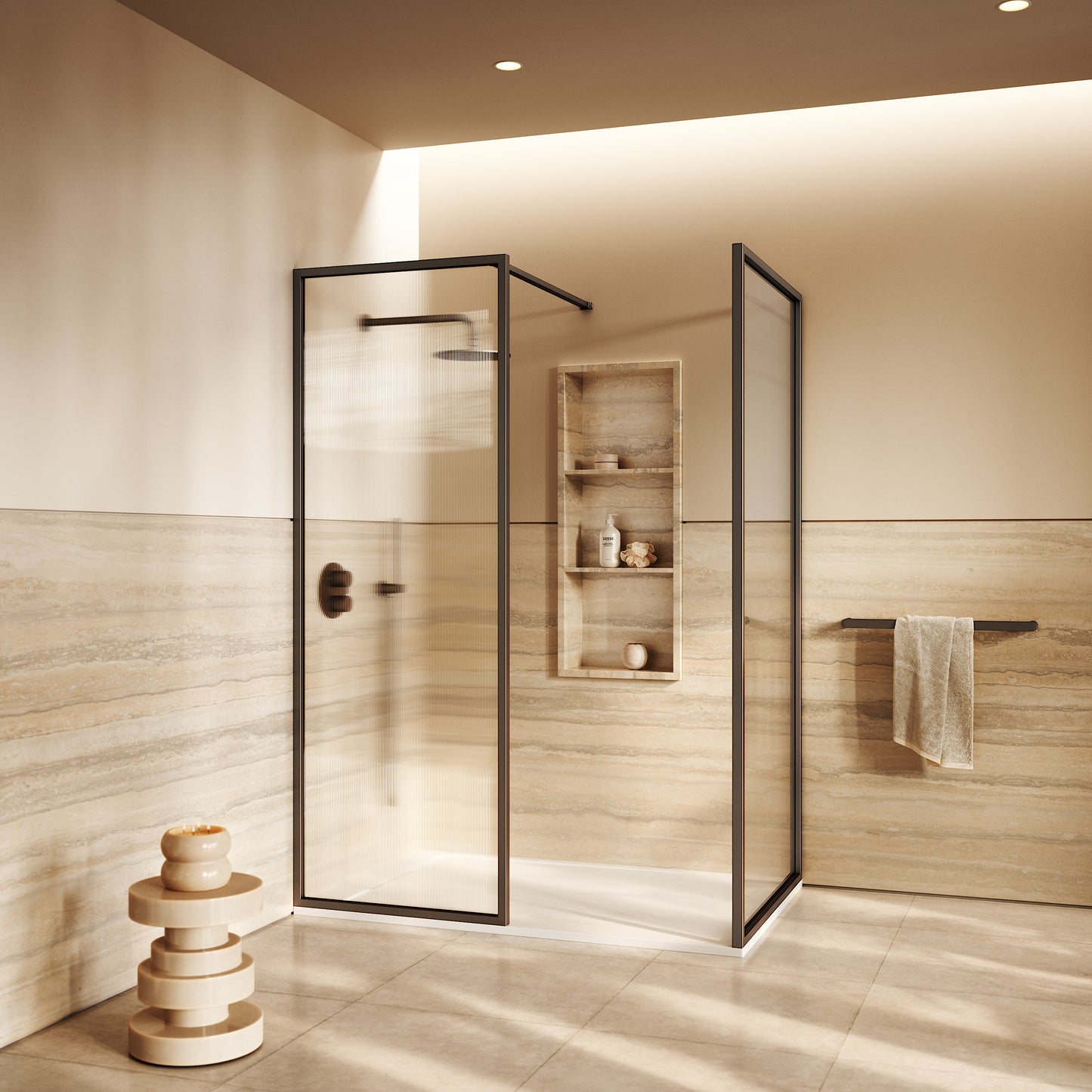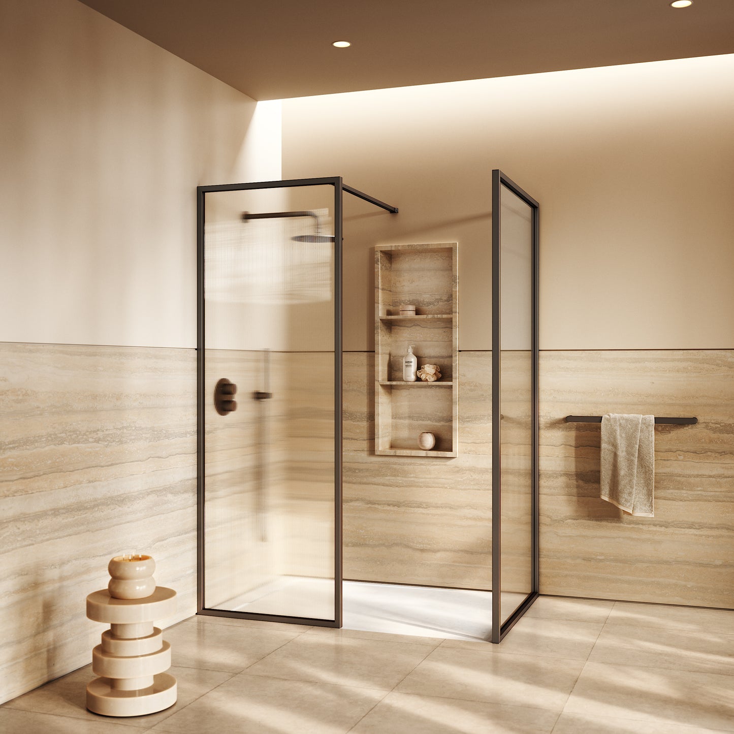 Featuring two reeded glass panels, the enclosure delivers both visual impact and practical protection, their textured surface diffuses light to create a sense of privacy and depth. Framed with our elegant deep bronze finish, the Opulence enclosure enhances your interior with warmth and sophistication, perfectly balancing contemporary minimalism with classic allure. Harmonise further with deep bronze hardware such as our taps, for a cohesive scheme.