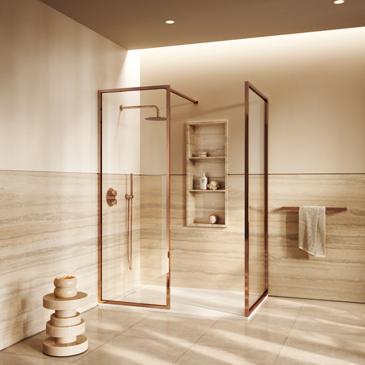 Designo Rose Gold Complete Walk In Shower Enclosure - KIT A - All SizesRegular price From £677.00 (£564.17 EX VAT)Sale price From £677.00 (£564.17 EX VAT)Unit price perRegular price From £677.00 (£564.17 EX VAT)Sale price From £677.00 (£564.17 EX VAT)Unit price per