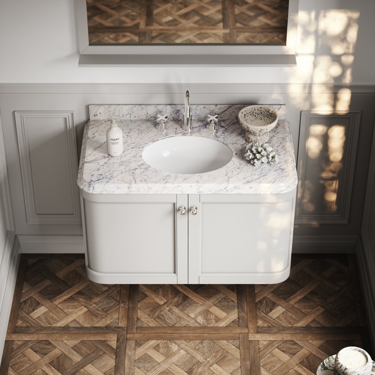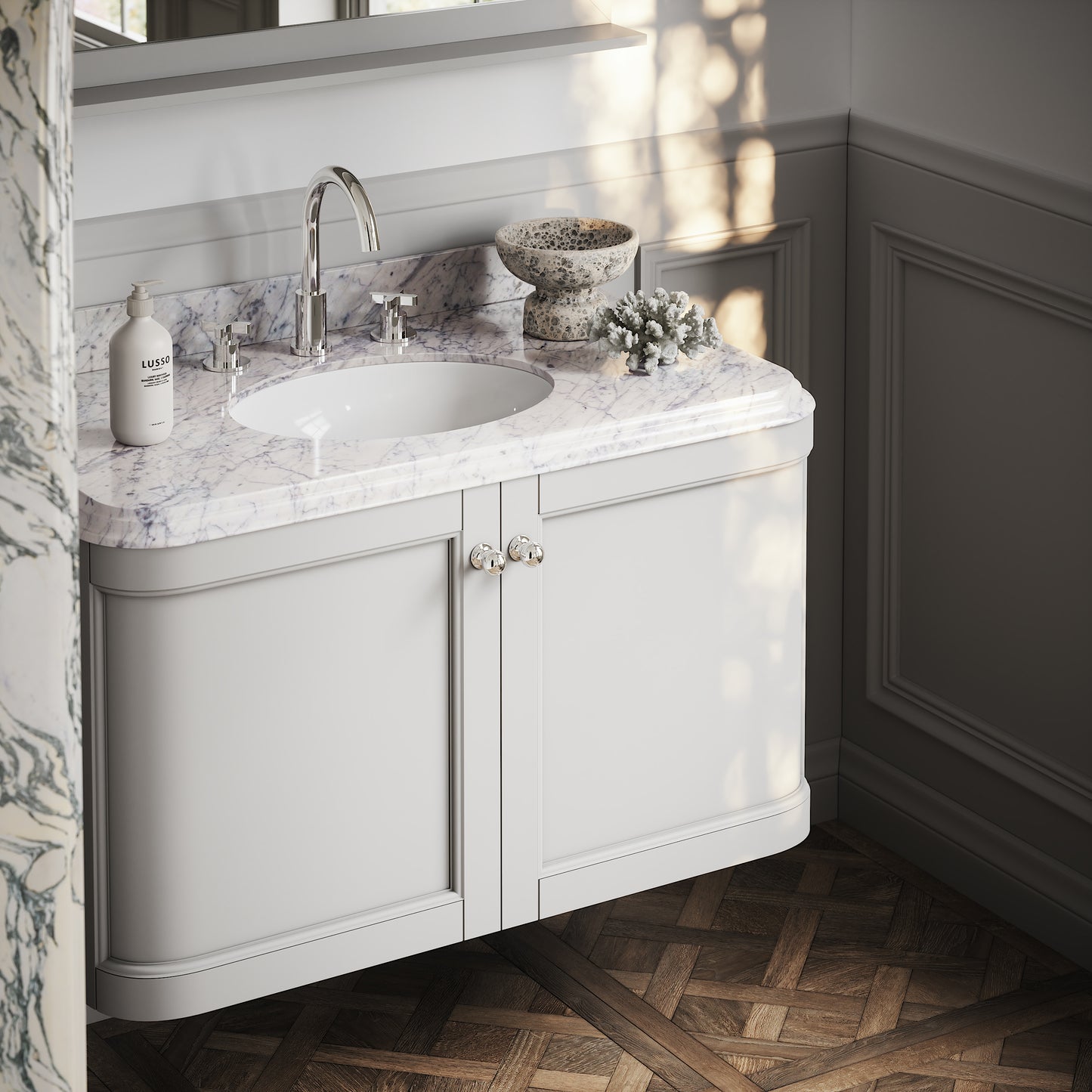 The Charsley Vanity Unit is defined by its glamorous, elegant appearance. Featuring a smooth countertop carved from Italian Carrara marble in a polished finish, alongside a built-in oval basin, the wooden vanity unit is a seamless contrast between modern and traditional design, finished with cove ogee bevelled edges.