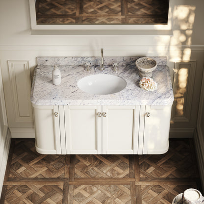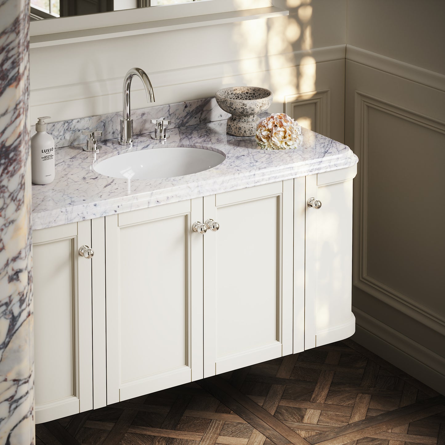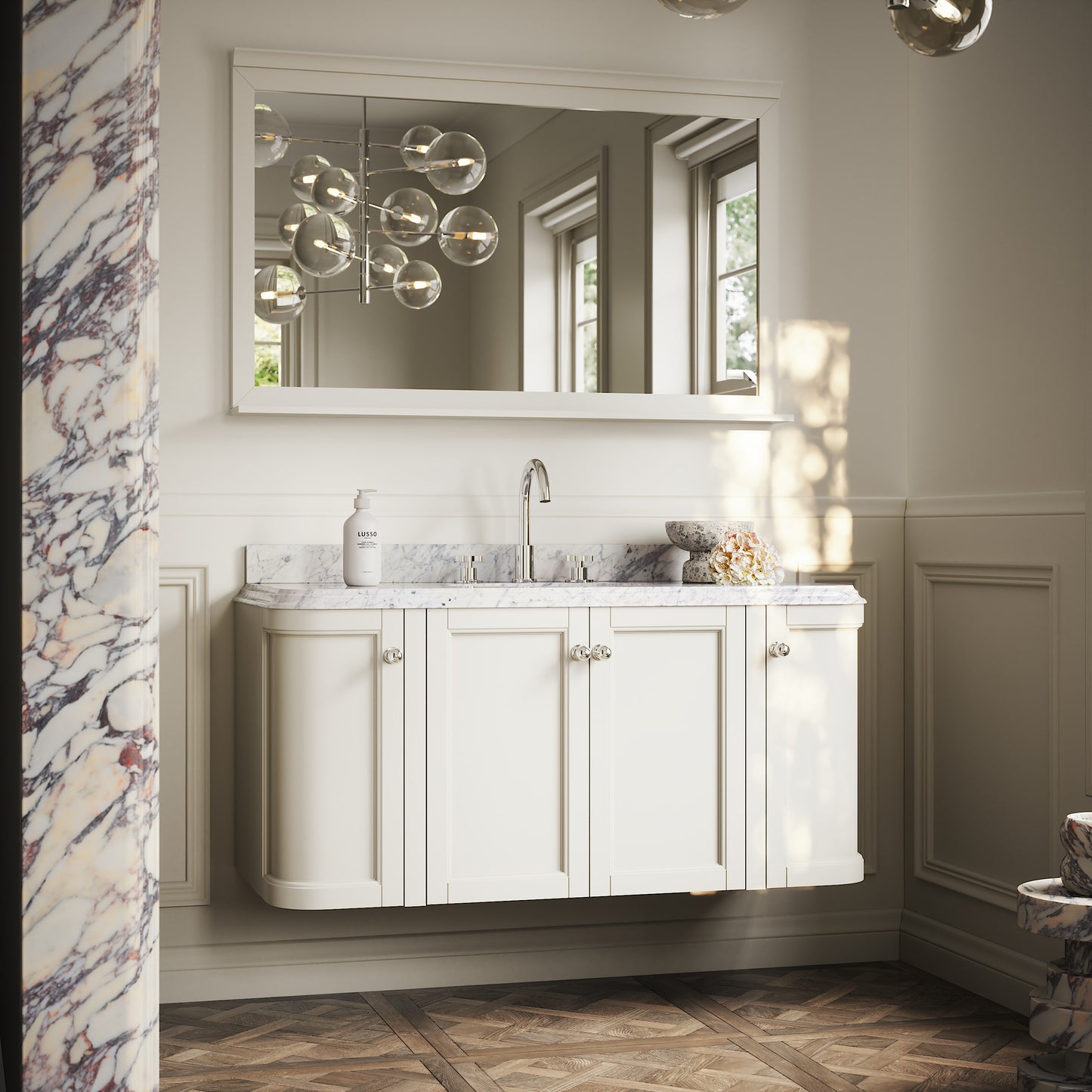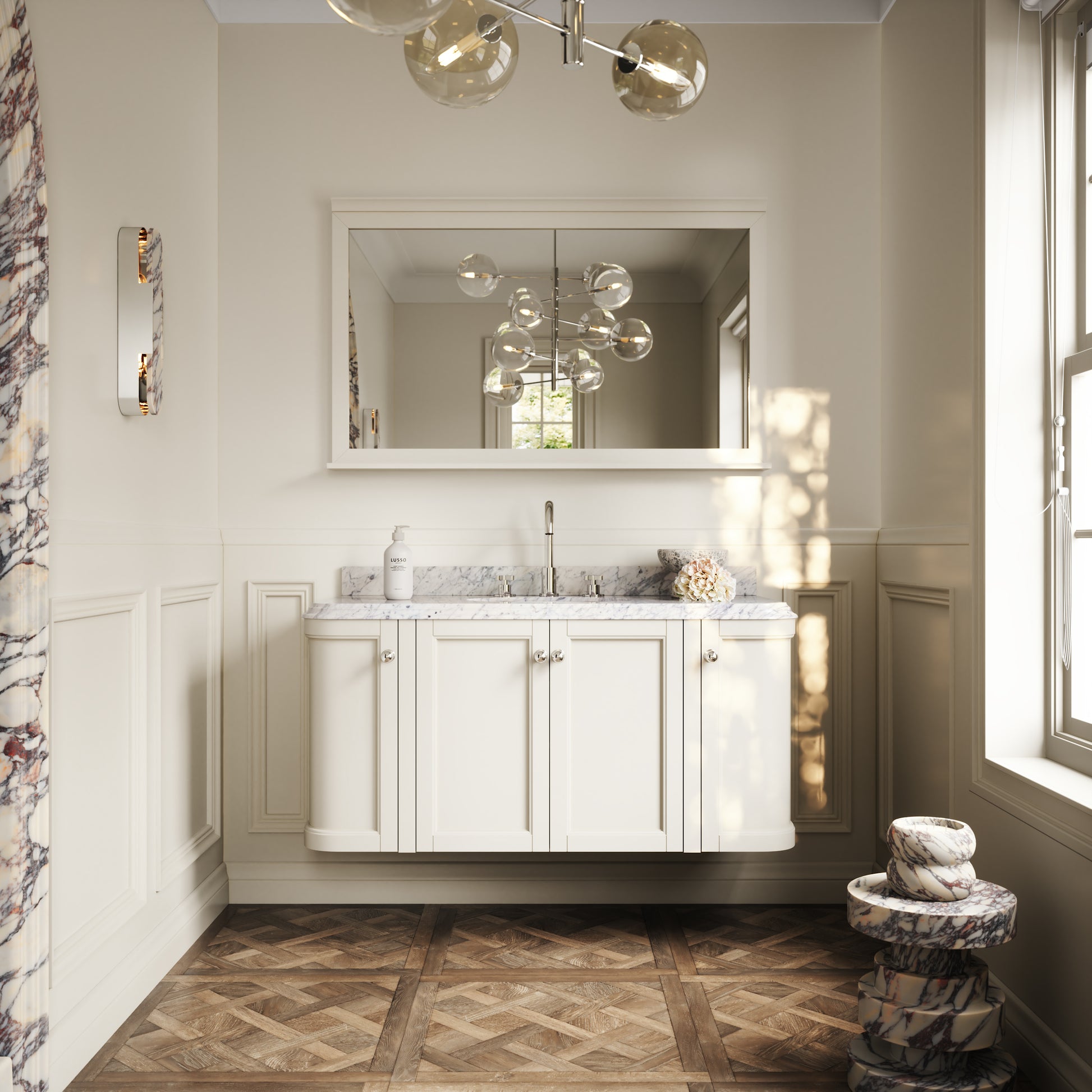 With the use of elegant polished Carrara marble to the countertop, alongside a traditional oval built-in basin, the Charsley Wall Hung Matte White Vanity Unit offers palatial bathroom luxury. In keeping with the Art Deco influence, the wall mounted vanity unit has also been finished with cove ogee bevelled edging to the marble.