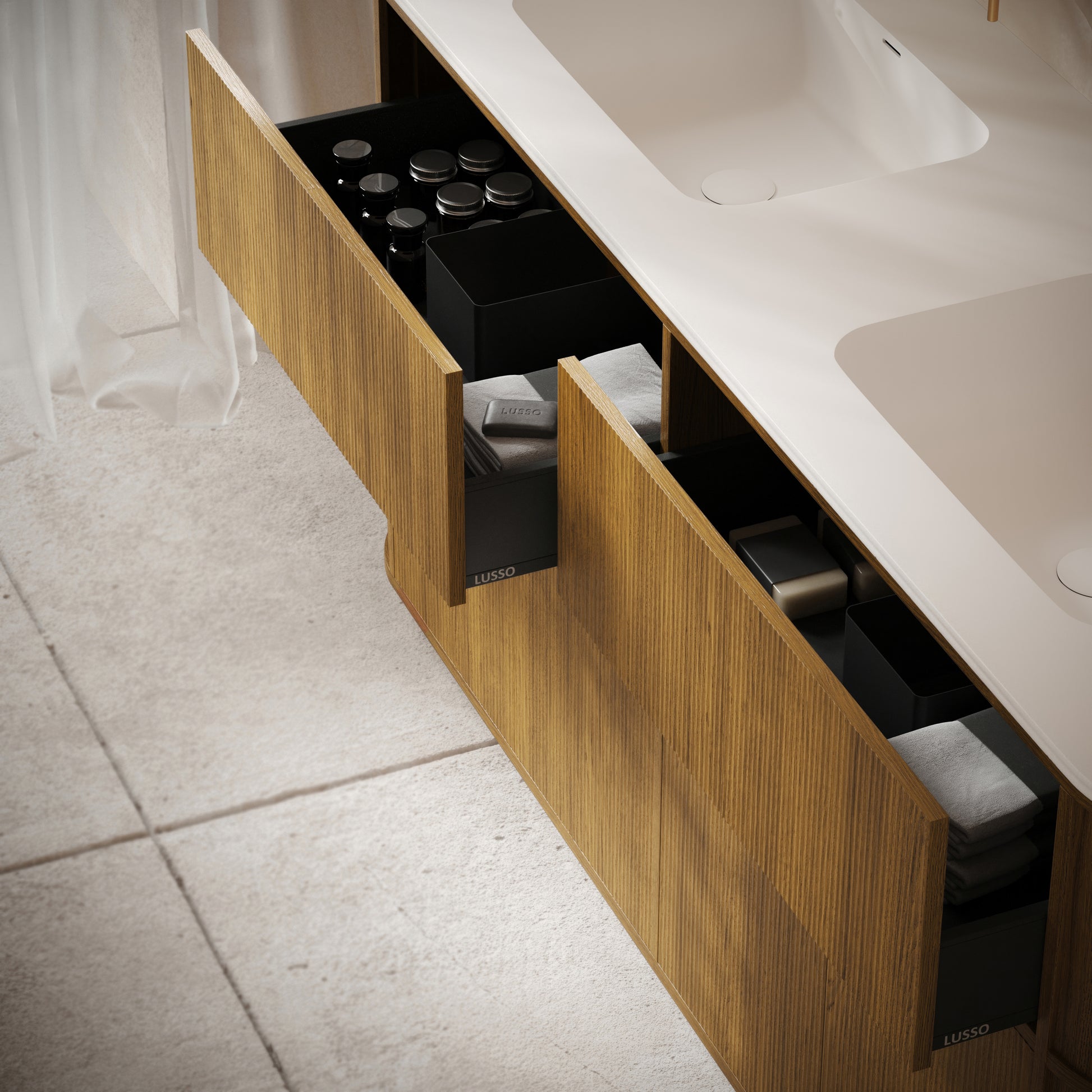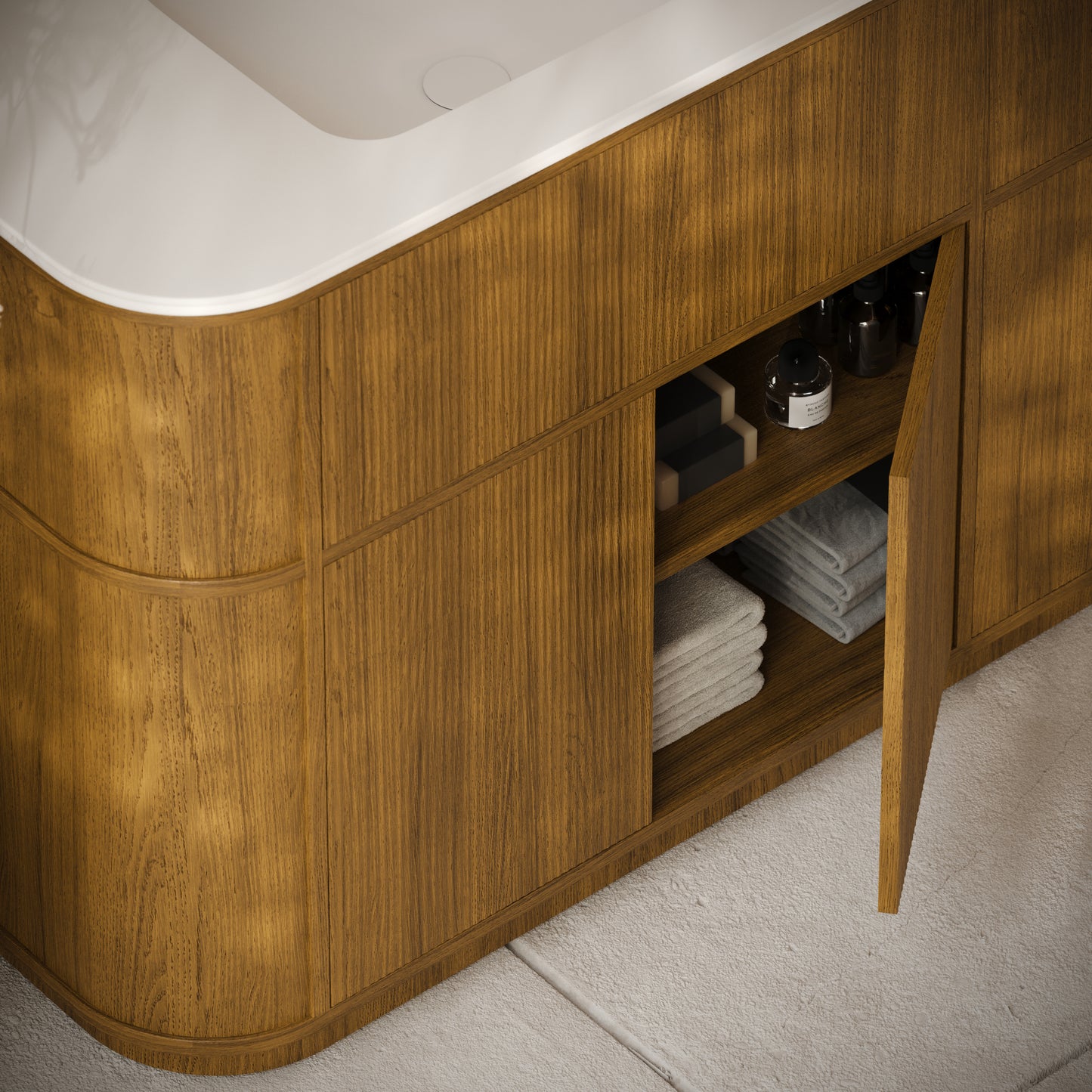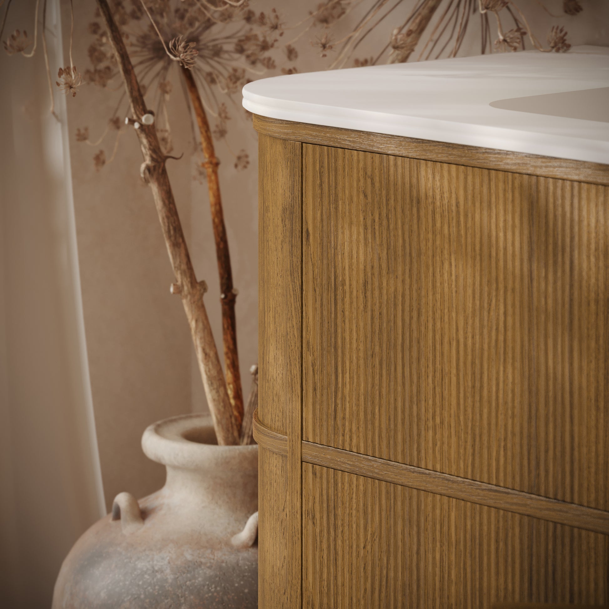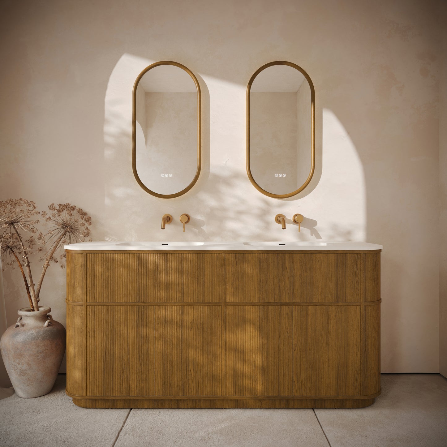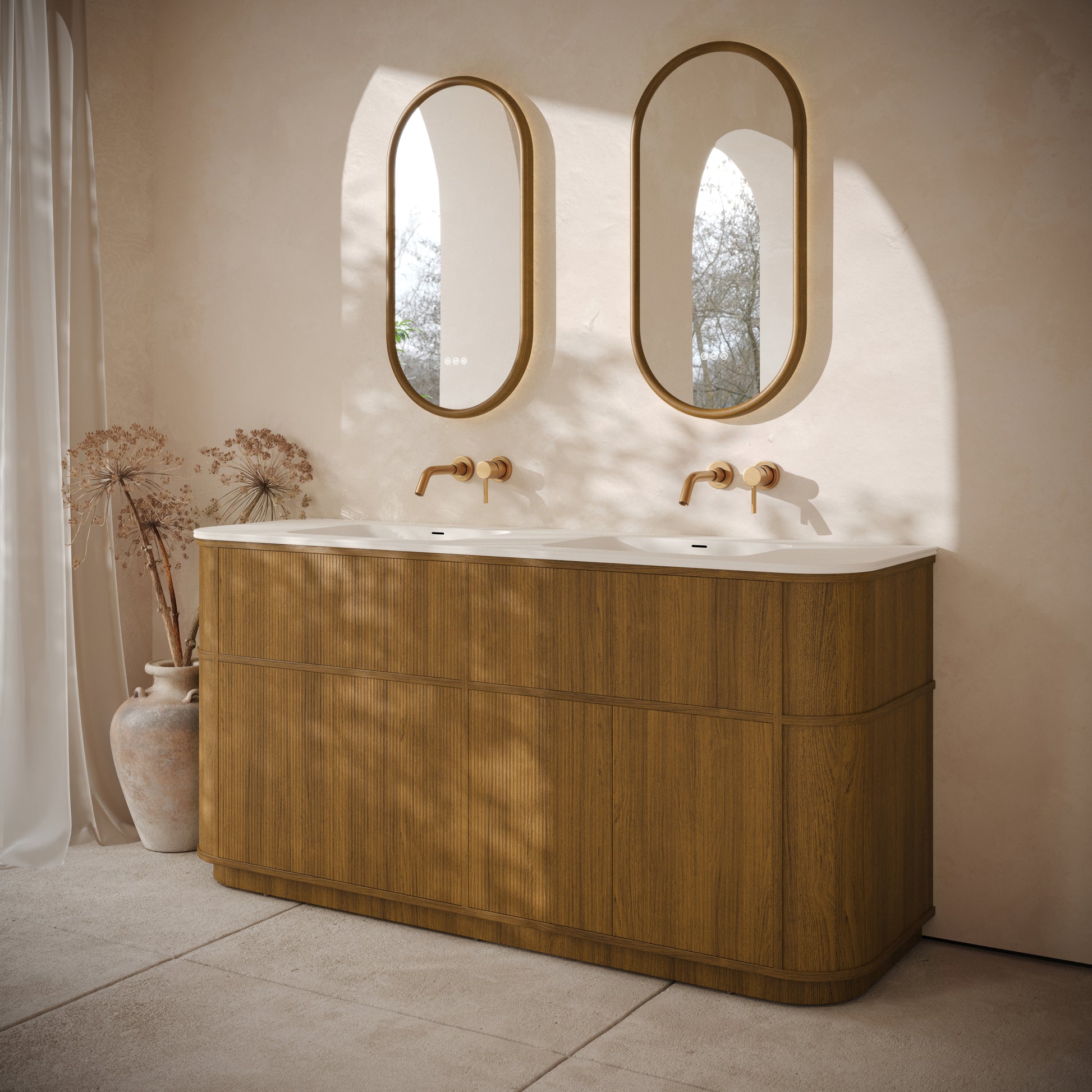 At 1800mm wide, the Cheval Honey Oak Floorstanding Vanity Unit is the perfect piece for couples or family bathrooms, featuring double built-in basins crafted from either Italian Carrara marble or our signature Cortese® stone.