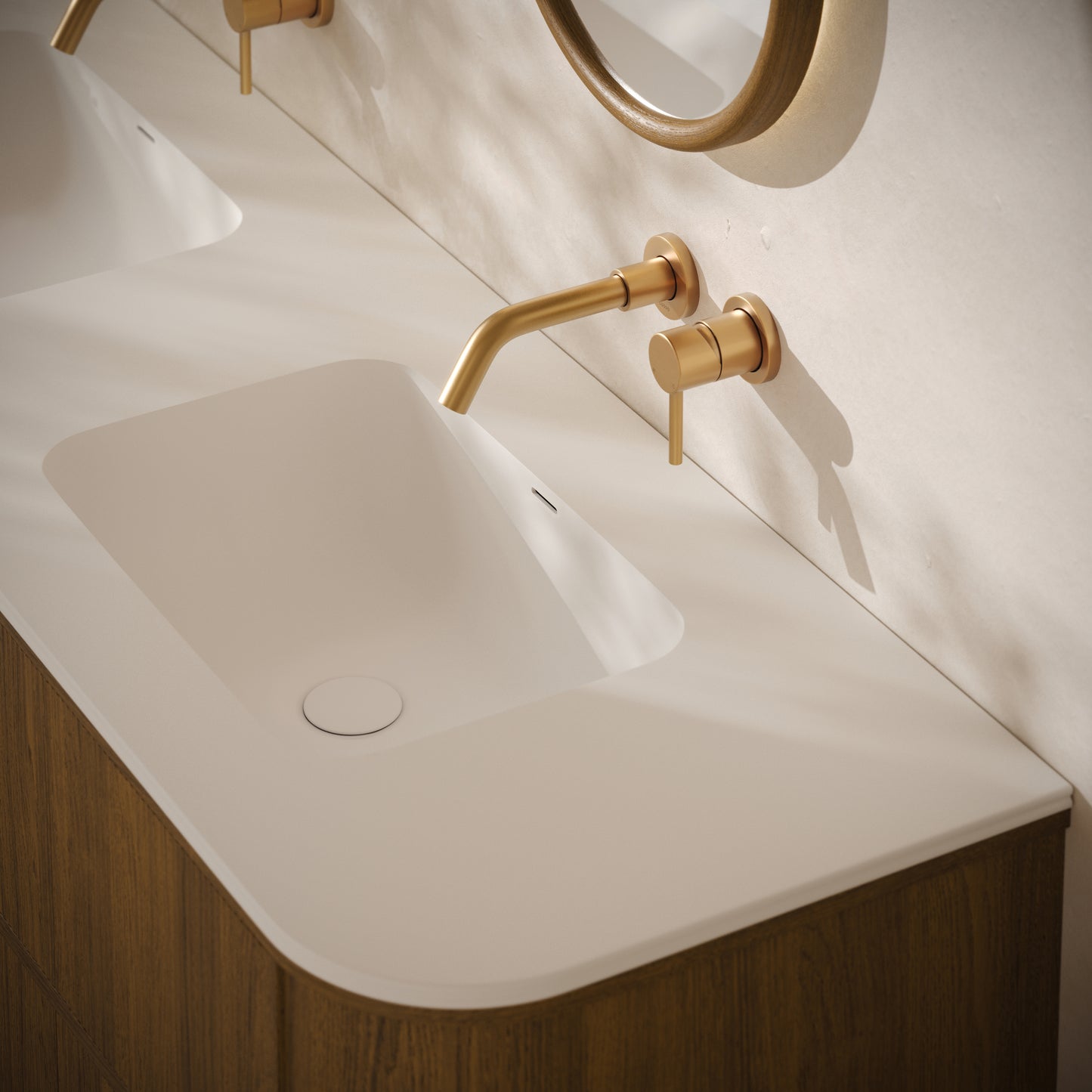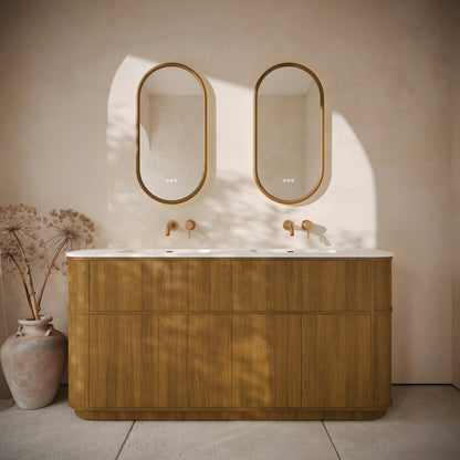 In the warm honey oak shade, the vanity unit can be styled with brushed gold brassware from the Lusso collection, including taps, accessories, and hardware.