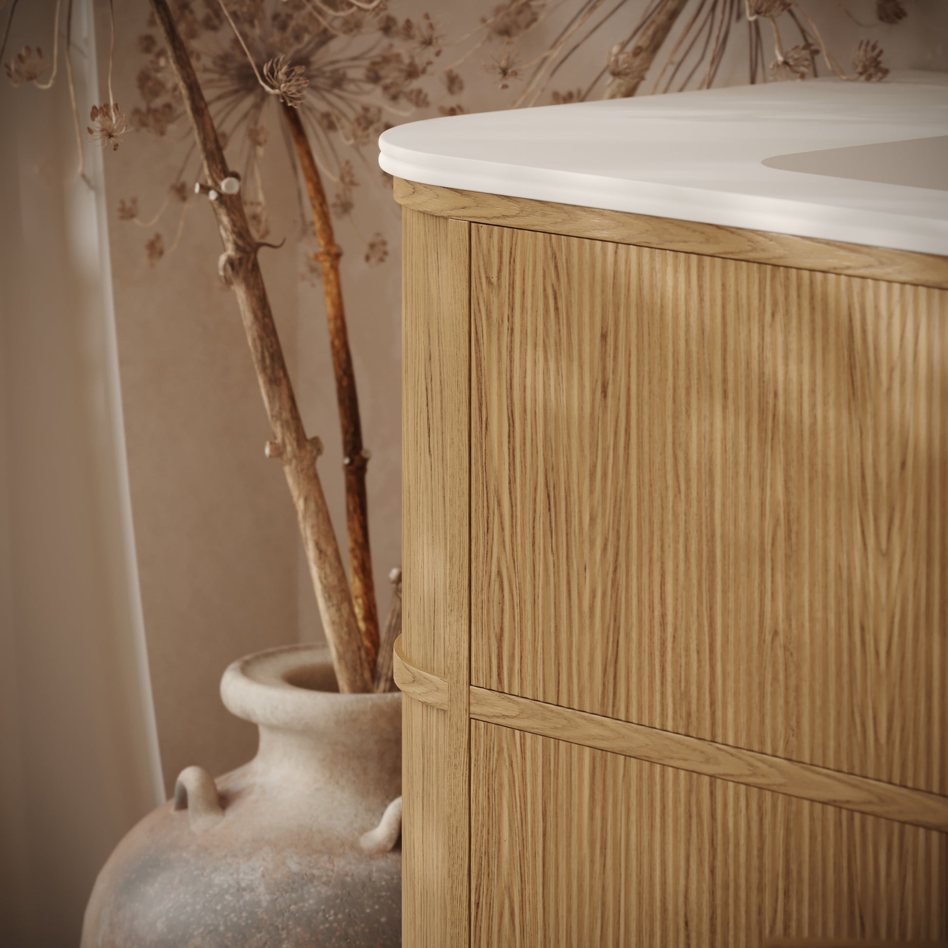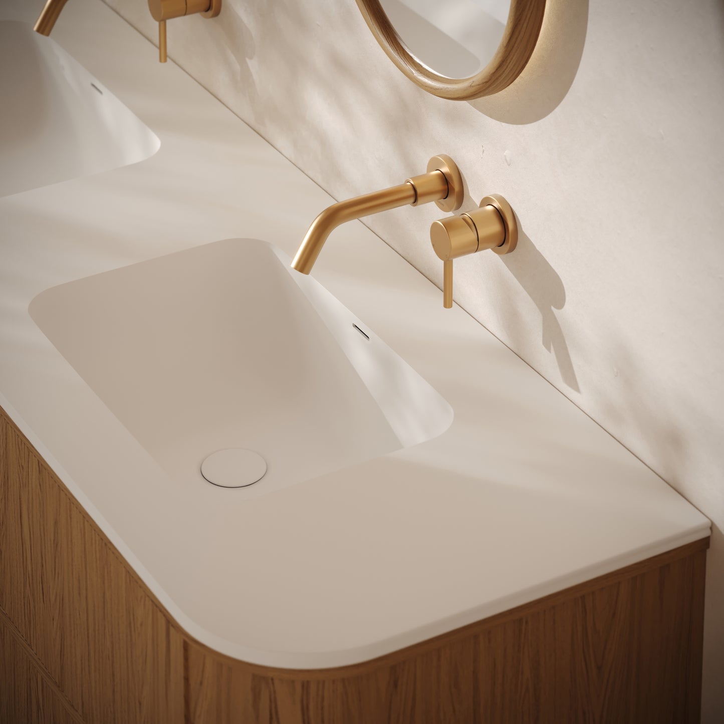 Perfect for couples or family bathrooms, the vanity unit is designed with practical double basins that are crafted from either our signature Cortese® stone composite or our Itallian Cararra marble, and features generous concealed storage to ensure uncluttered living. The vanity unit is available in an oak finish, which works beautifully with warm brassware shades such as brushed gold.