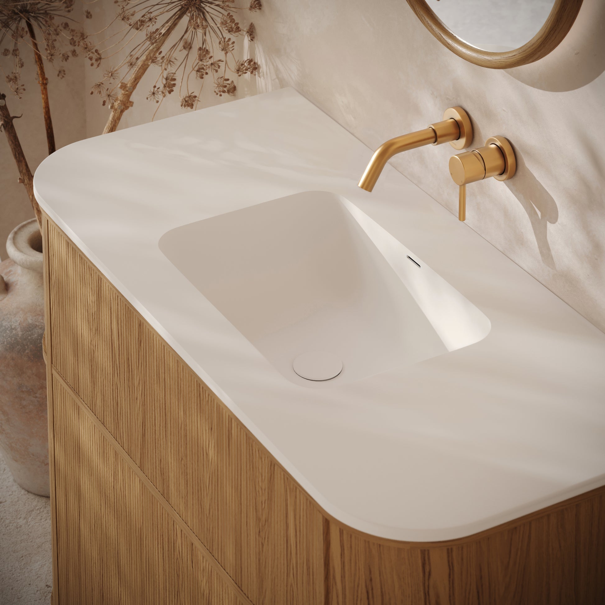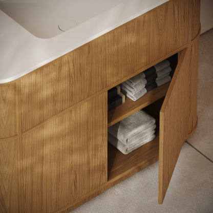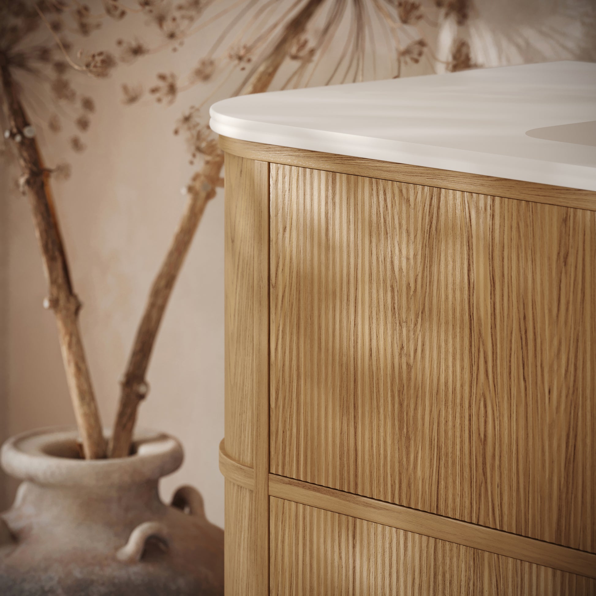 The solid oak surface of the vanity beautifully transitions from smooth wood to fluted wood, which contrasts beautifully with either a solid marble countertop crafted from luxury Italian Carrara marble, or soft matte white Cortese® stone. Complete with a built-in basin and functional soft closing doors, the vanity offers a striking statement for any modern or traditional interior while serving its purpose as a practical bathroom item.