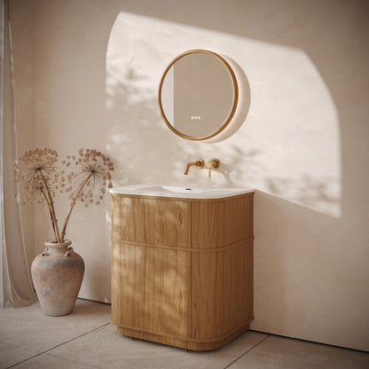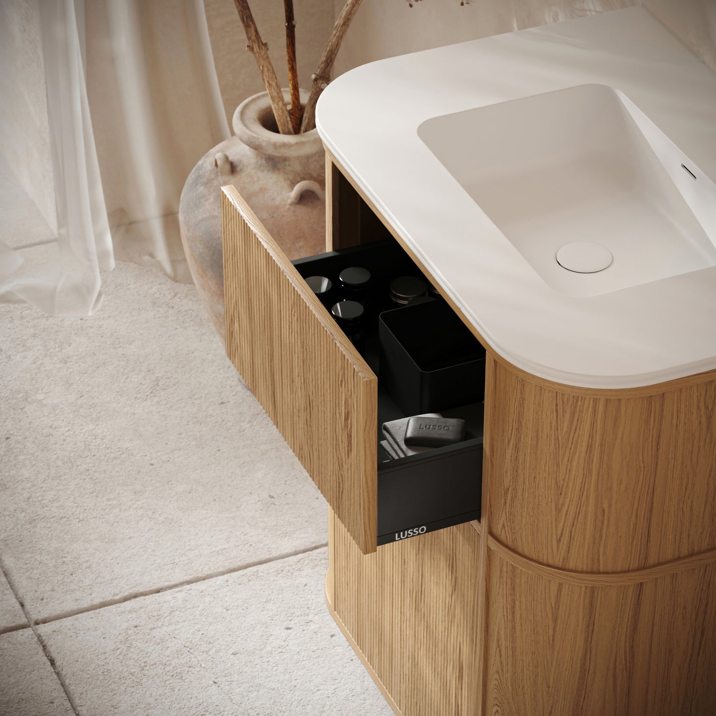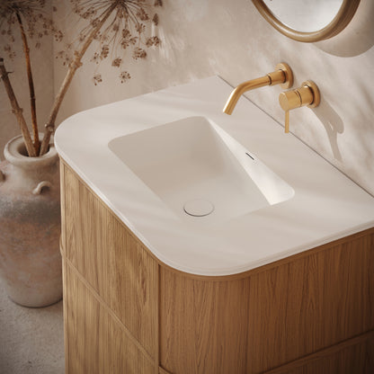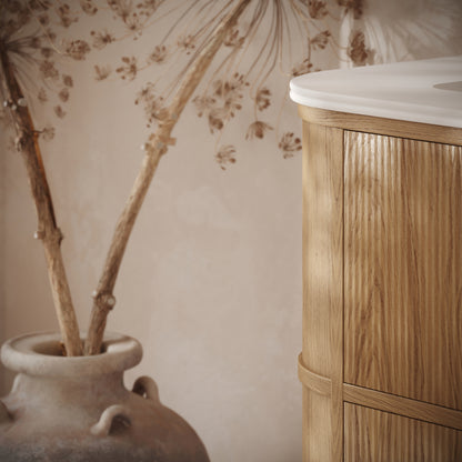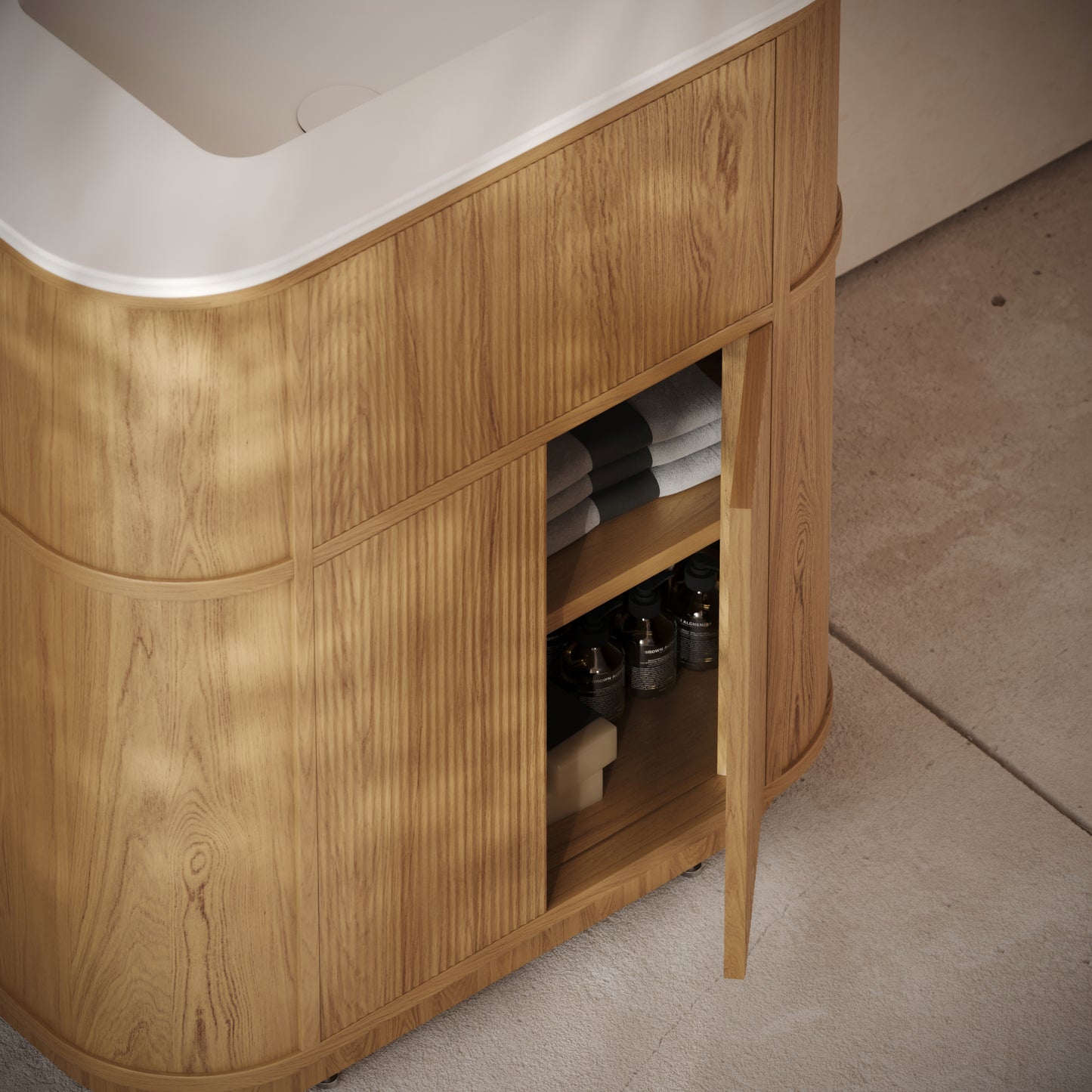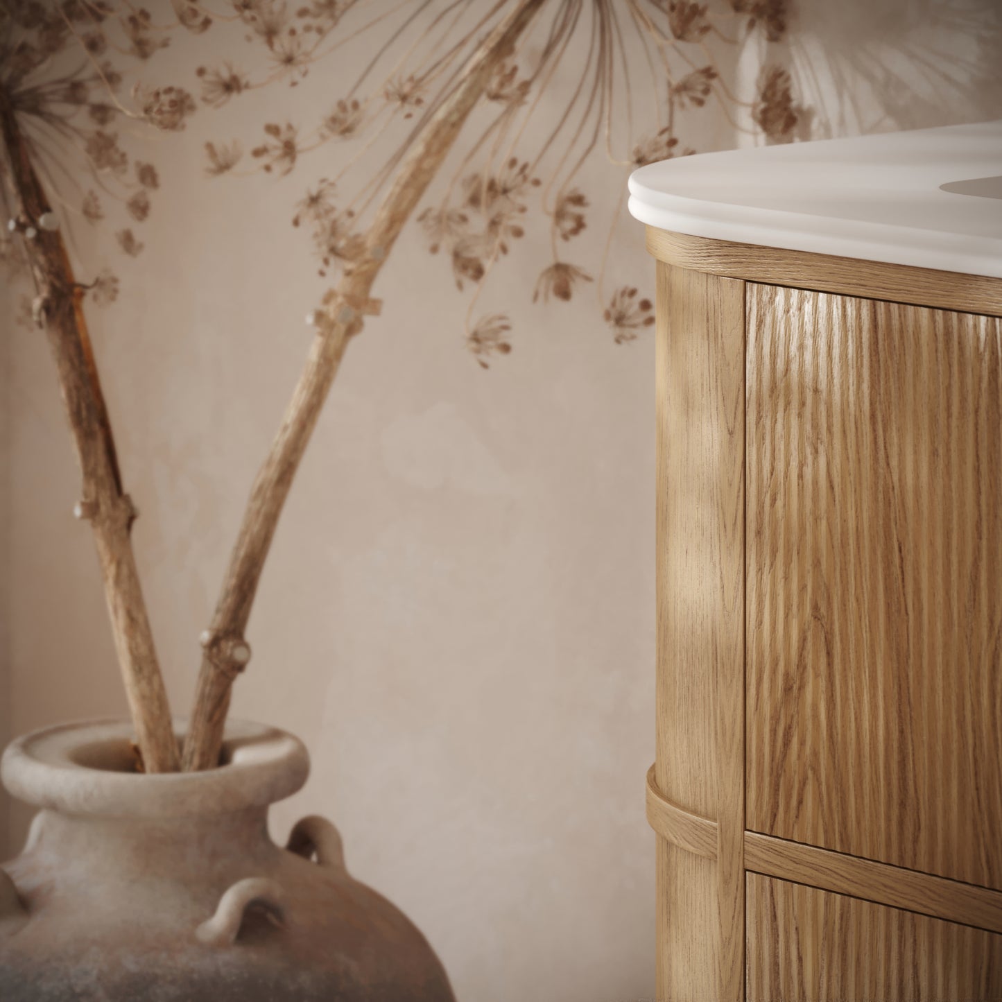 The floorstanding vanity unit, at 800mm wide, is expertly crafted from solid FSC certified wood and is defined by its soft curvaceous silhouette and built in either a matte white Cortese® stone, or an Italian Carrara marble. The oak is detailed with intricate fluted detailing, adding an element of tactility to the product. The vanity not only provides beauty for your bathroom, but also offers concealed storage for neat and uncluttered living. Extremely versatile, elevate your modern or traditional space with the Cheval vanity unit.