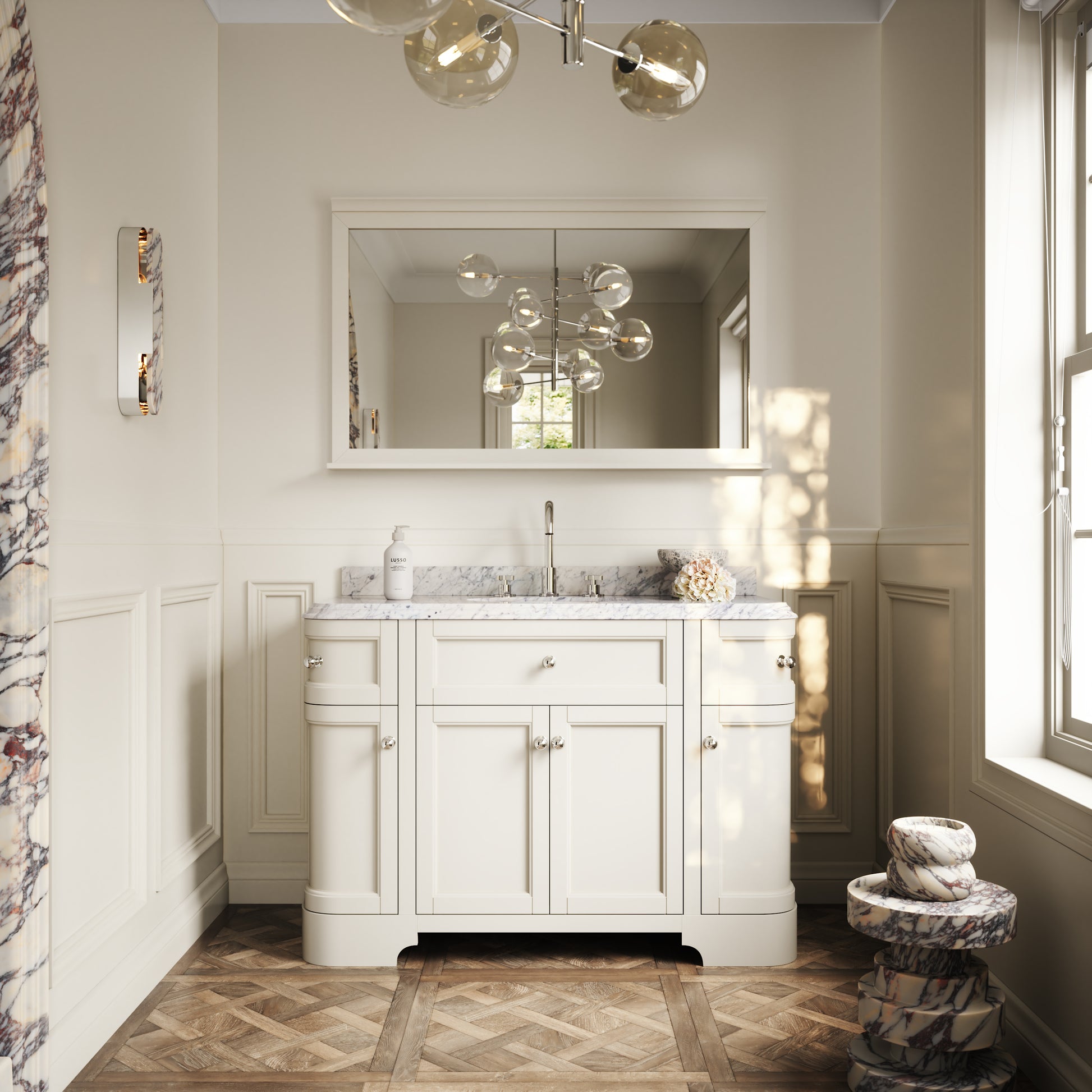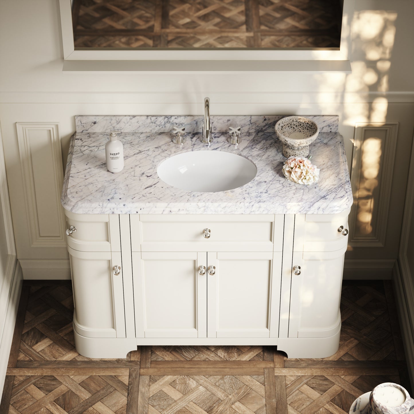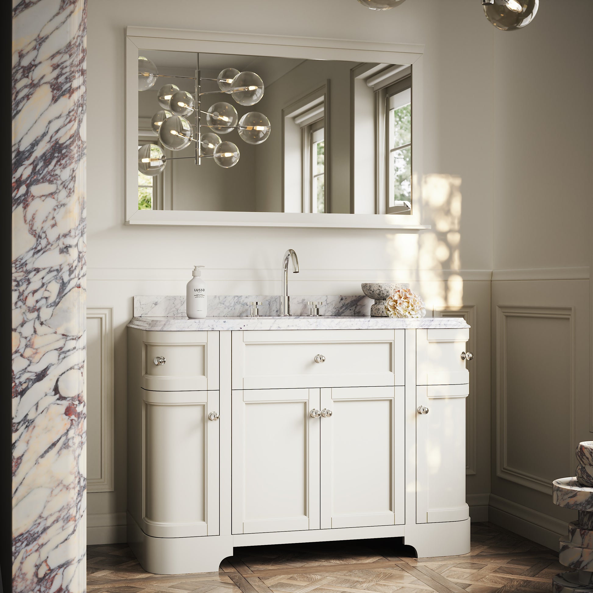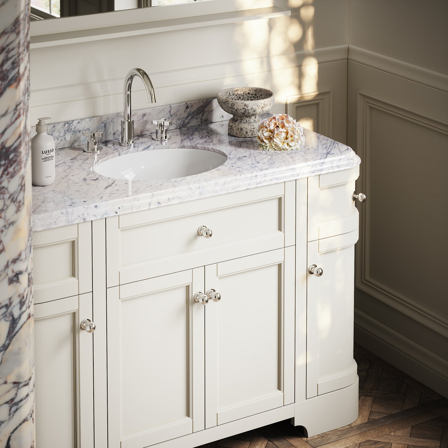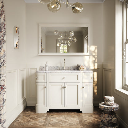The Connaught Floorstanding Vanity Unit takes key notes from 1920s glamour, including beautiful cove ogee bevelling that’s displayed to the edges of the polished Carrara marble countertop. The countertop is finished with a traditional undermount oval basin.