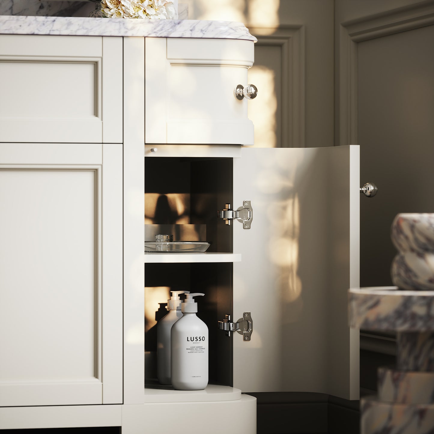 At 1200 mm wide, the freestanding vanity unit is suitable for smaller interiors and provides generous storage for uncluttered living. Door handles are optional due to a soft closing, push to open mechanism however if you do wish to add them, the cabinet’s hinges are fully concealed to give you full preference on the finish.