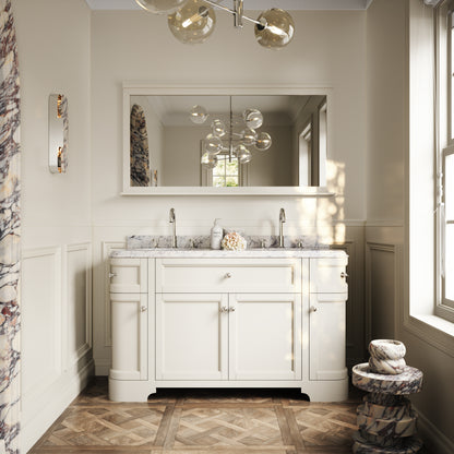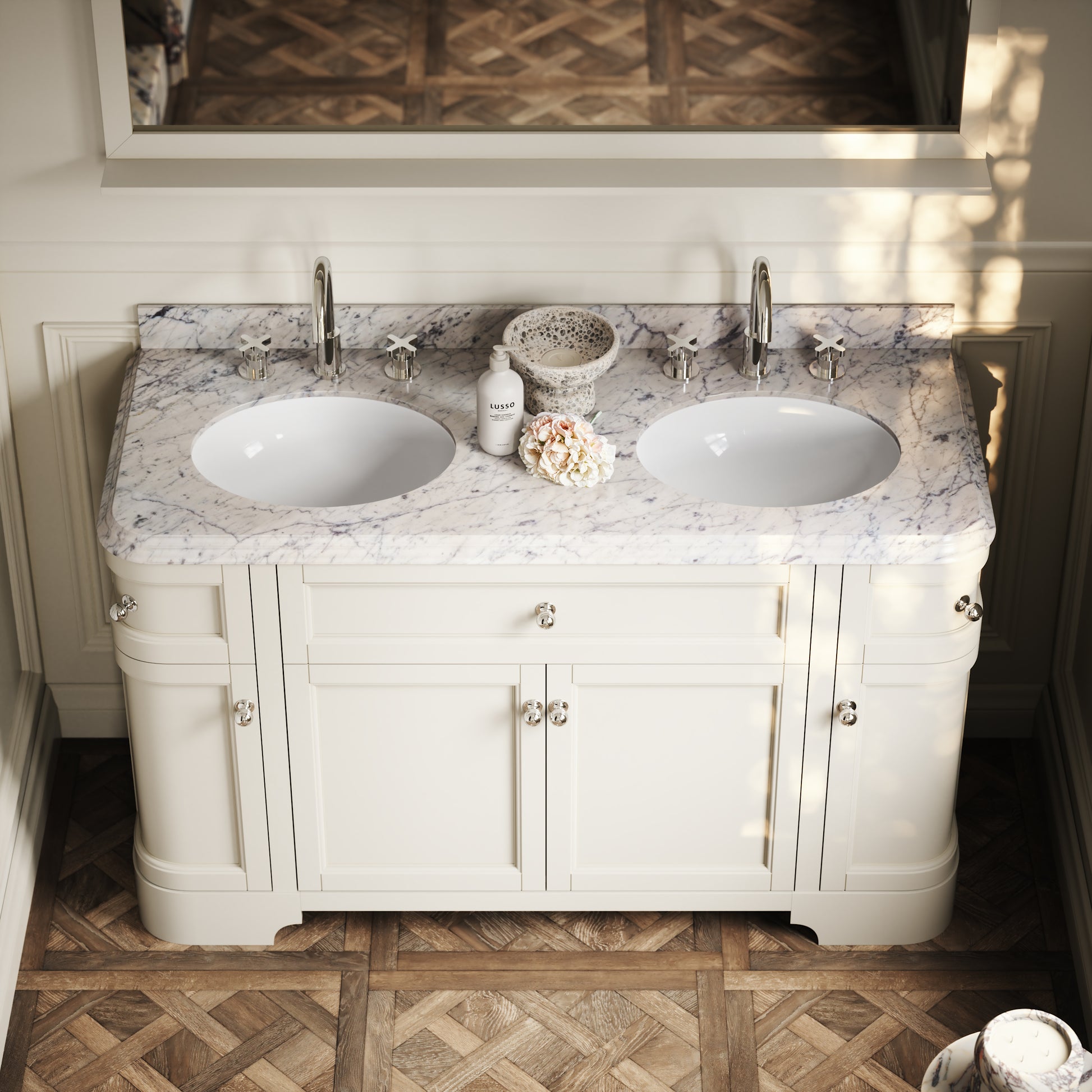 Featuring a double built-in basin, the Matte White Vanity Unit is crafted from marine grade plywood and is topped with Italian Carrara marble in a polished finish. This, alongside a Dupont arch and cove ogee bevelling creates a design that mirrors those of the Art Deco era.