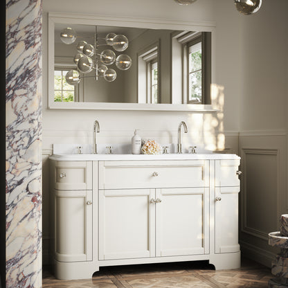 Featuring a double built-in basin, the Matte White Vanity Unit is crafted from marine grade plywood and is topped with Italian Carrara marble in a polished finish. This, alongside a Dupont arch and cove ogee bevelling creates a design that mirrors those of the Art Deco era.