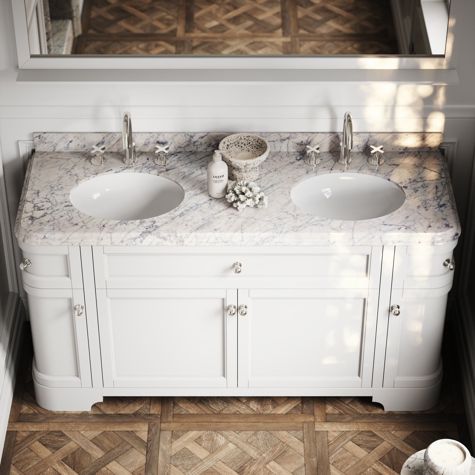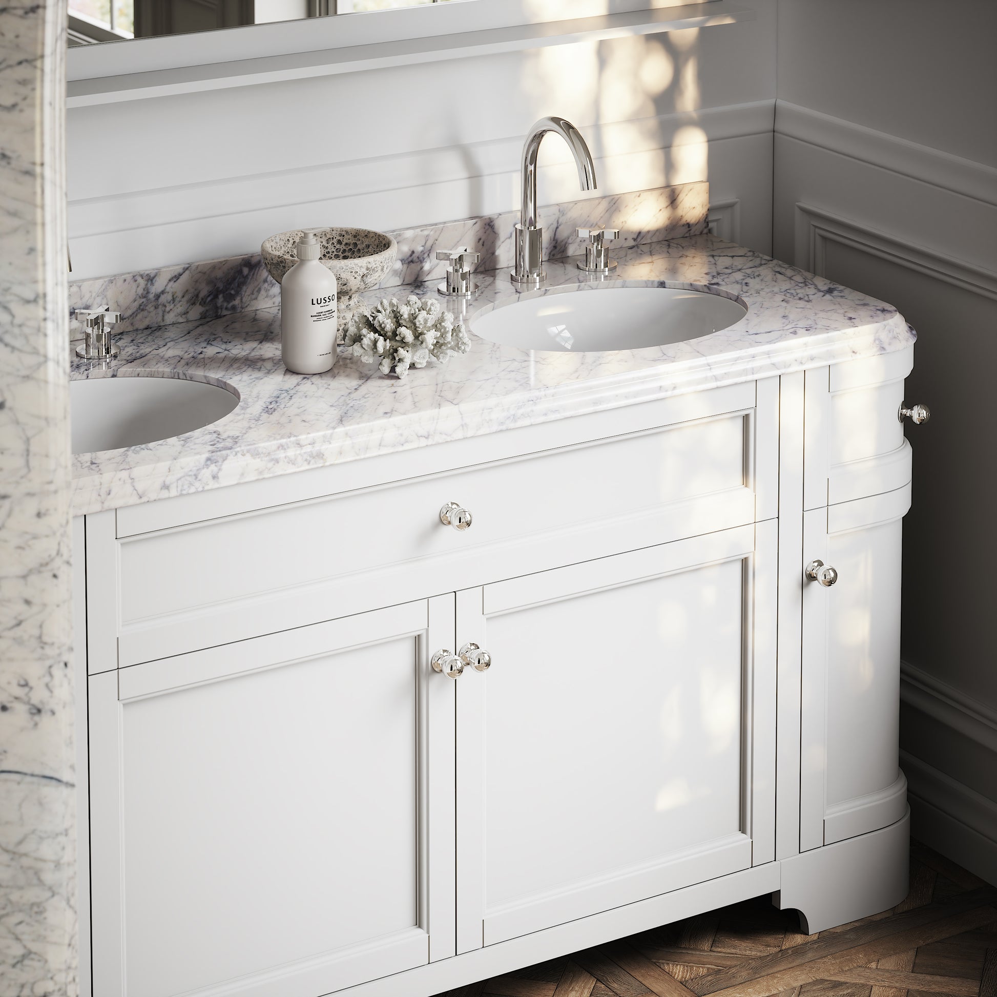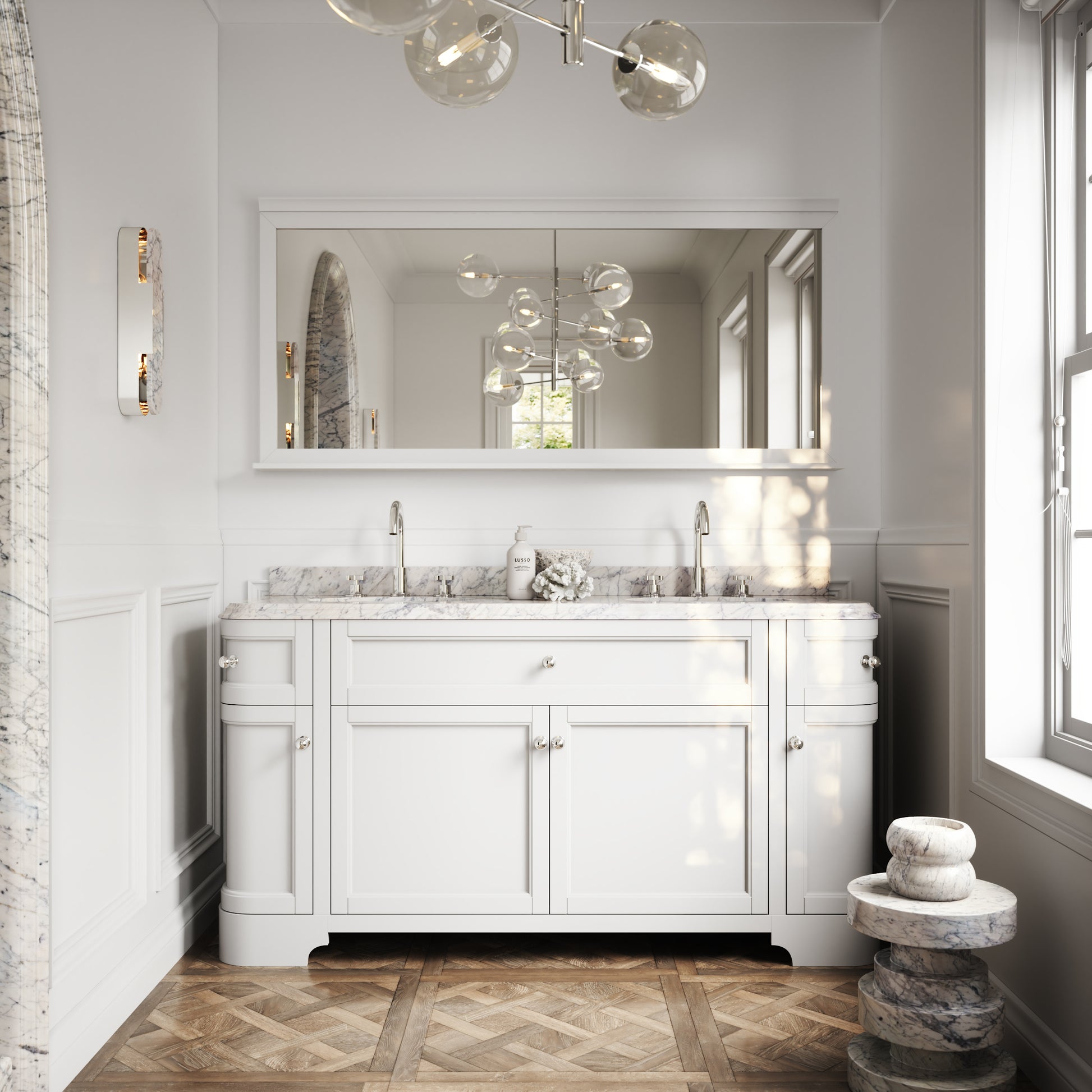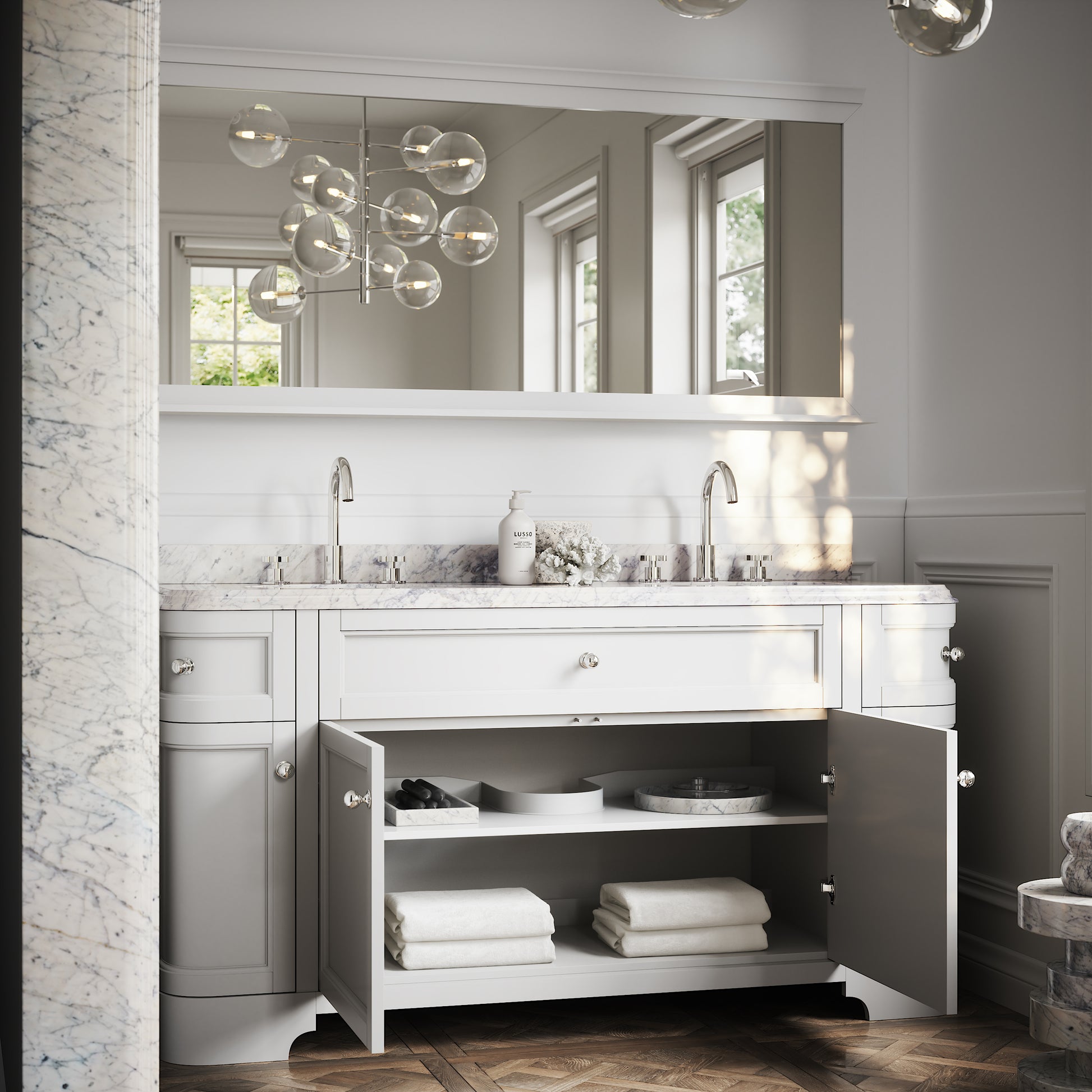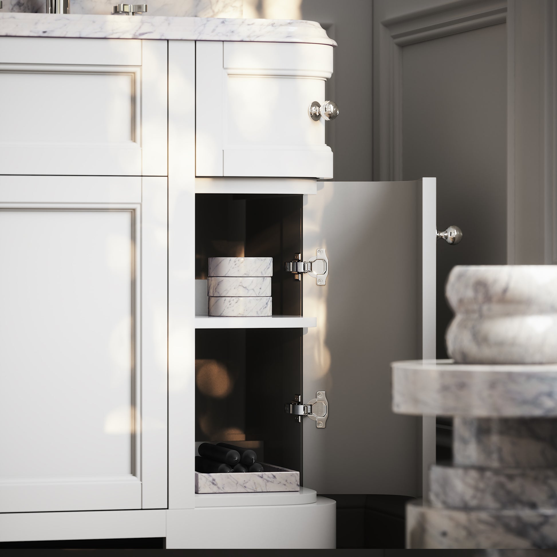 The Connaught Floorstanding Vanity Unit takes key notes from 1920s glamour, including beautiful cove ogee bevelling that’s displayed to the edges of the polished Carrara marble countertop. The countertop is finished with a traditional undermount oval basin.