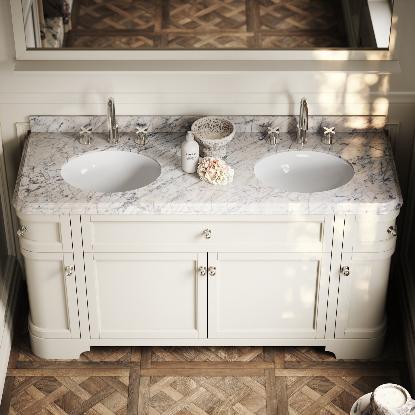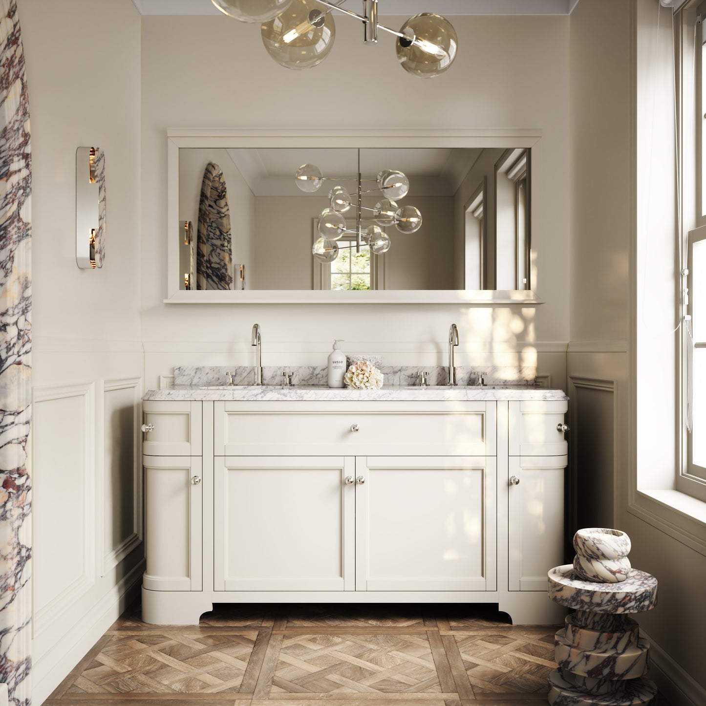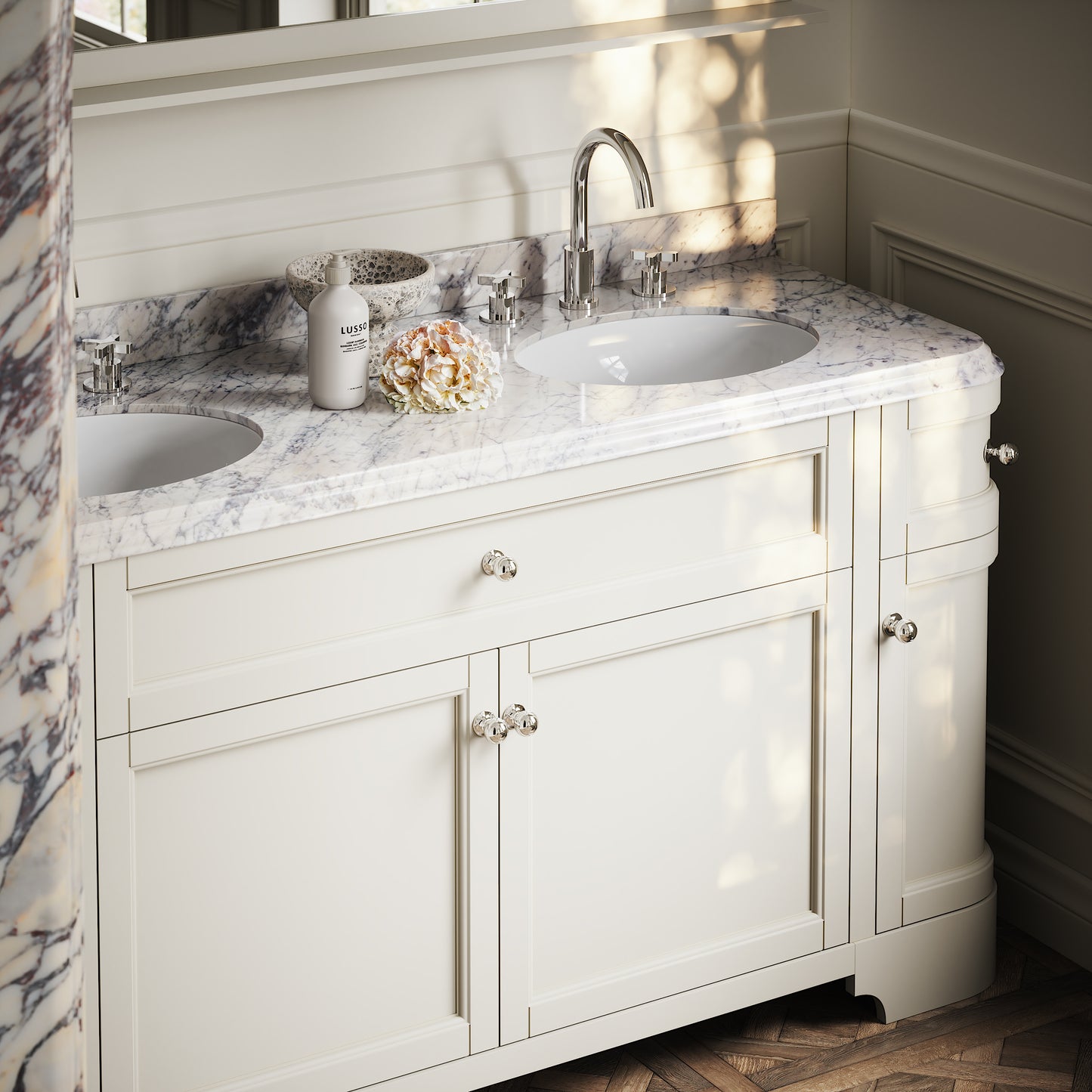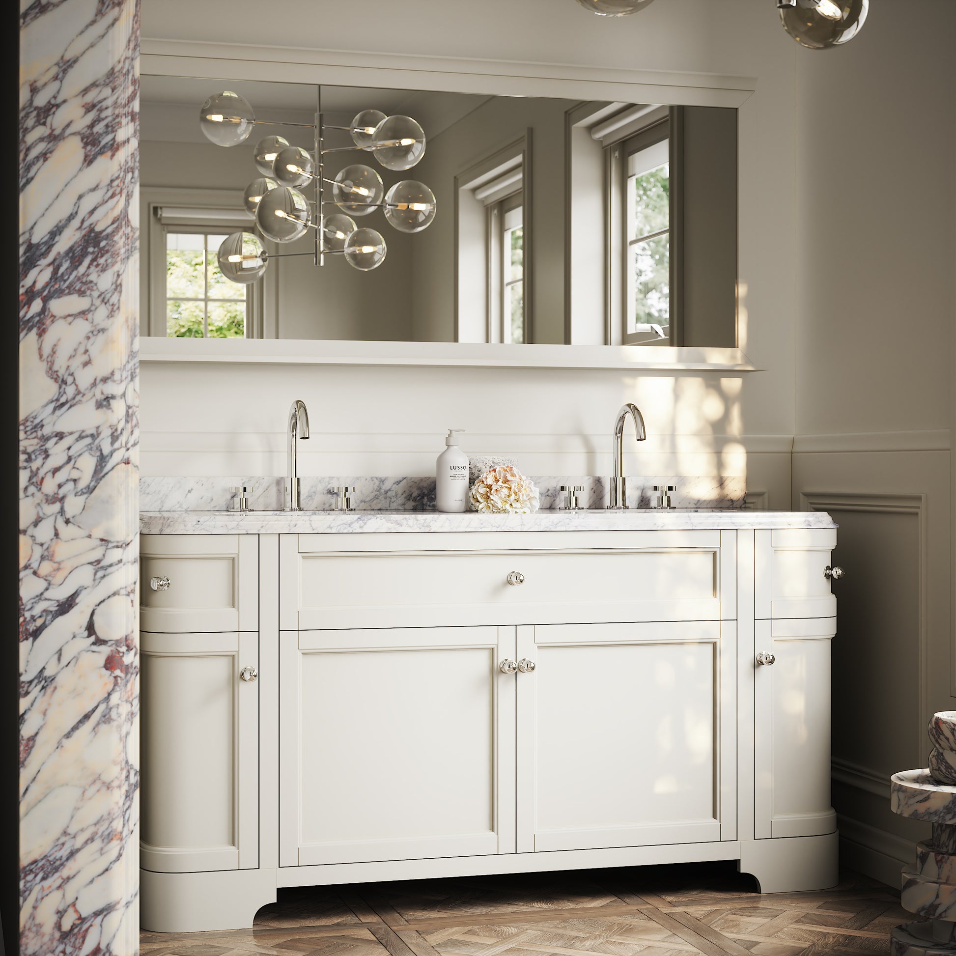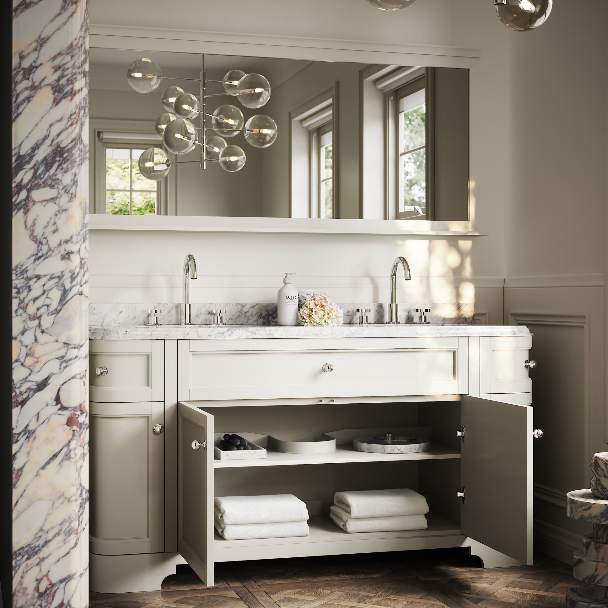 The Connaught Floorstanding Vanity Unit takes key notes from 1920s glamour, including beautiful cove ogee bevelling that’s displayed to the edges of the polished Carrara marble countertop. The countertop is finished with a traditional undermount oval basin.