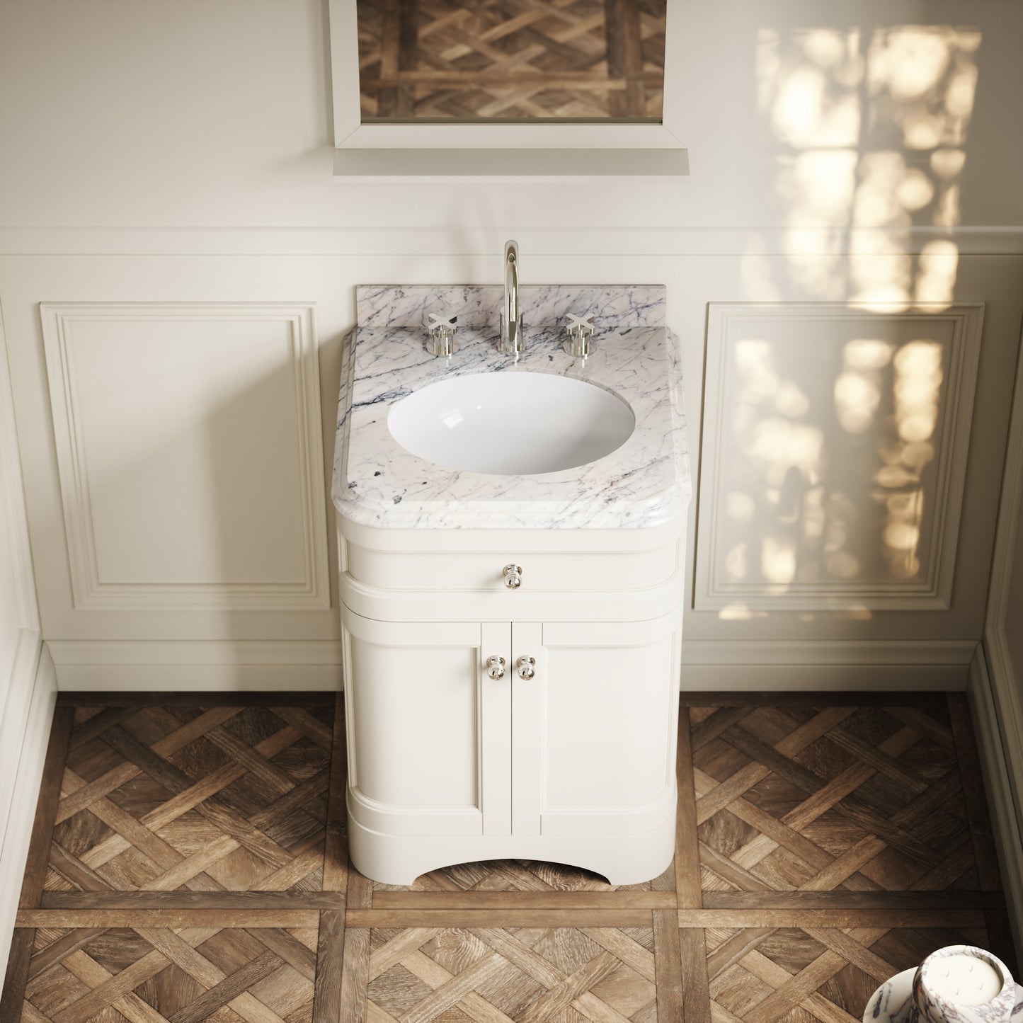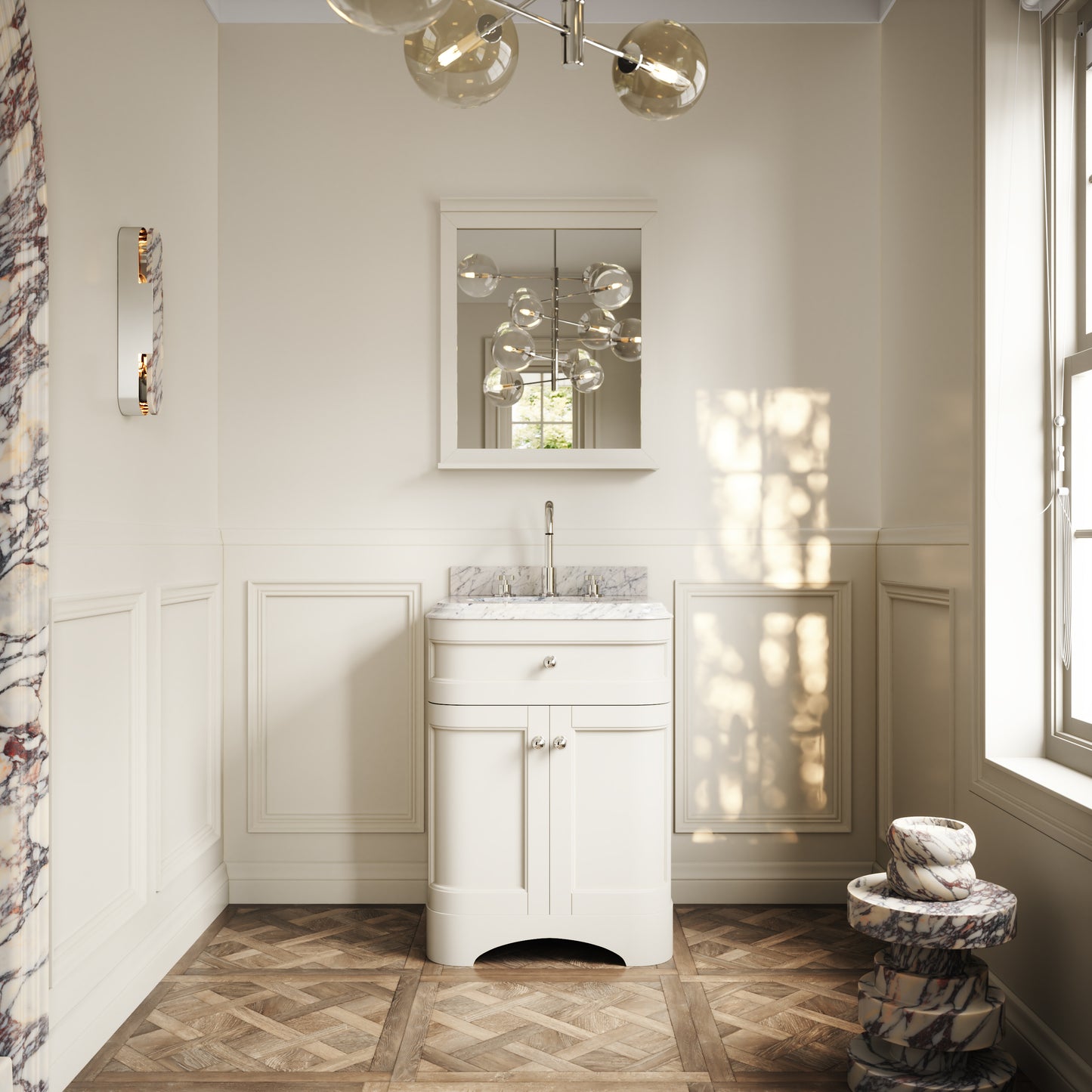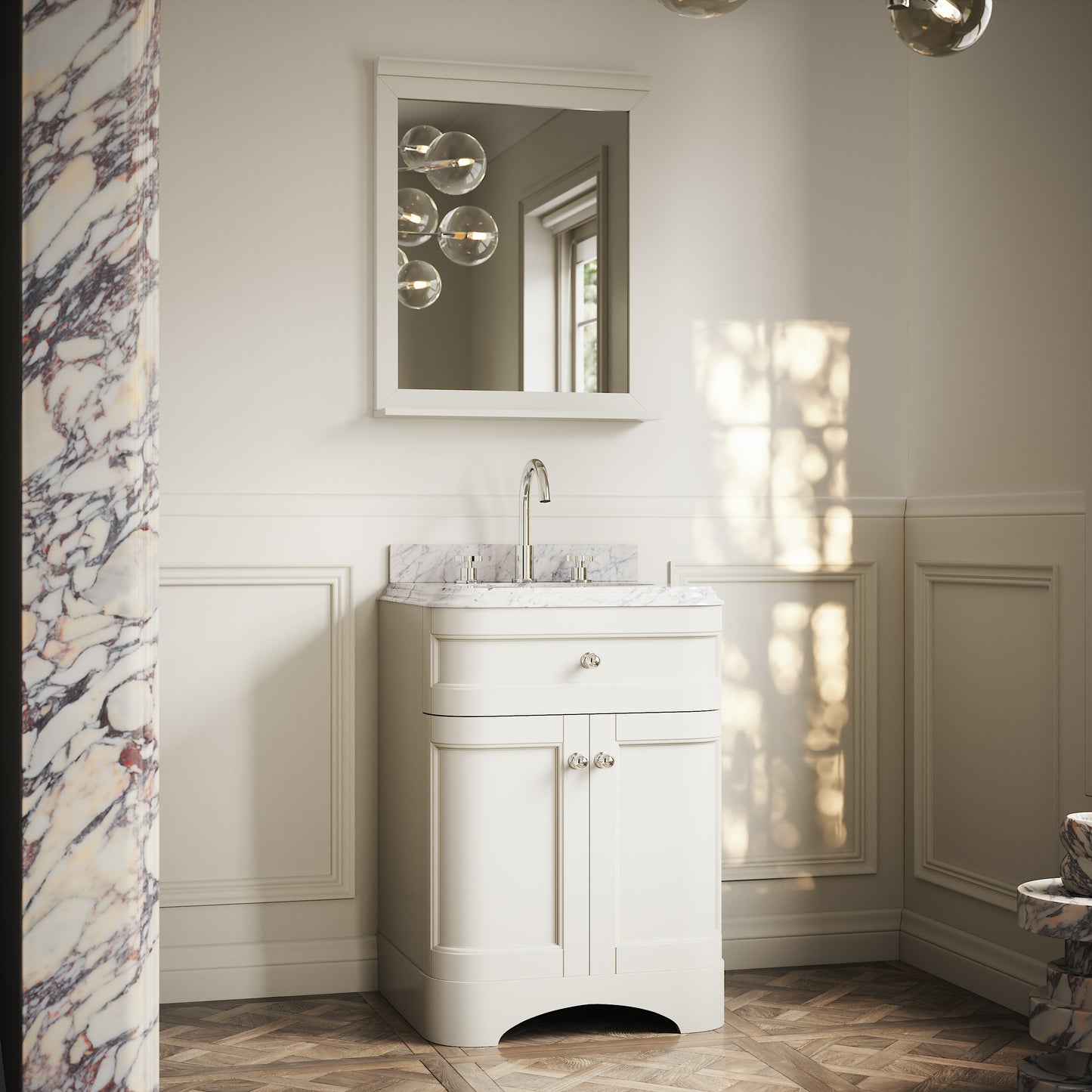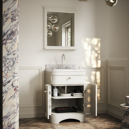 The Connaught Floorstanding Vanity Unit takes key notes from 1920s glamour, including beautiful cove ogee bevelling that’s displayed to the edges of the polished Carrara marble countertop. The countertop is finished with a traditional undermount oval basin.