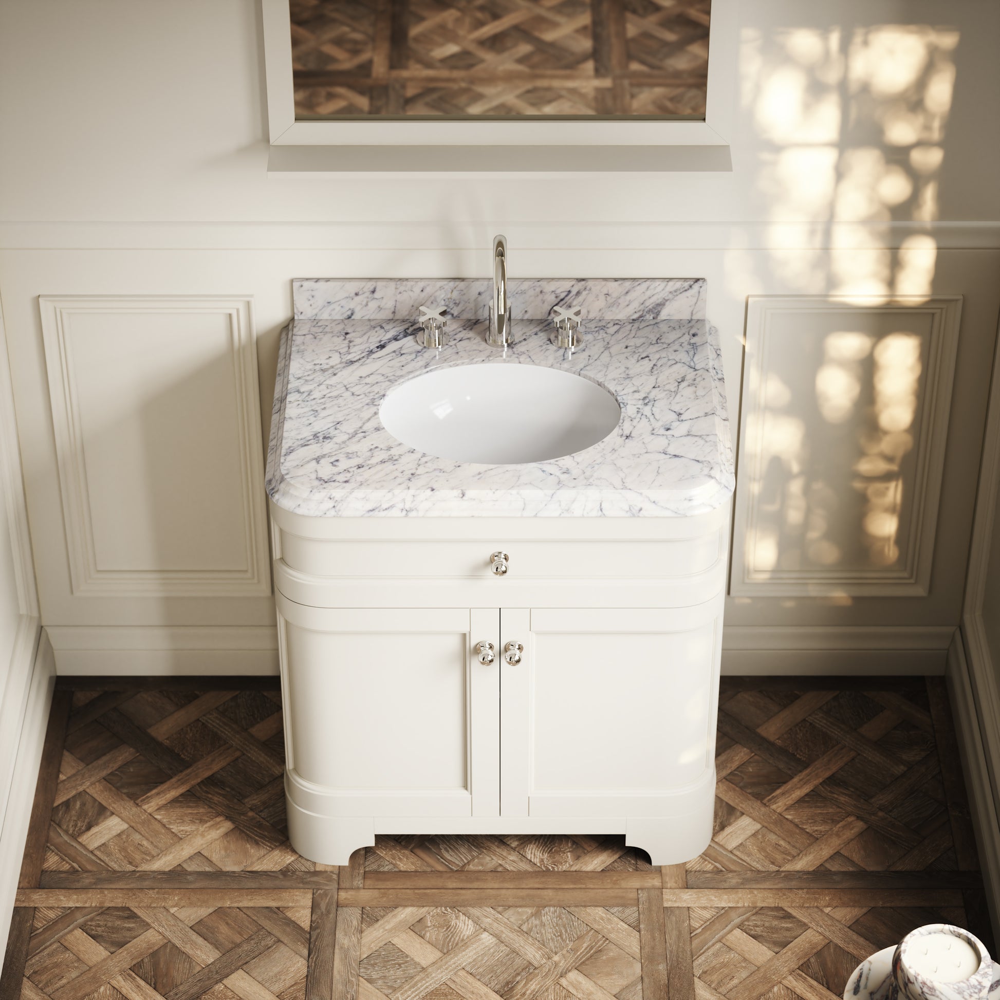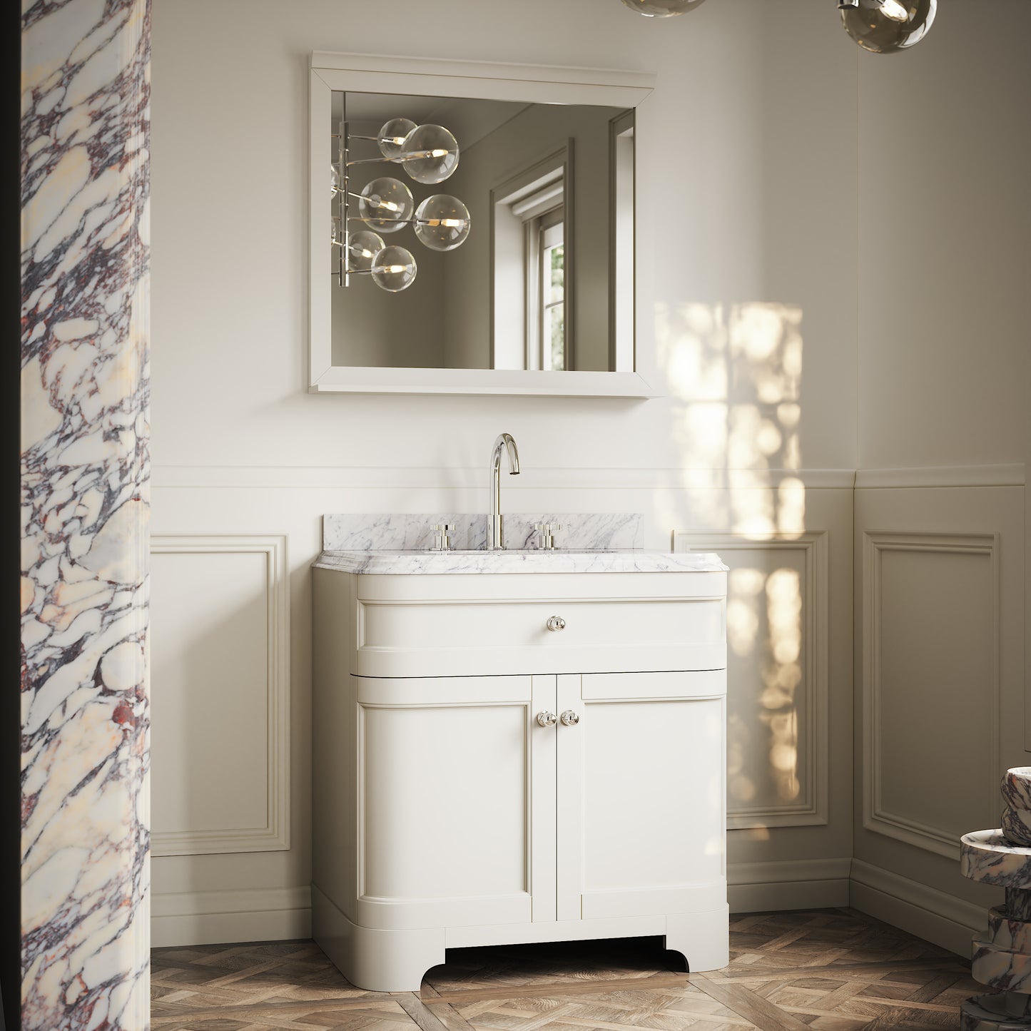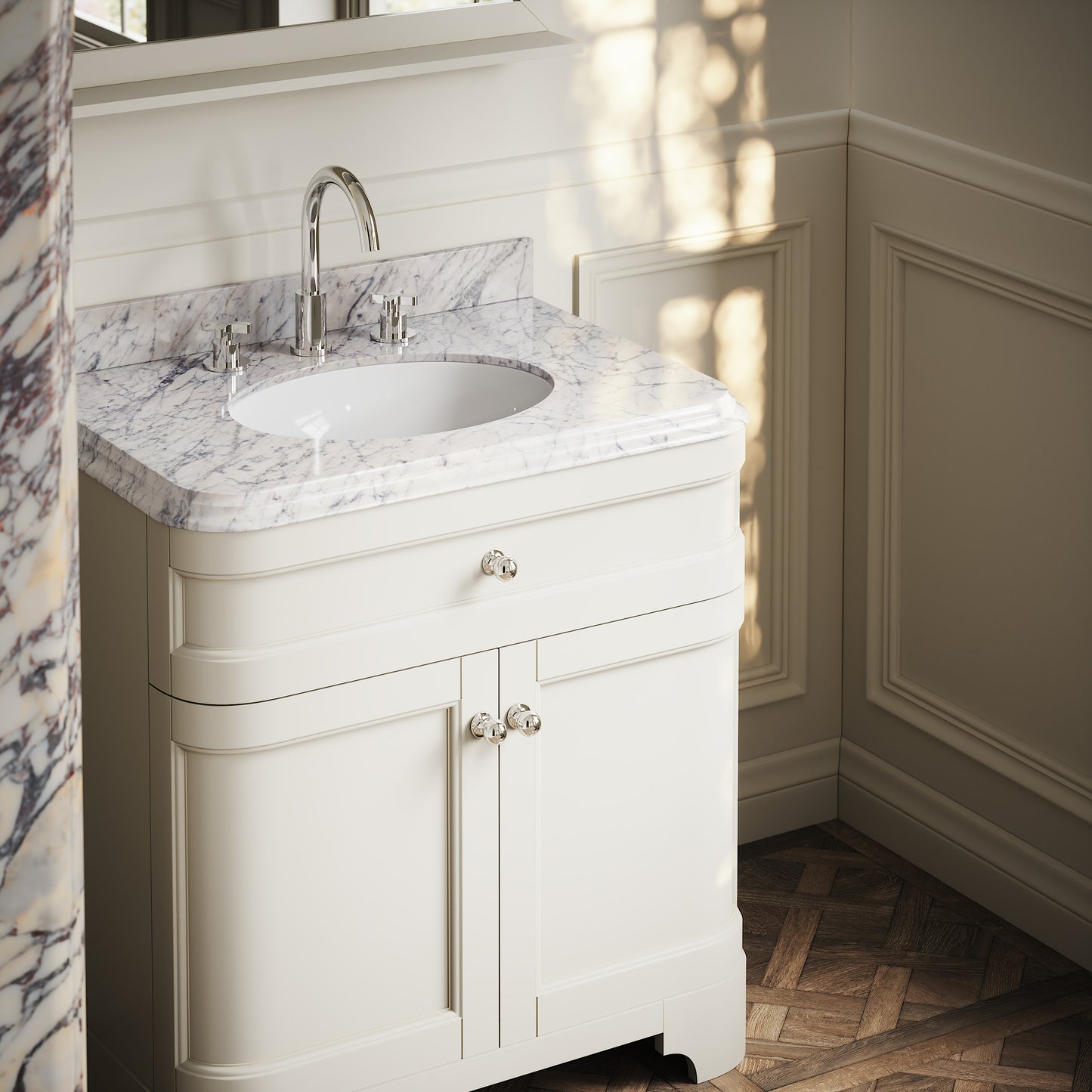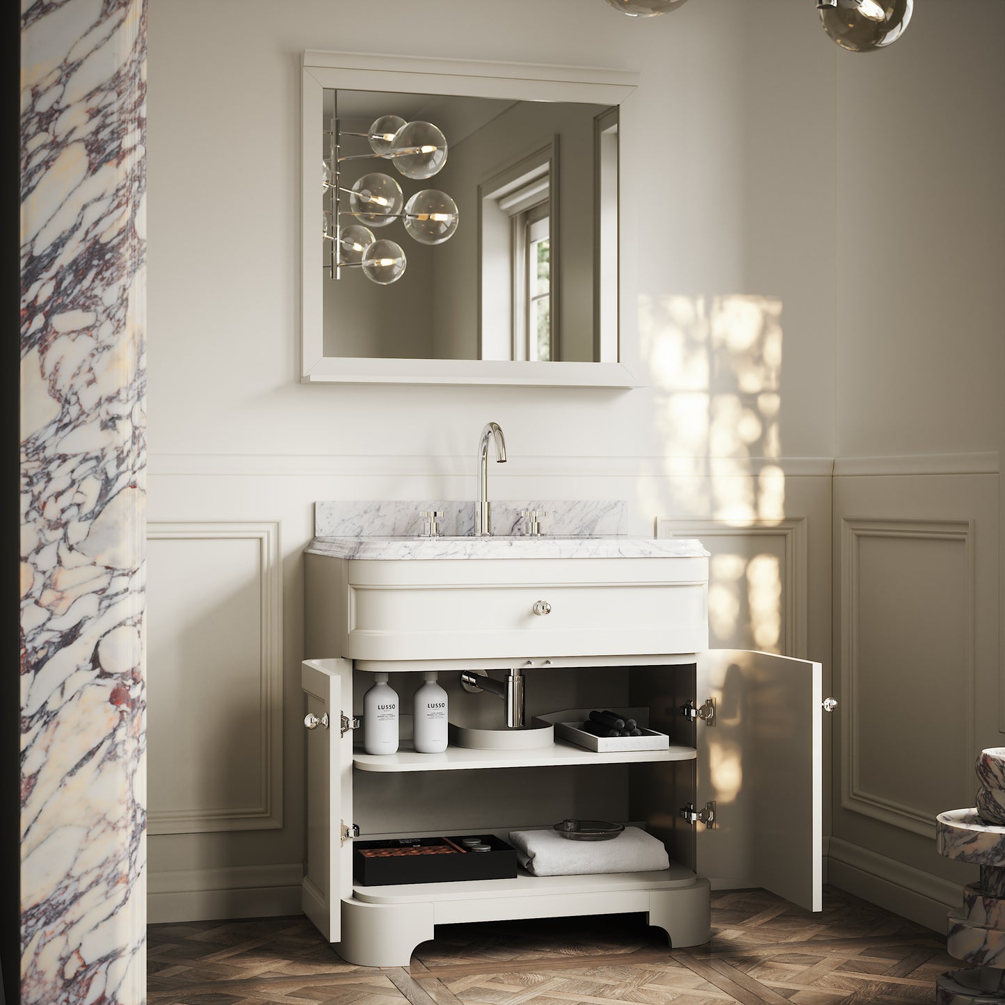 The Connaught Floorstanding Vanity Unit takes key notes from 1920s glamour, including beautiful cove ogee bevelling that’s displayed to the edges of the polished Carrara marble countertop. The countertop is finished with a traditional undermount oval basin.