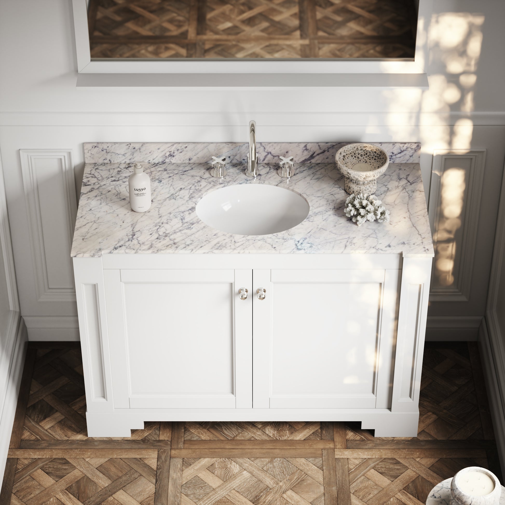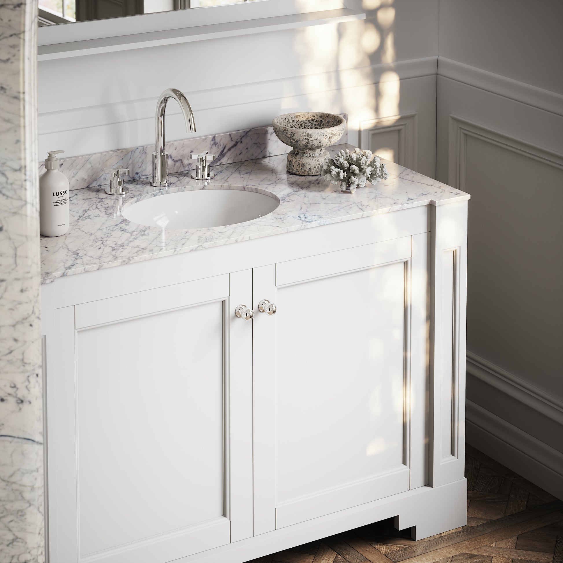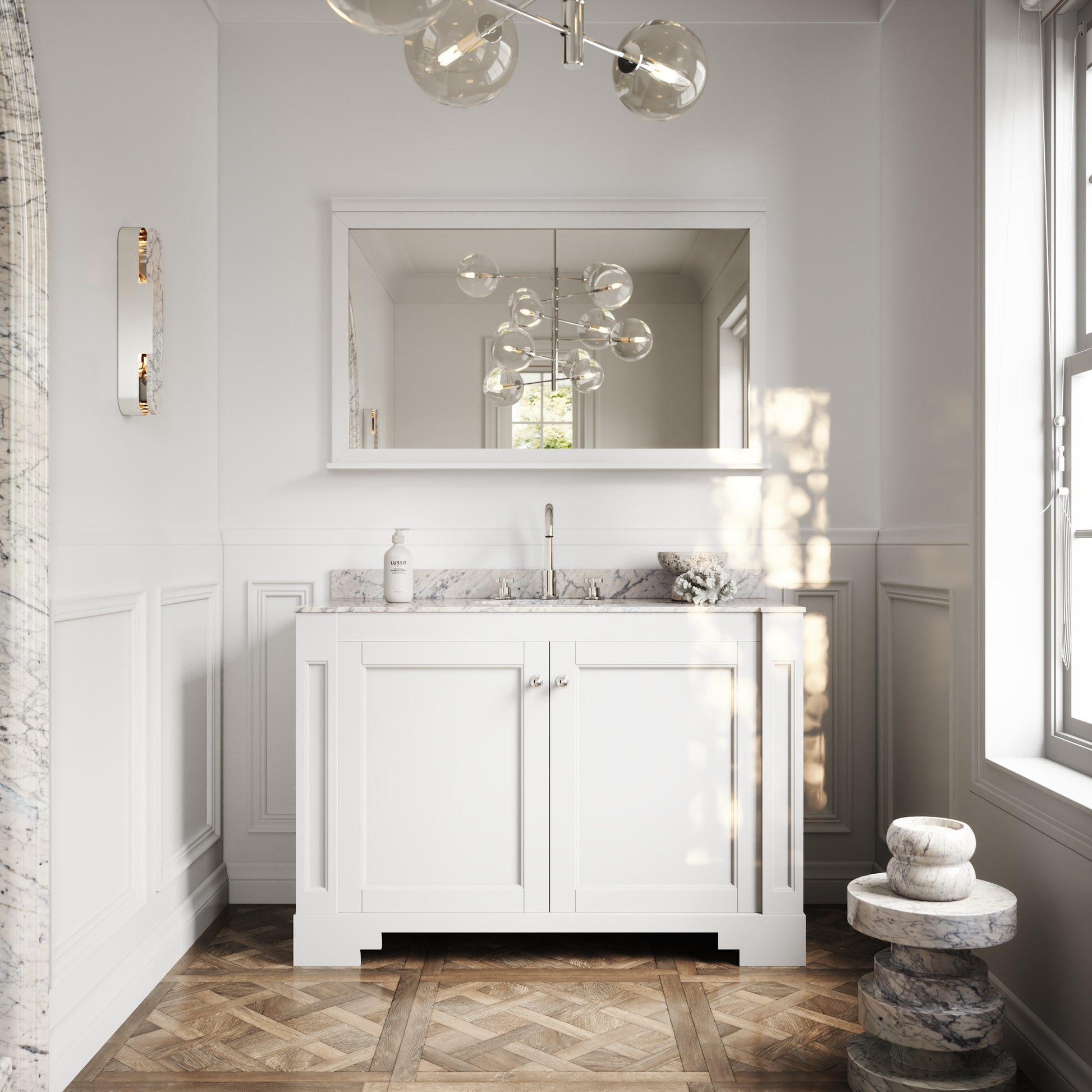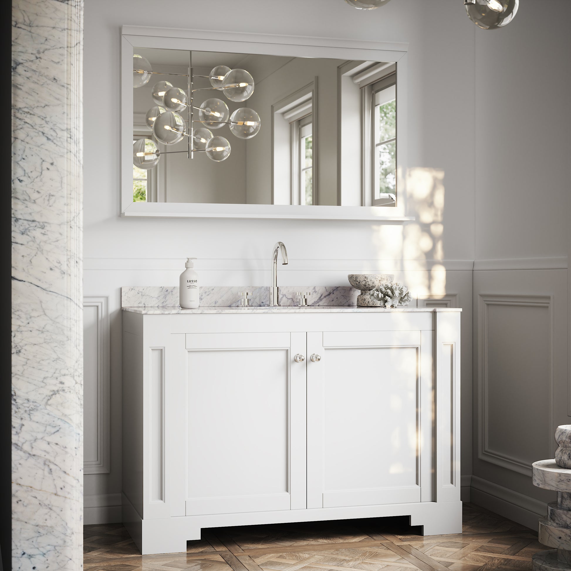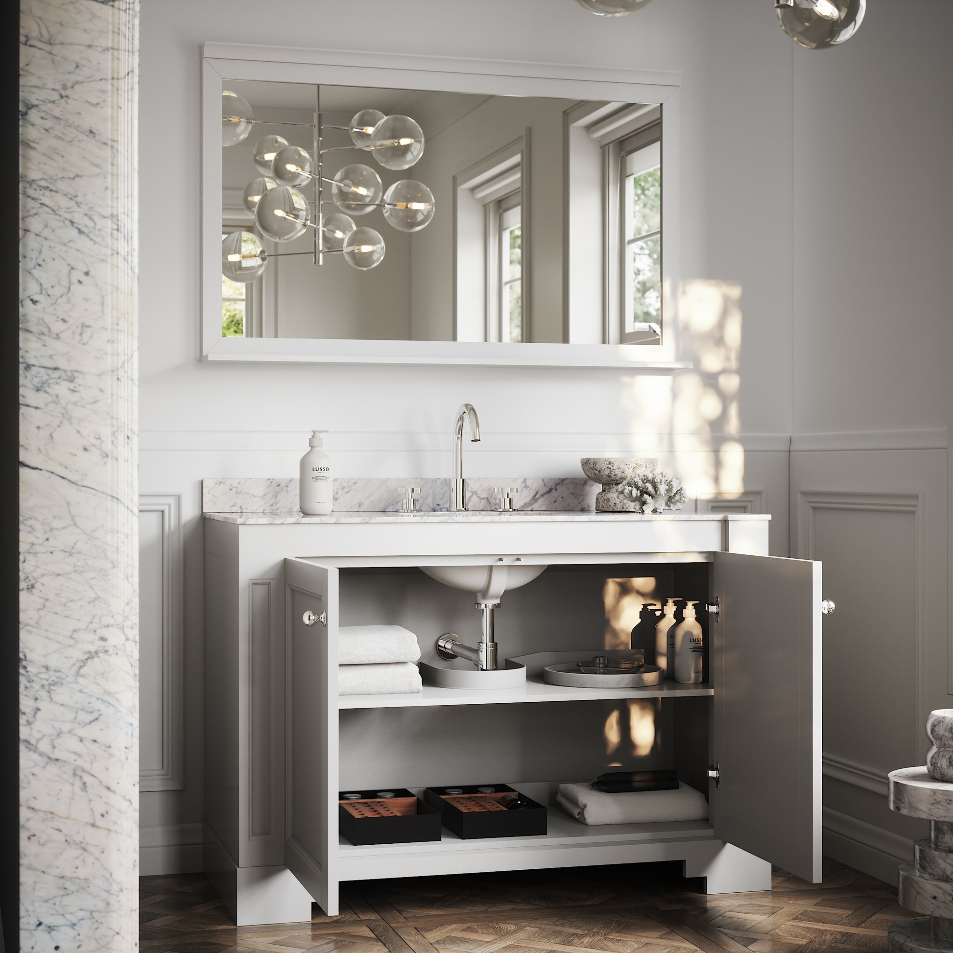 Accentuated by its strong angular corners and perfect use of symmetry, our Eaton Matte White Vanity Unit is a fitting homage to its glamorous Art Deco influence, seamlessly blended with the contemporary style and unmatched craftsmanship of Lusso.