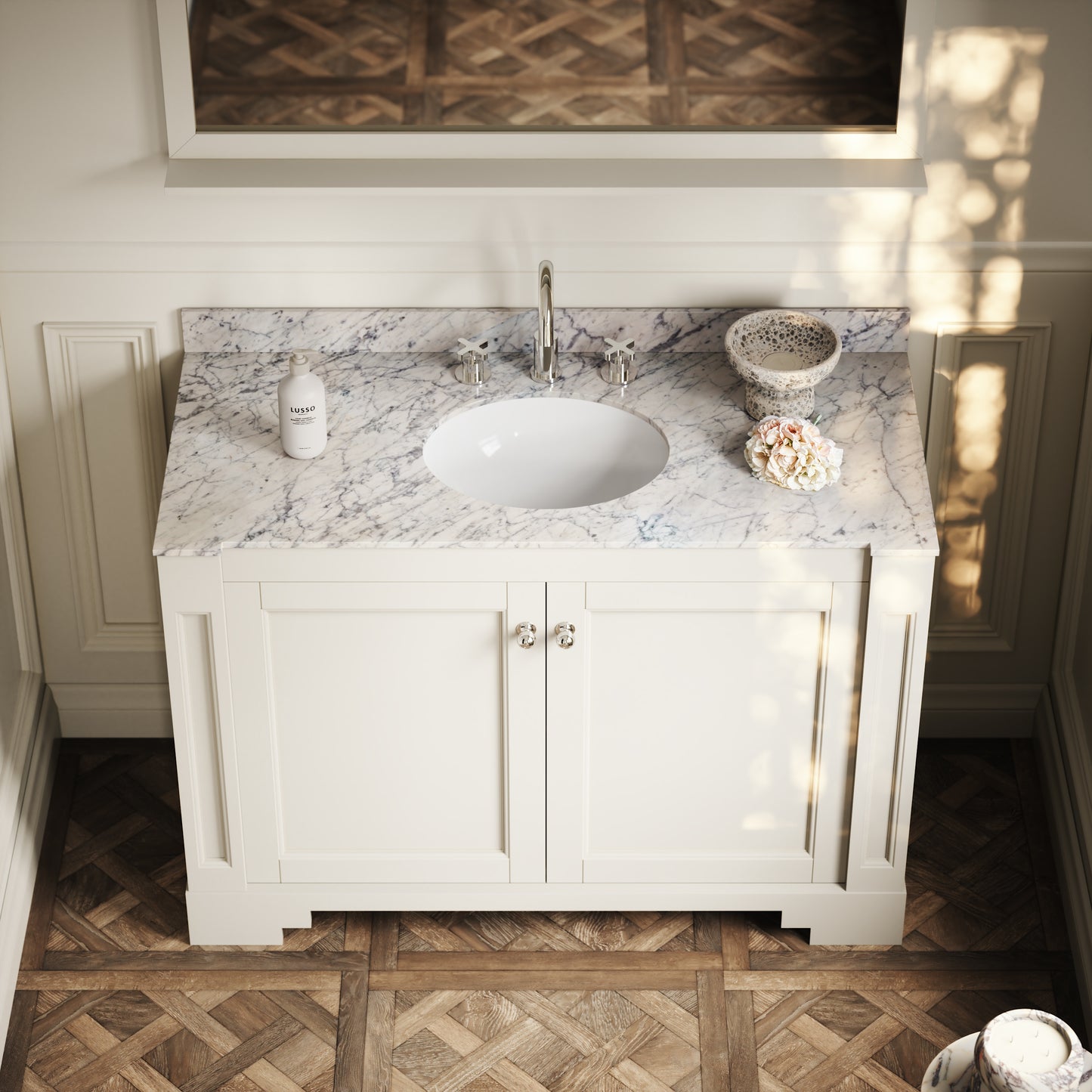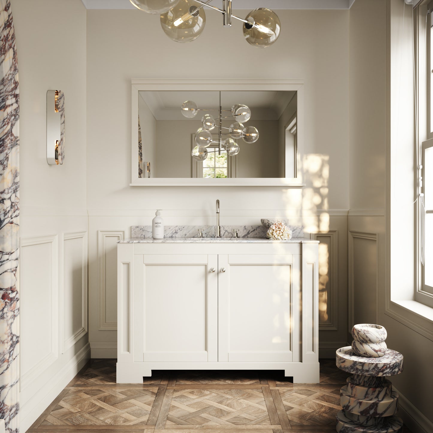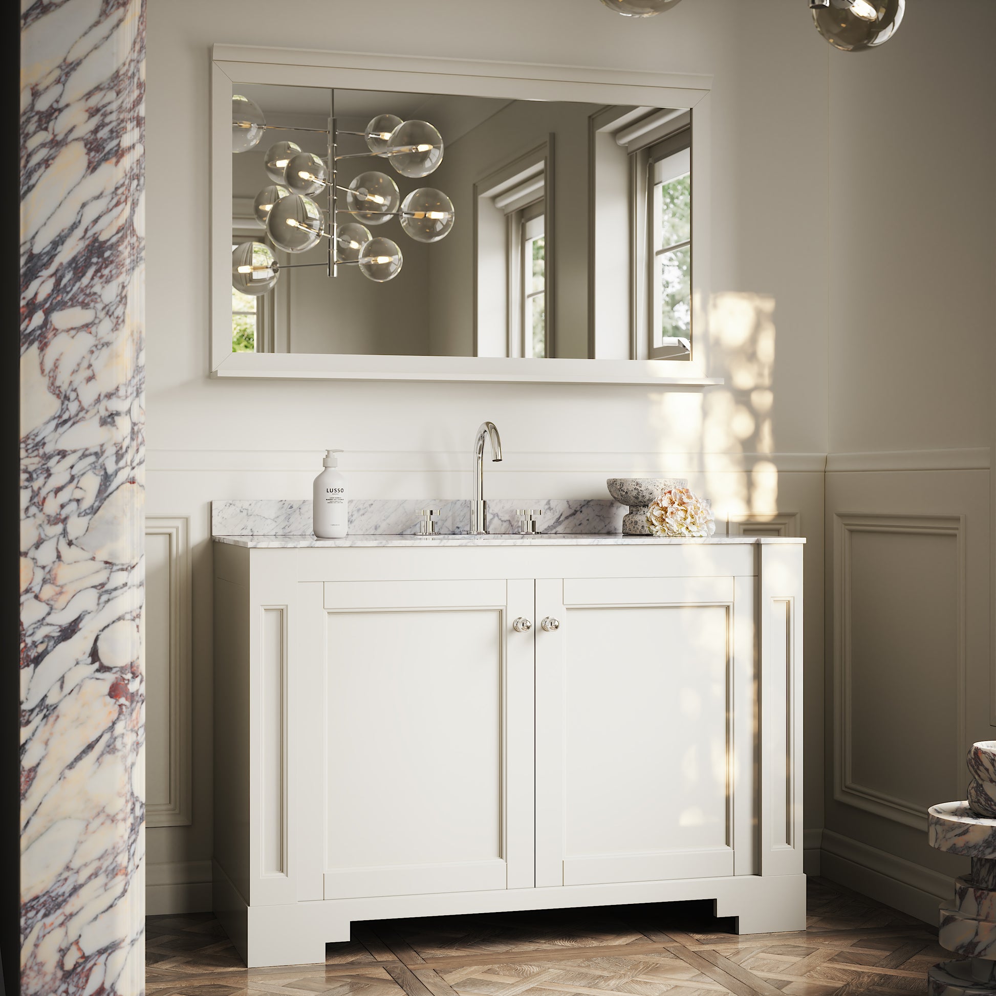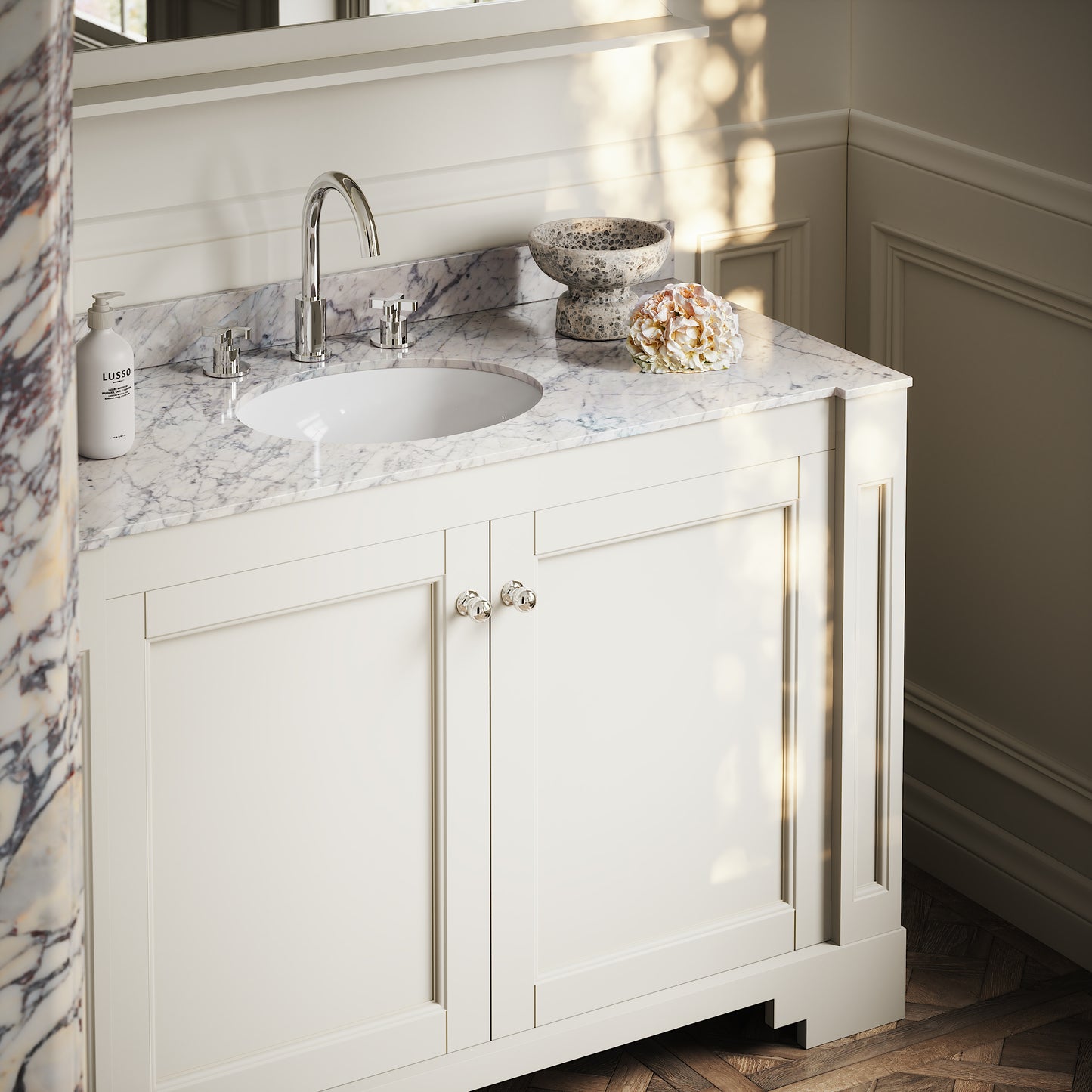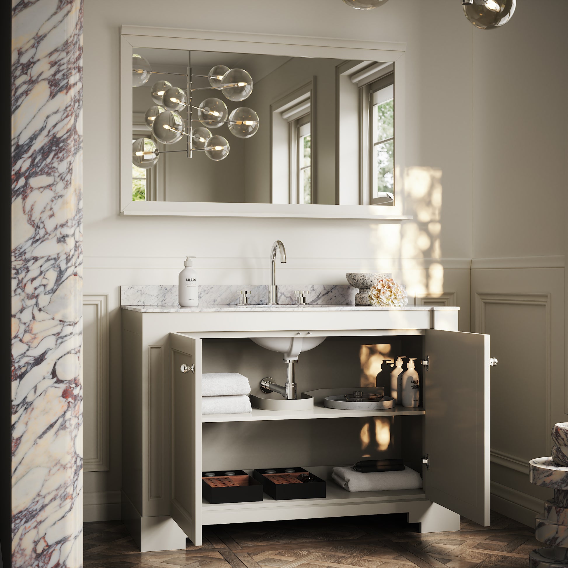 The Eaton Vanity Unit features a built-in oval ceramic basin to the countertop, surrounded by the unique waves of the polished Carrara marble. This, alongside the beautiful symmetry, makes the Eaton a product of Art Deco beauty.