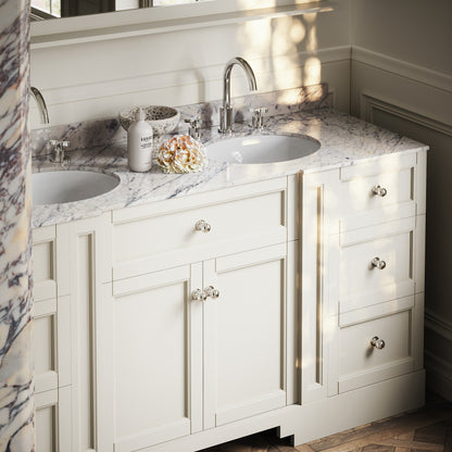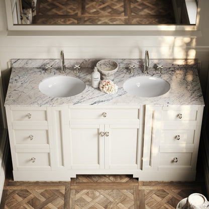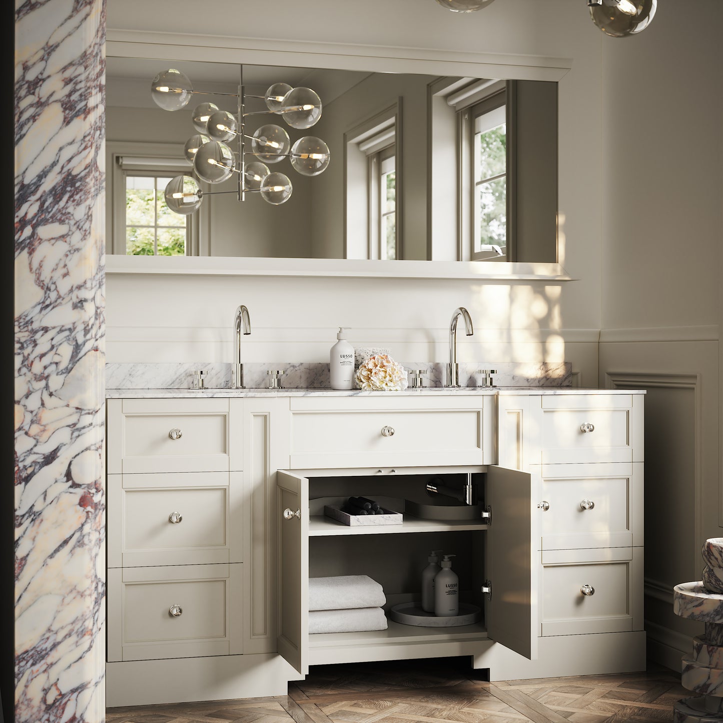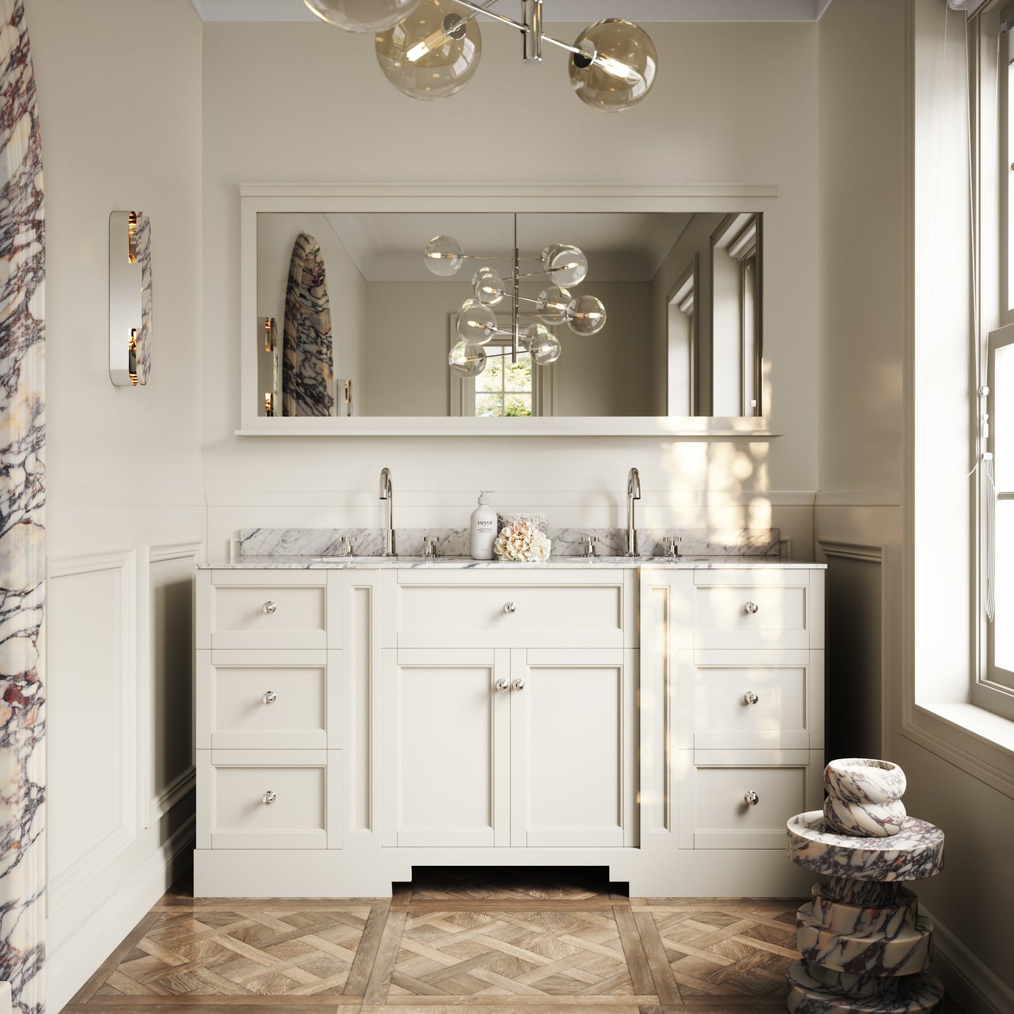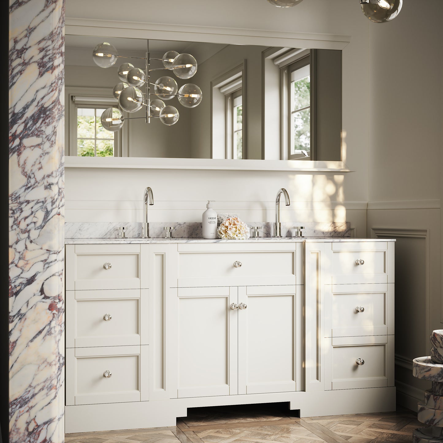 Crafted using marine grade plywood, the Eaton vanity unit is beautiful in both appearance and quality, and designed to resist moisture. The vanity unit is also crowned by beautiful polished Carrara marble surrounding two built-in basins - ideally suited for those renovating a master or double bathroom.