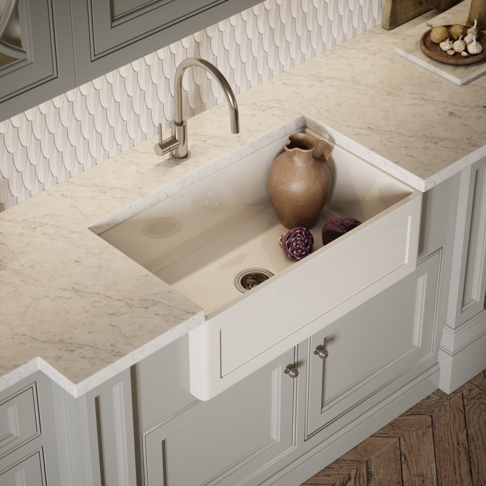 Perfect for farmhouse kitchens and traditional interiors, the spacious kitchen sink, at 800mm, is beautifully crafted and designed, featuring recessed panelling to enhance a traditional aesthetic. With a butler style and spacious inside, the sink offers generous spacing for cleaning dishes. It works beautifully when paired with a kitchen tap from the Lusso collection such as the Grantley, Claridge, or our signature Filtrata boiling water tap.