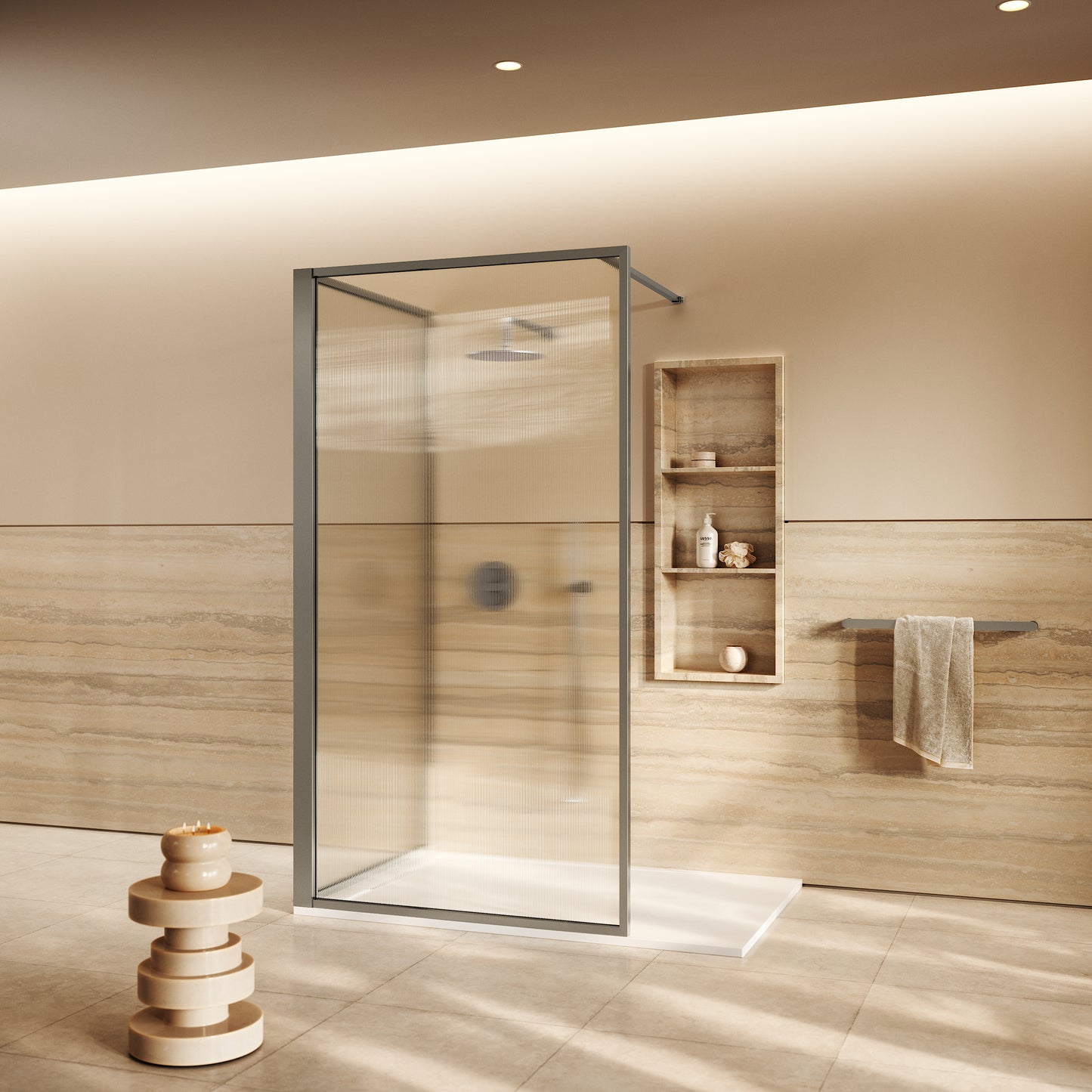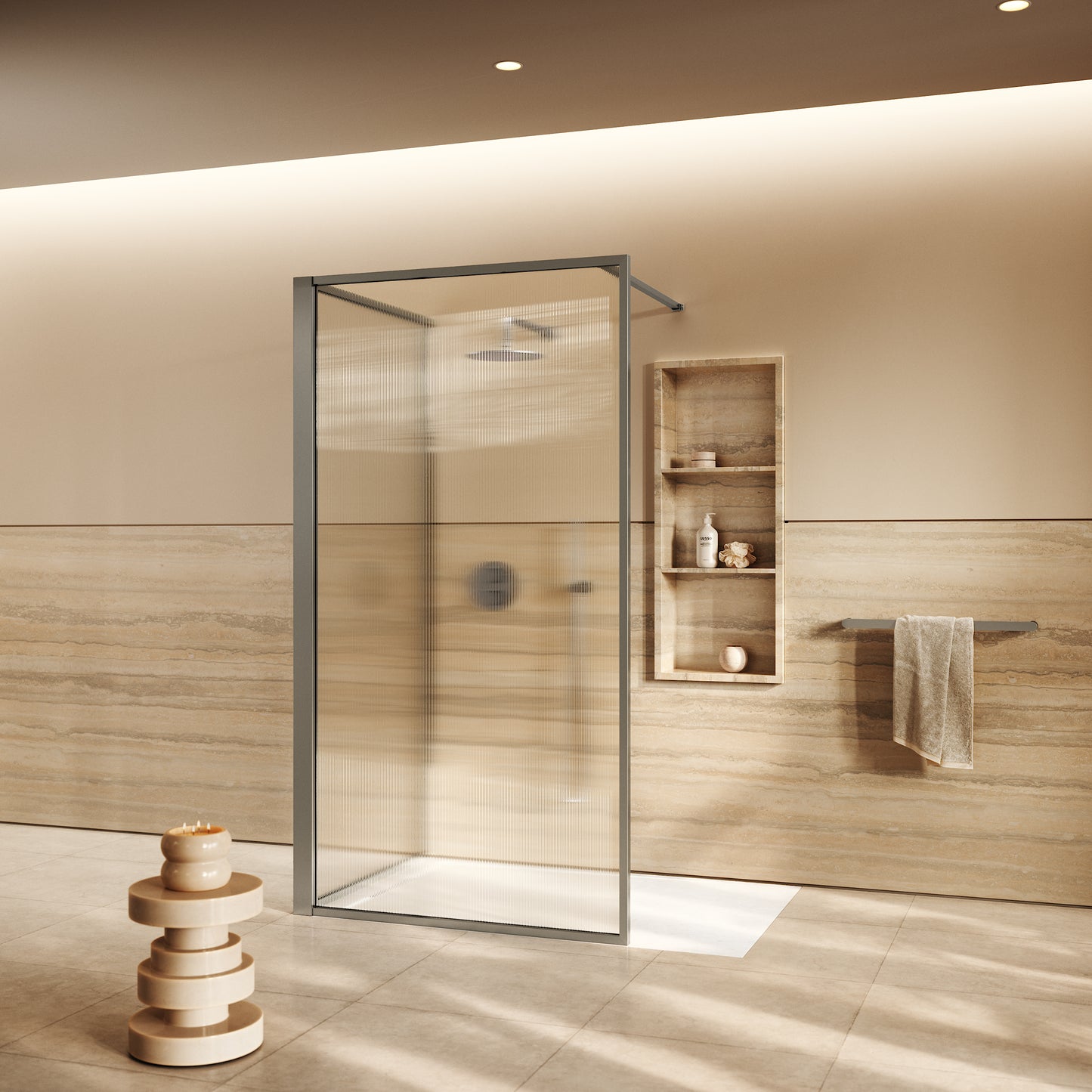 The Opulence Shower Enclosure Kit embodies timeless design and enduring luxury, perfectly suited to both elegant residential spaces and high-end hotel interiors. Crafted to the highest standards by our skilled craftsmen, this enclosure showcases two reeded glass panels, framed with our sleek brushed stainless finish to add sophistication to your interior. The result is a striking yet functional statement that blends refined aesthetics with reliable protection.