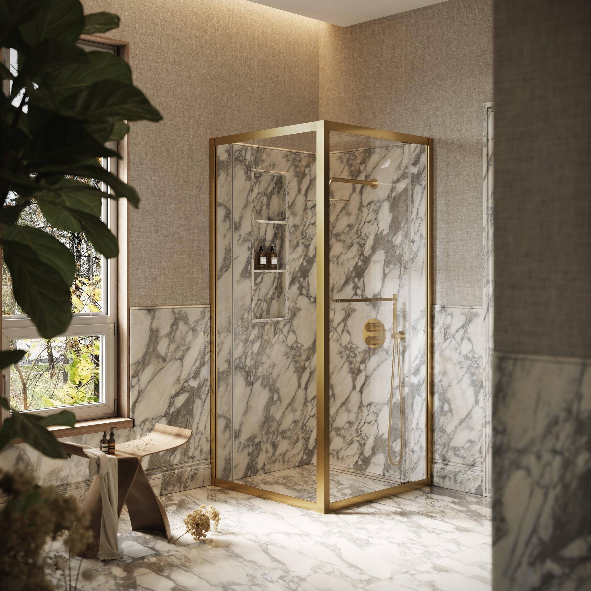 Radiating warmth and understated elegance, the Reve square shower enclosure in a spacious 900mm format evokes timeless luxury with a contemporary edge. Its balanced proportions create an inviting shower space, ideal for refined modern living.